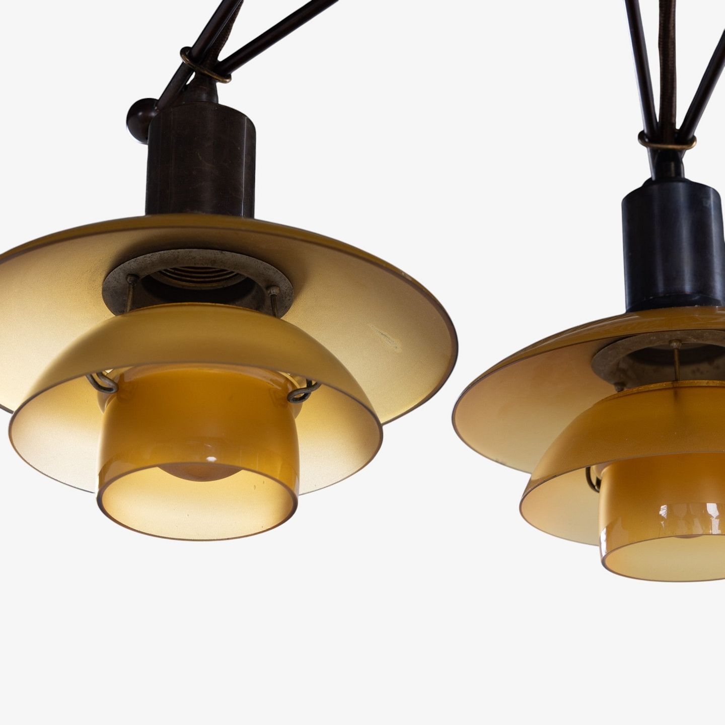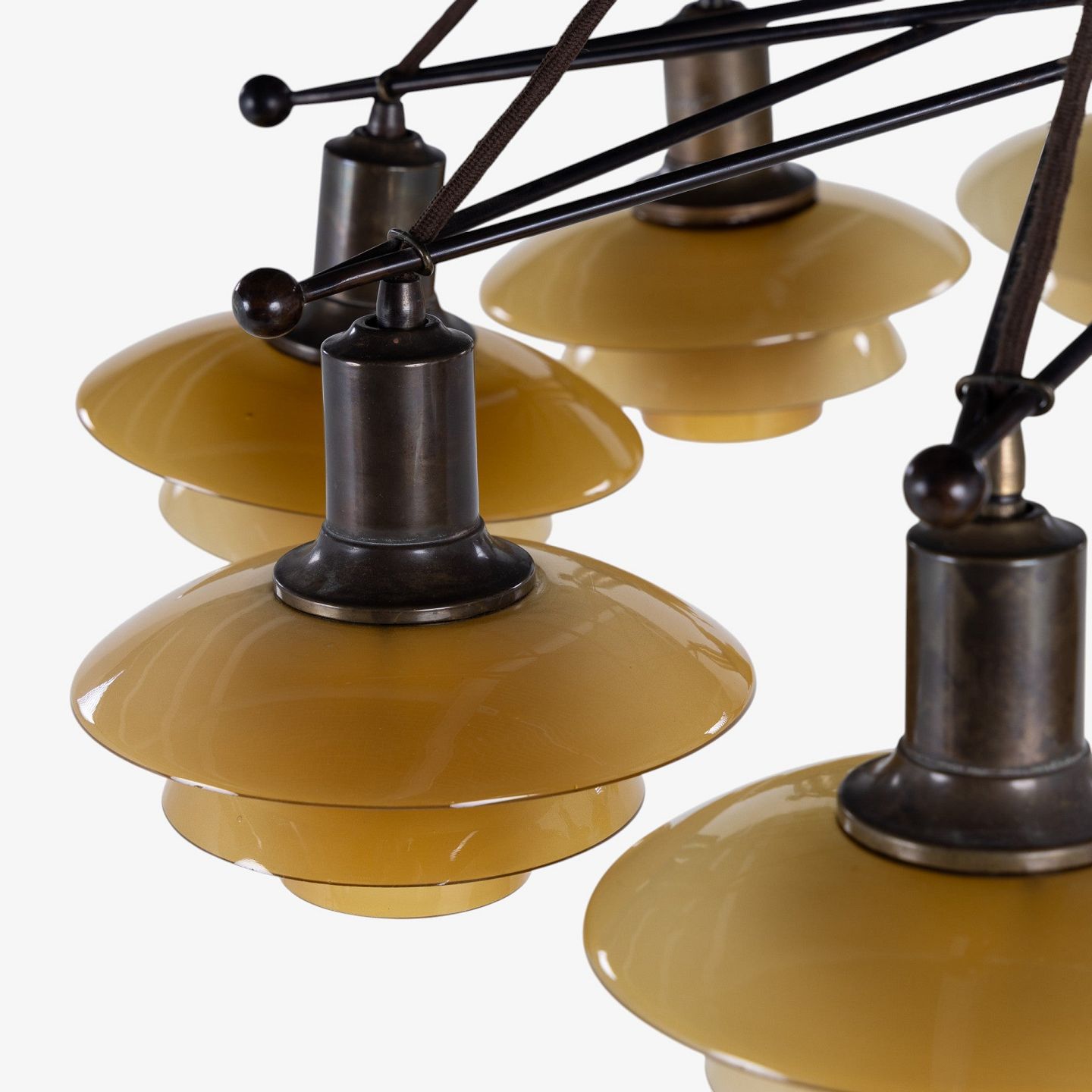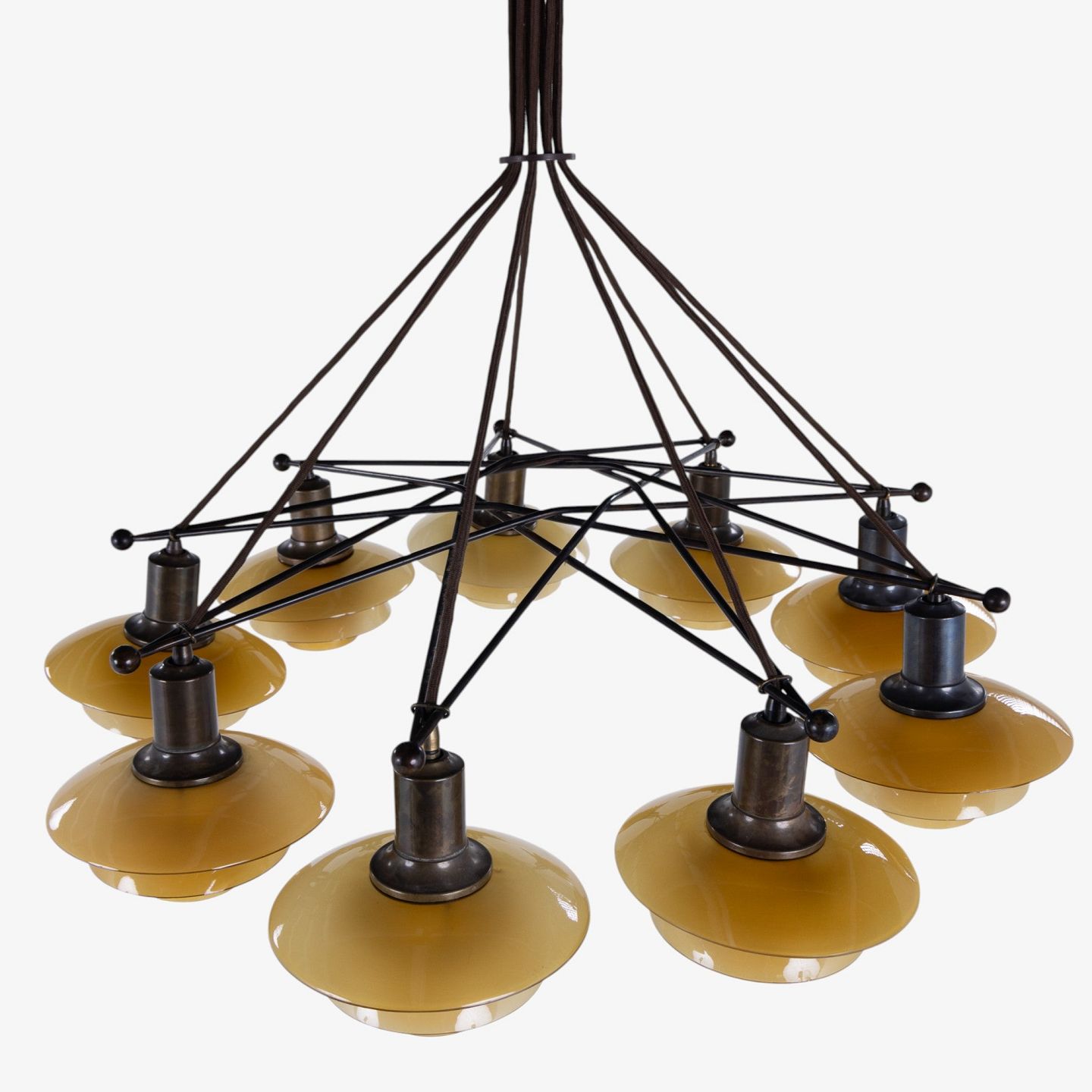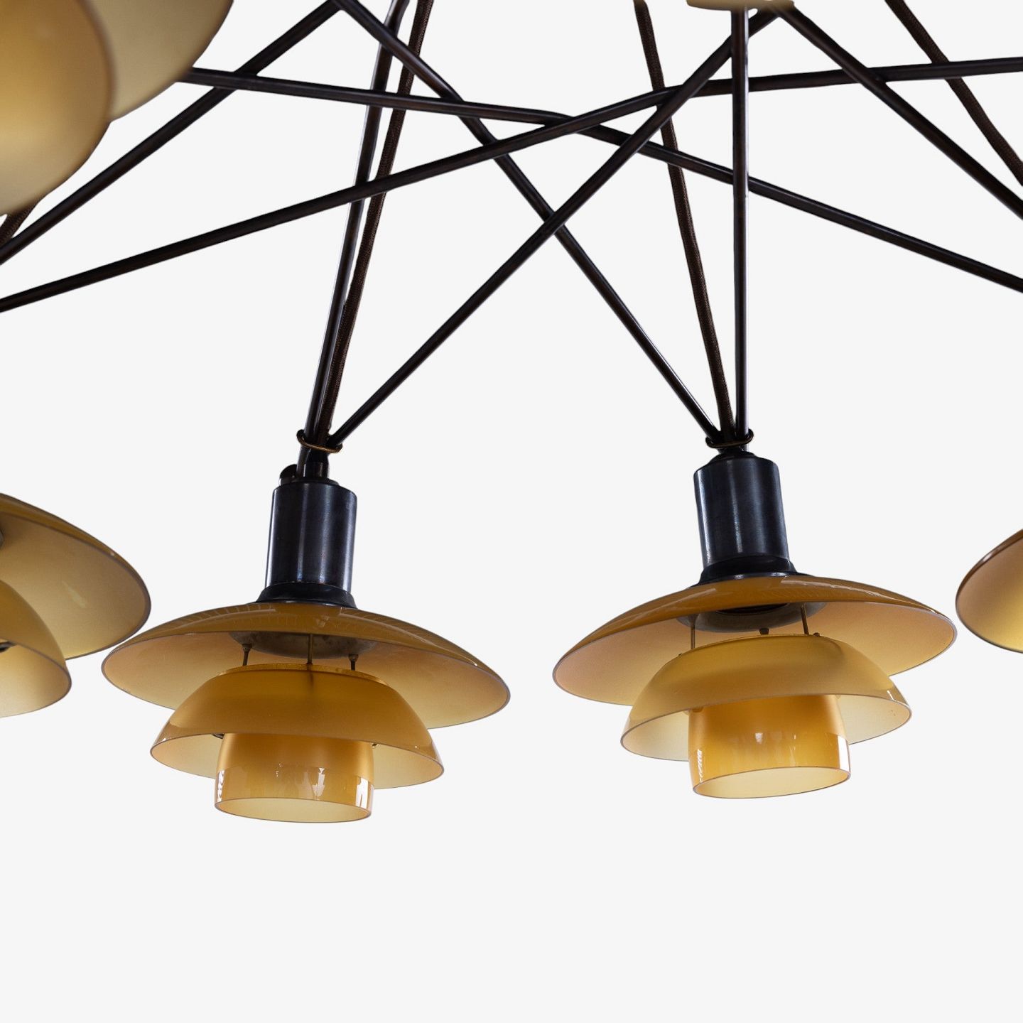 PH 2/2 - Sjælden 'Stjernekrone' i bruneret messing med skærme i ravfarvet glas. Stemplet 'Patented'.