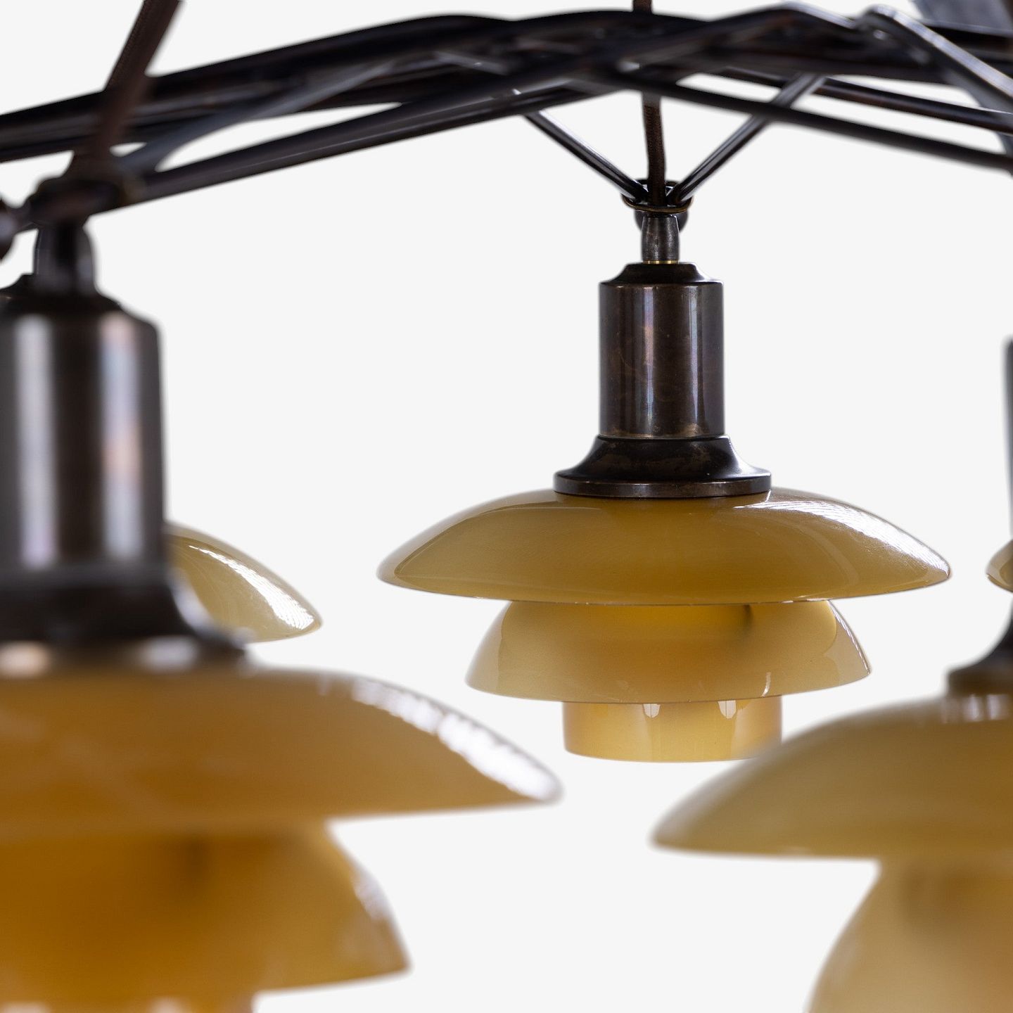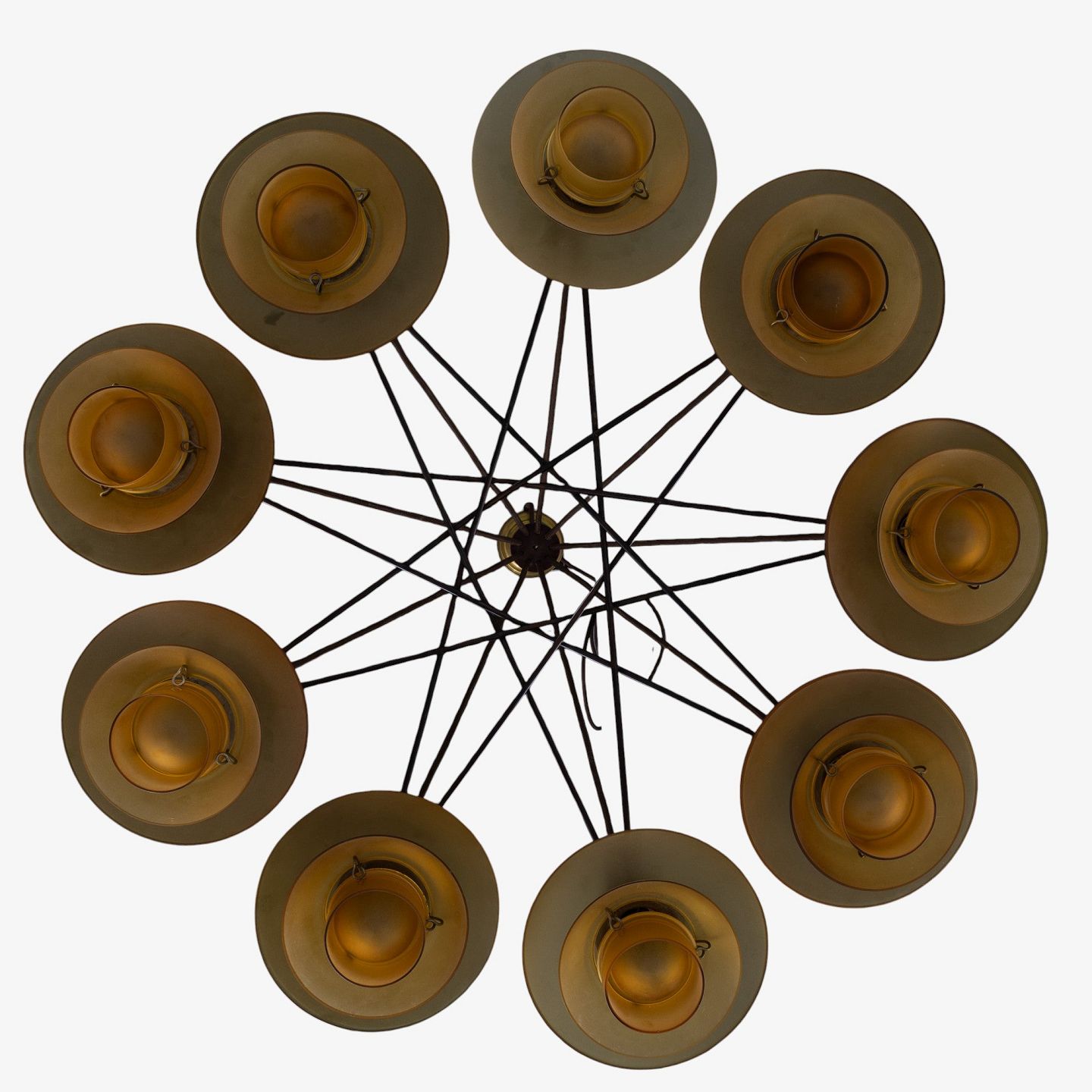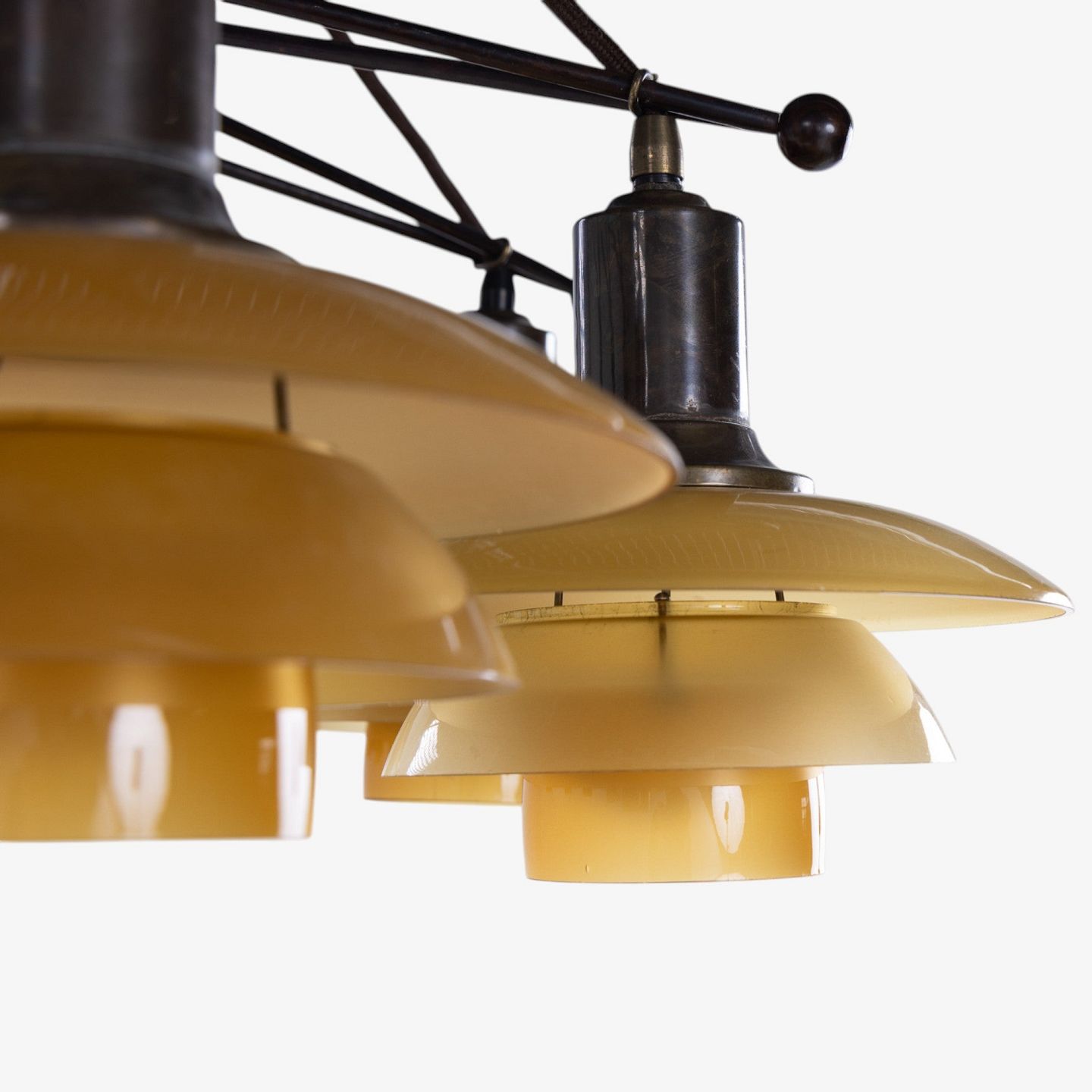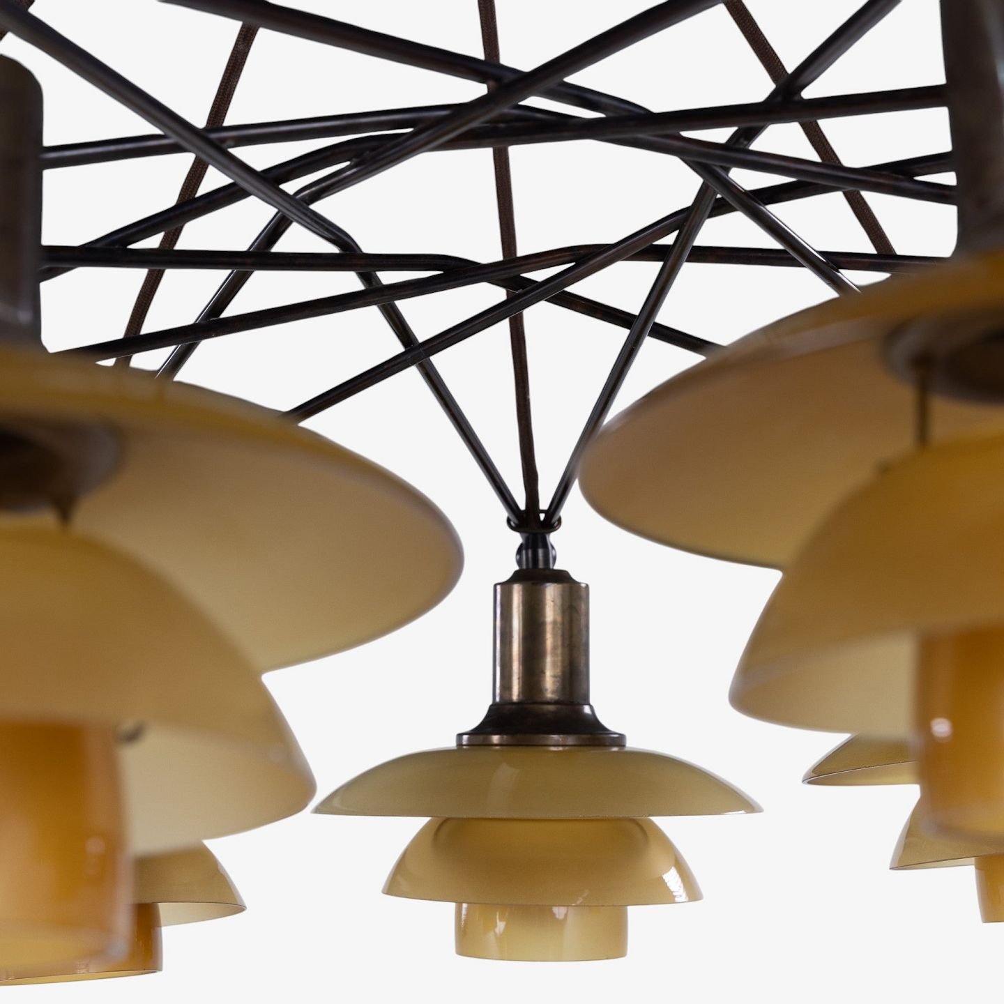 PH 2/2 - Sjælden 'Stjernekrone' i bruneret messing med skærme i ravfarvet glas. Stemplet 'Patented'.