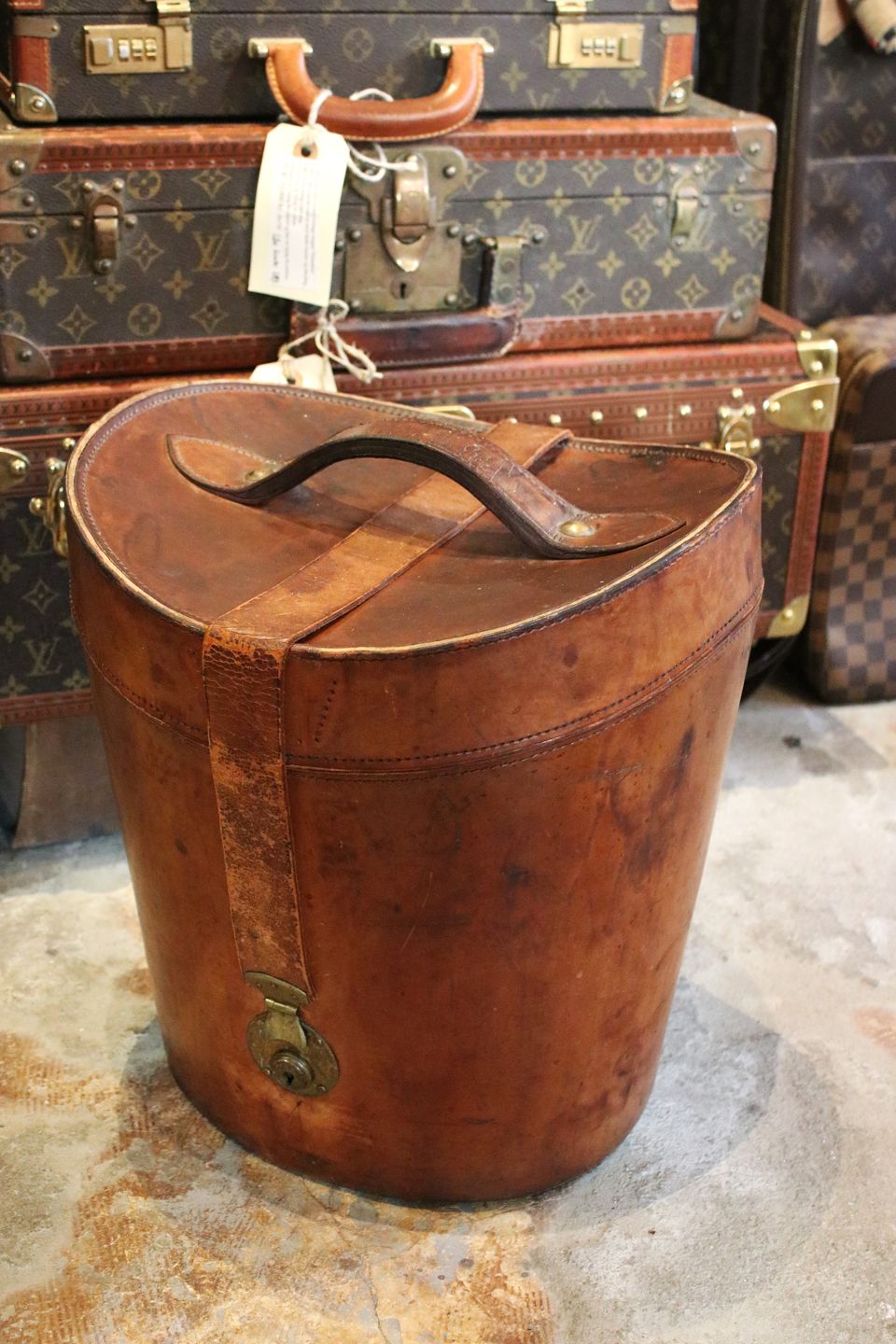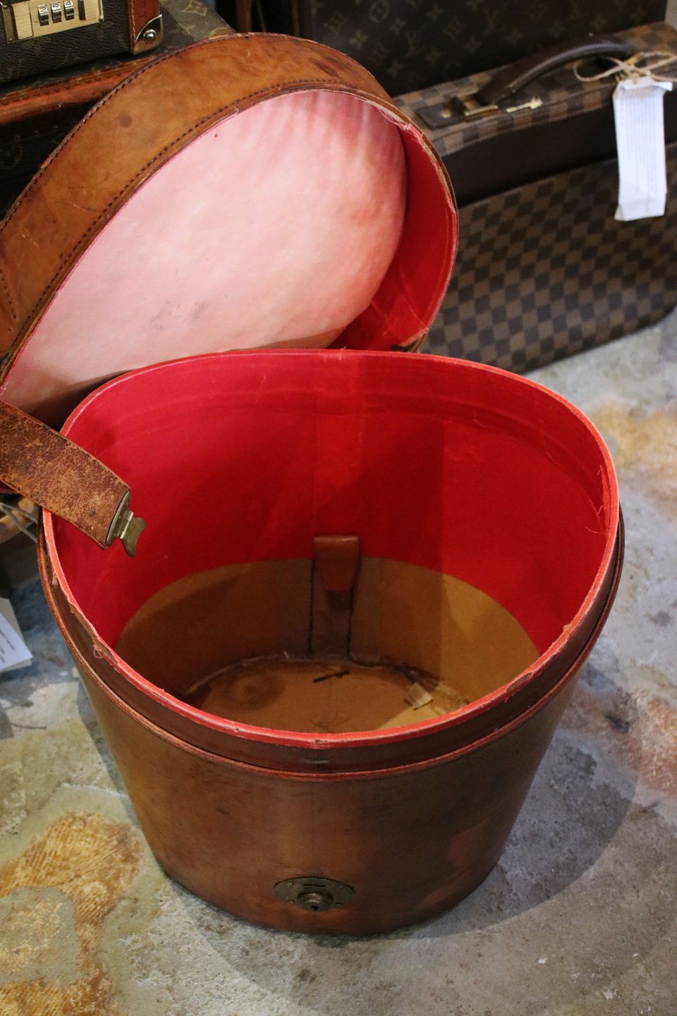 Dekorativ , gammel læder boks (gammel hatteæske) med en rigtig fin patina. Super fin til opbevaring. H: 38cm. 34x33cm.