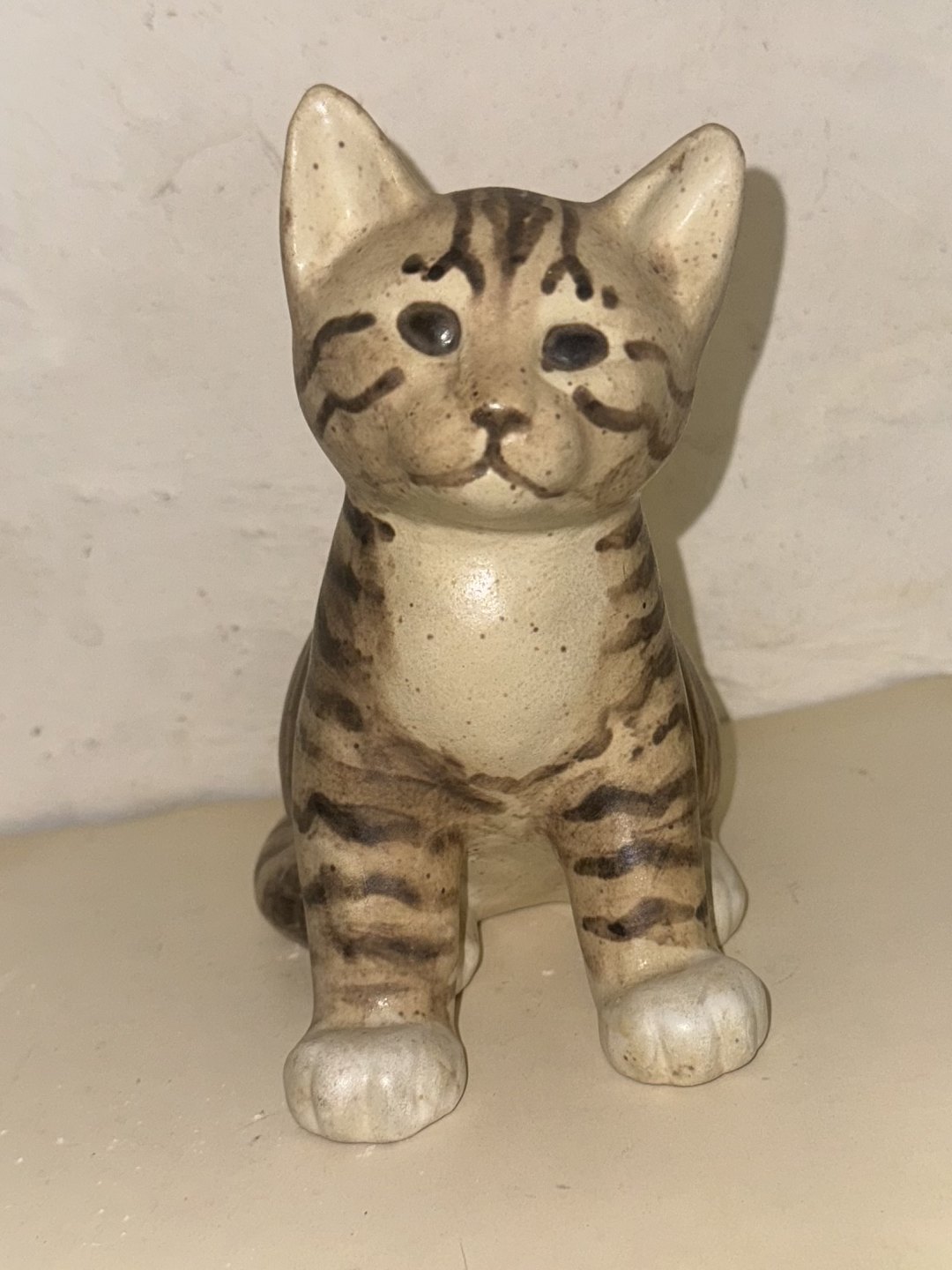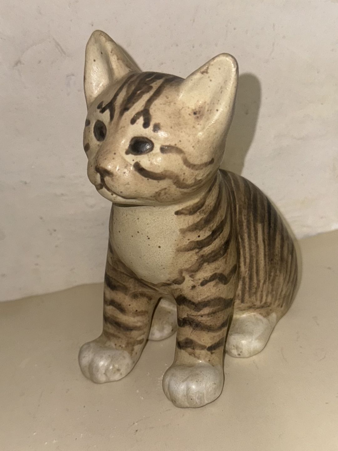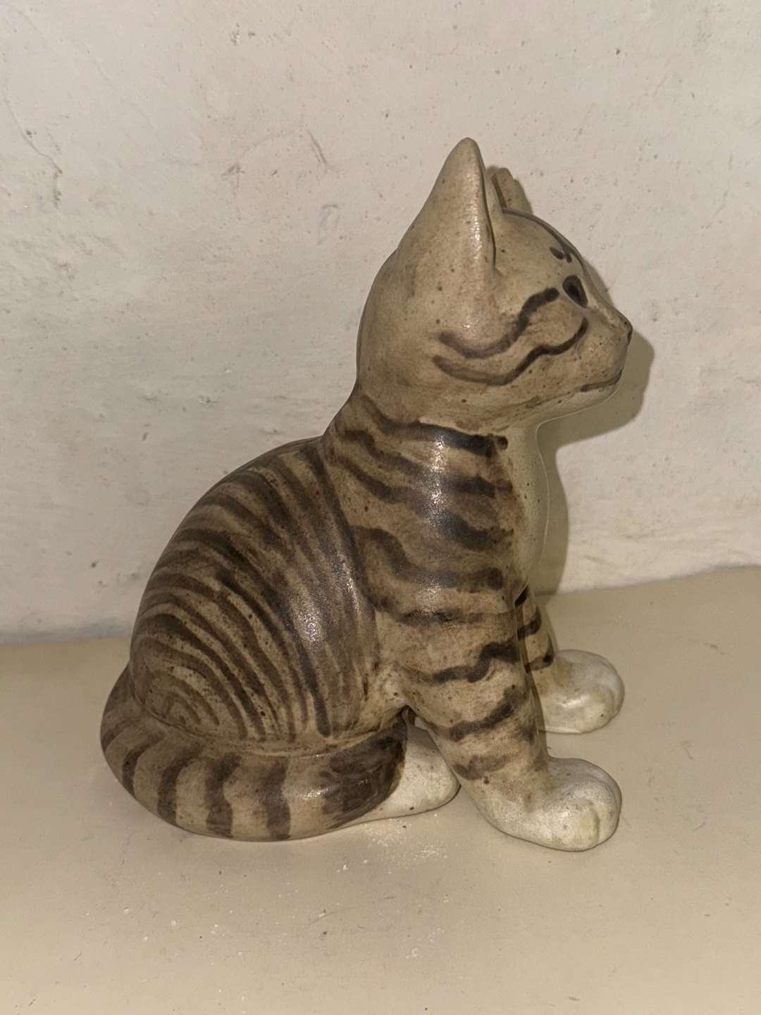 KATTEKILLING: Elisa Glaffey, Danmark: Figur i keramik af siddende kat. Dækket af brunlig glasur med striber. Signeret på undersiden. Fremstår i perfekt stand. H. 17,7 cm