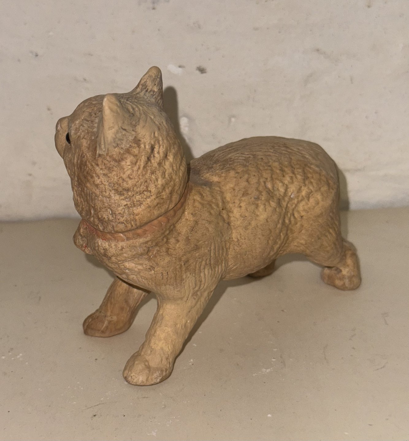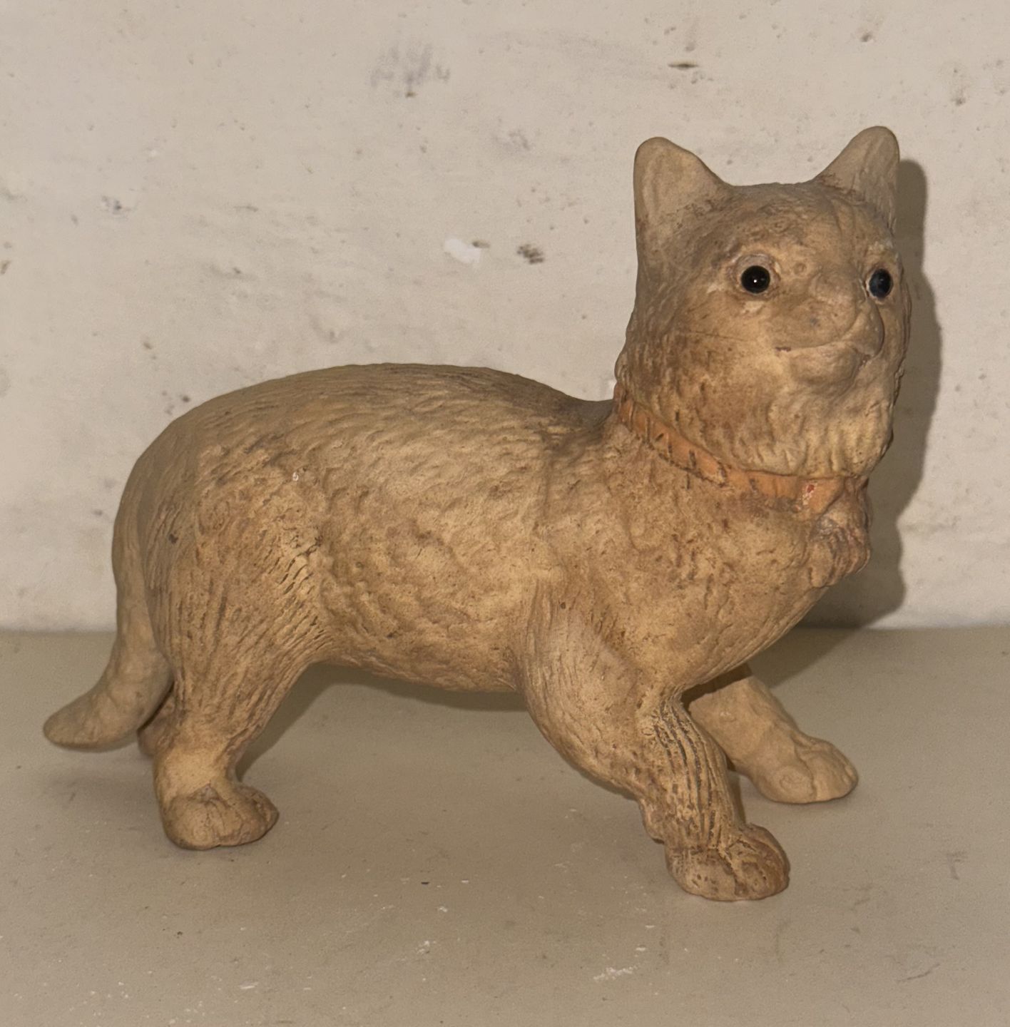 Figur af stående kat i terracotta keramik med glasøjne. Fremstillet i 19. århundrede. I god stand. Intet fabriksmærke. Mål: H. 11 cm L. 14,5 cm