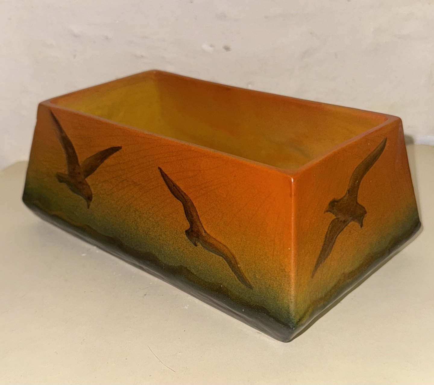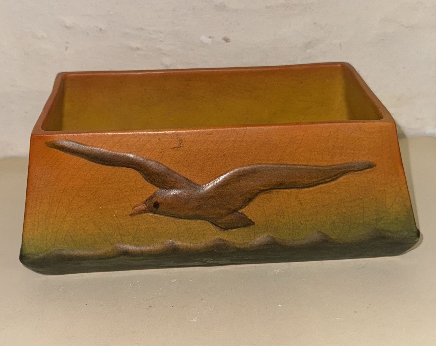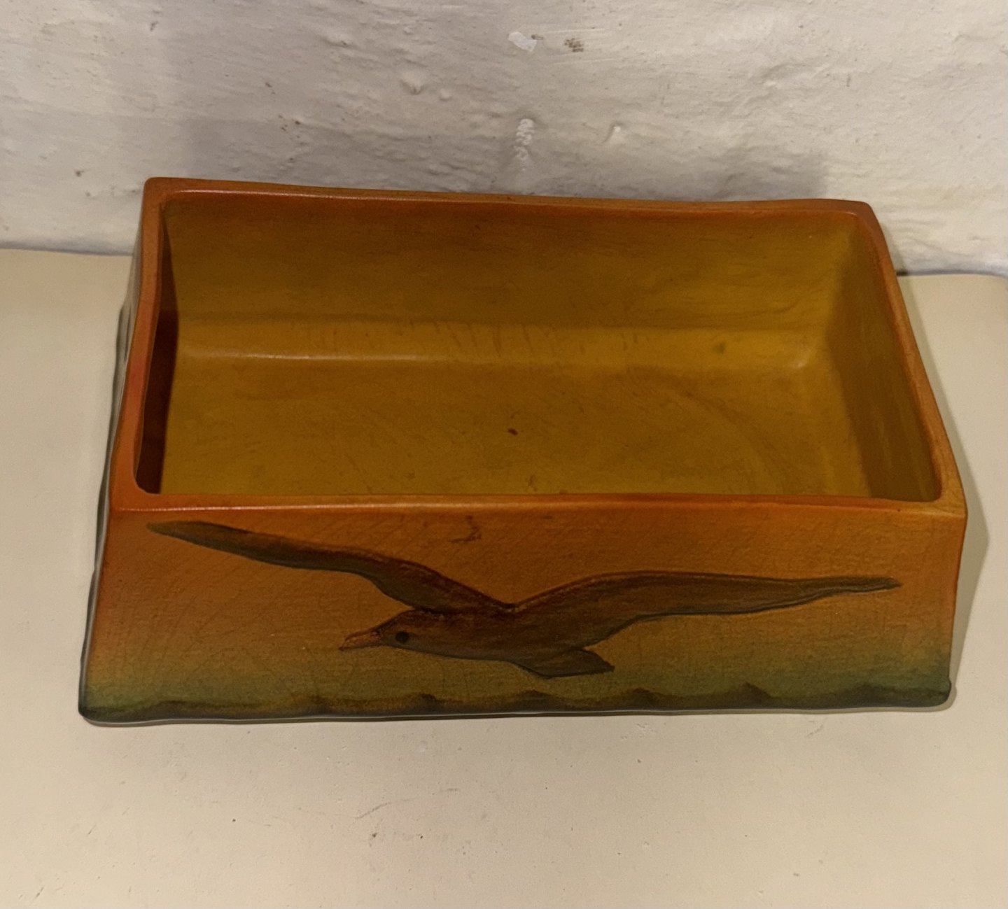 Skål i keramik fra Peter Ipsens Enke. Dekoreret med måger i relief. Fremstår i god stand. Fabriksmærkwt på bunden. Mål: H. 7,3 cm samt 11 x 18,5 cm.