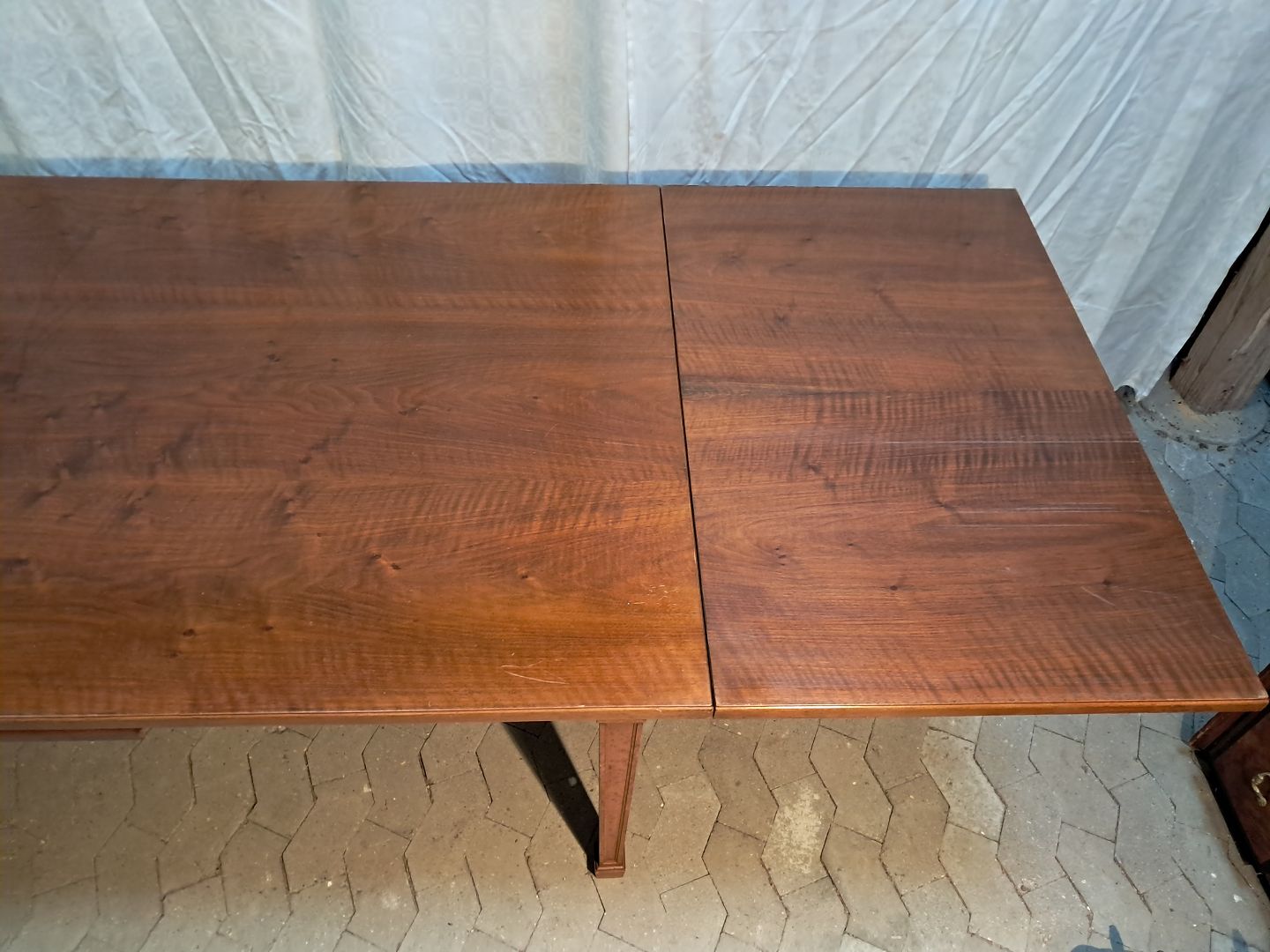 Spisebord i fineret nødetræ med hollandsk udtræk, fra 1950erne.