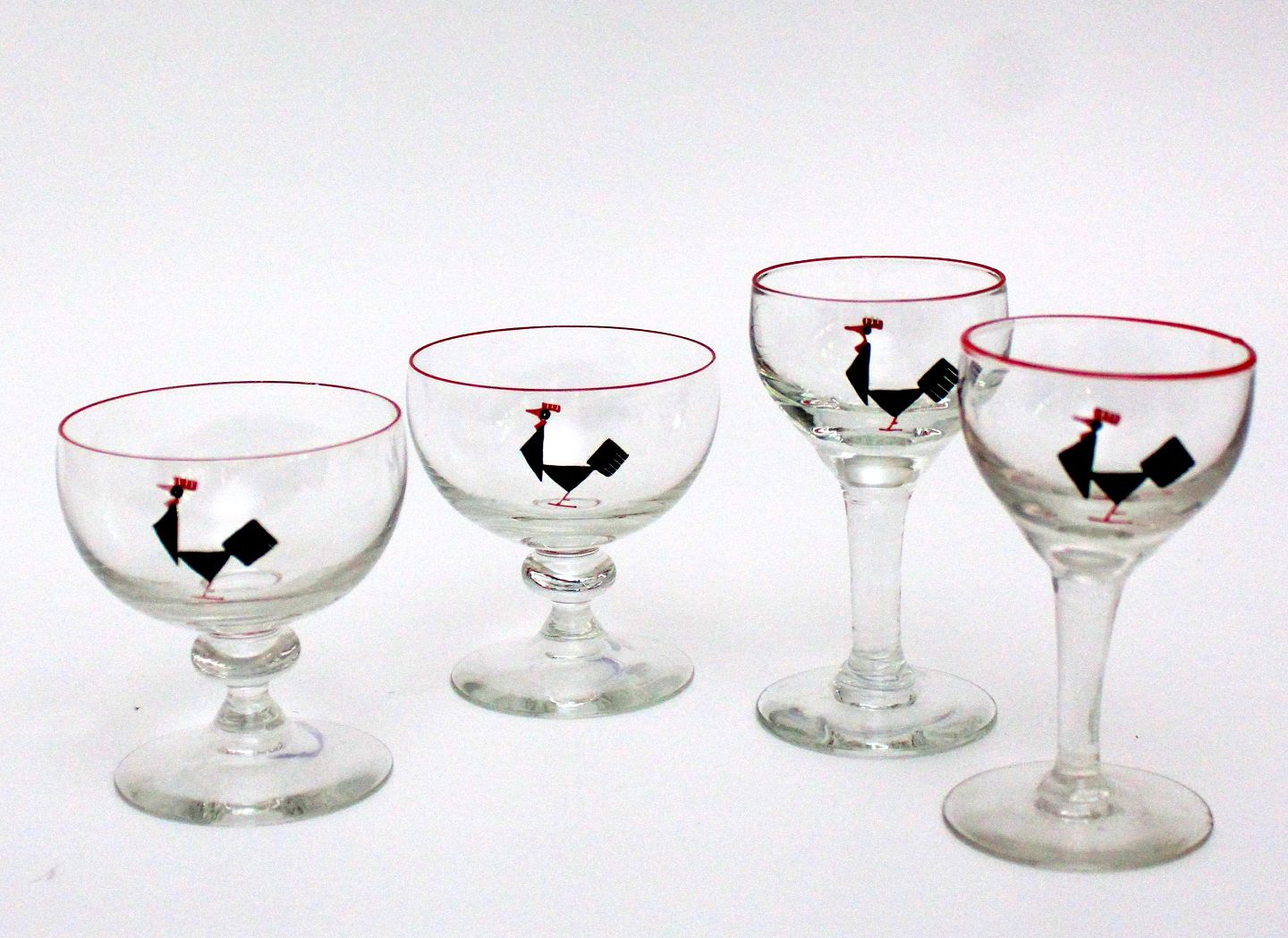 Holmegaard Glasværk, Likør og snapseglas med emaljebemalet sort hane og rød kant. Designet af Jacob E. Bang og fremstillet på Malerstuen i Nyhavn 12 i perioden 1937-1957.