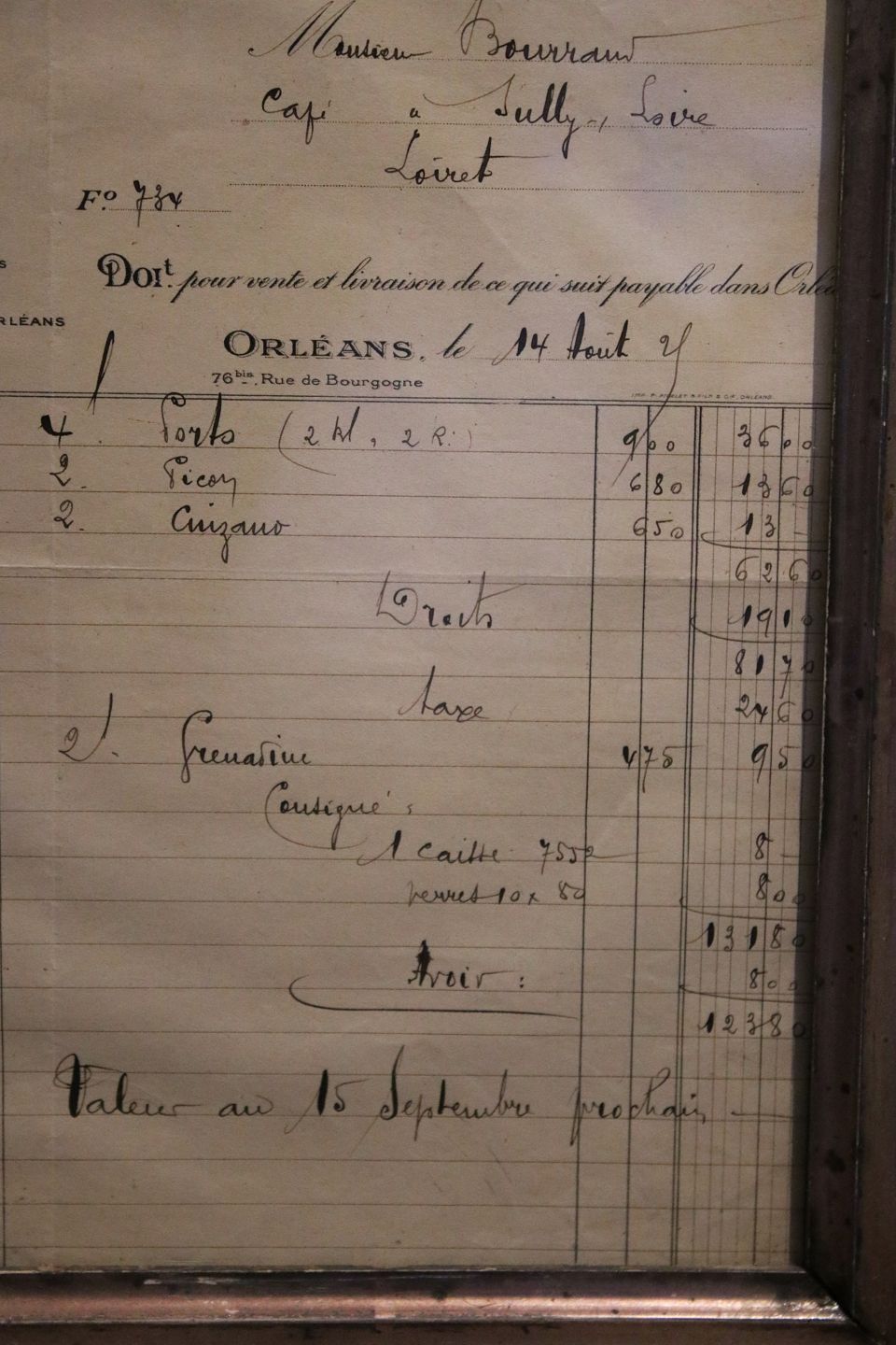 Gammel fransk håndskrevet spiritus regning indrammet i gammel sølvramme med patina.
