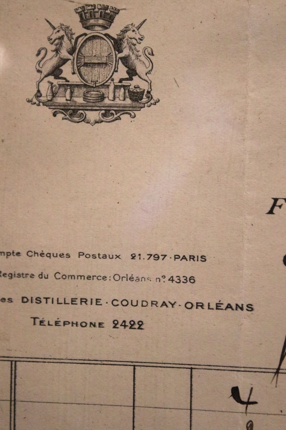 Gammel fransk håndskrevet spiritus regning indrammet i gammel sølvramme med patina. Måler 31,5x24,5cm.