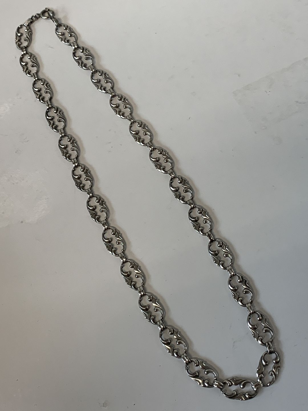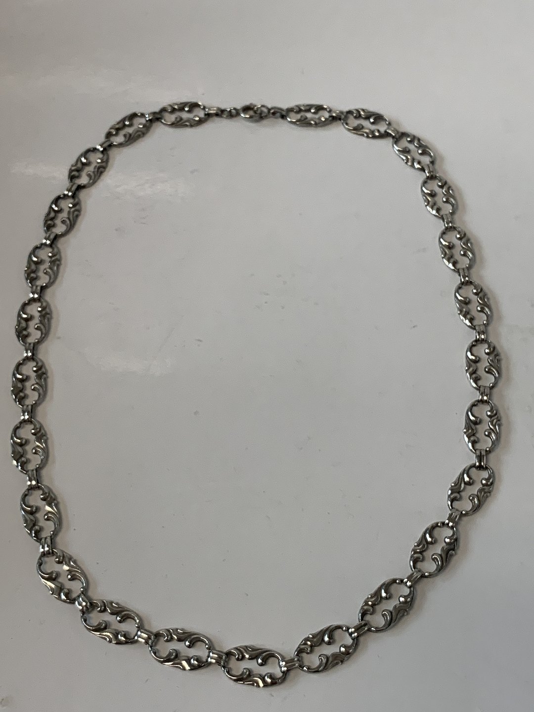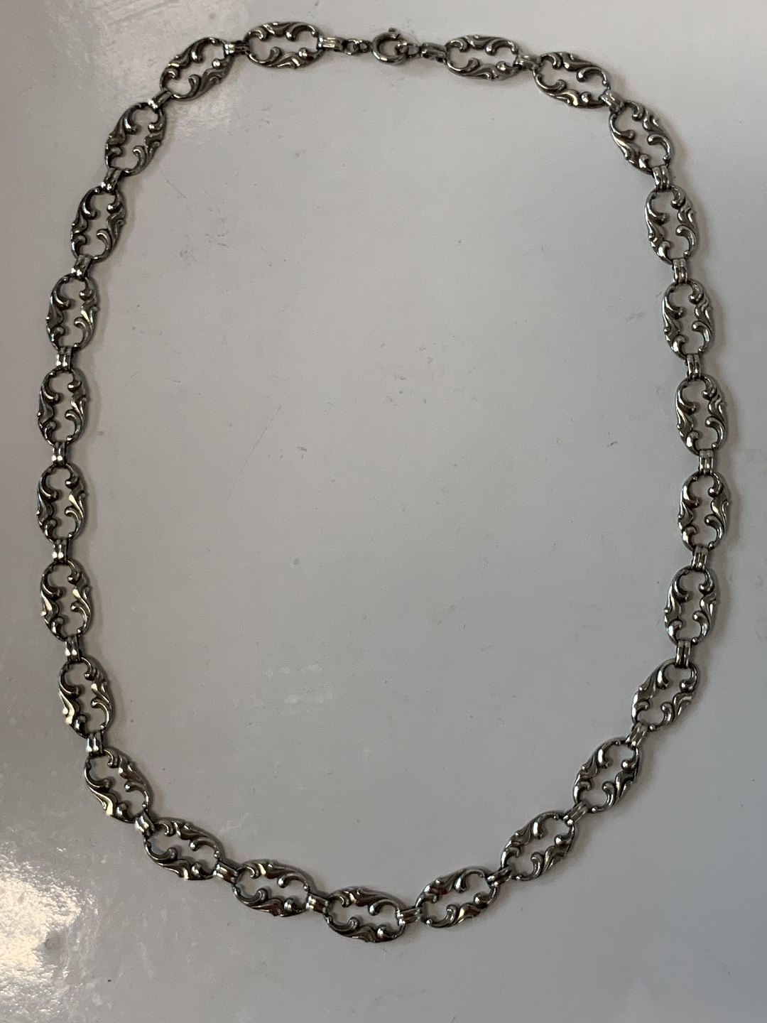 Smuk og elegant sølvhalskæde, udført i 830 sølv. Kæden har smukke detaljerede led, der giver halskæden et smukt feminint udseende. Sølvkæden kan især bruges til en flot kjole, men kan også bruges til en pæn skjorte.