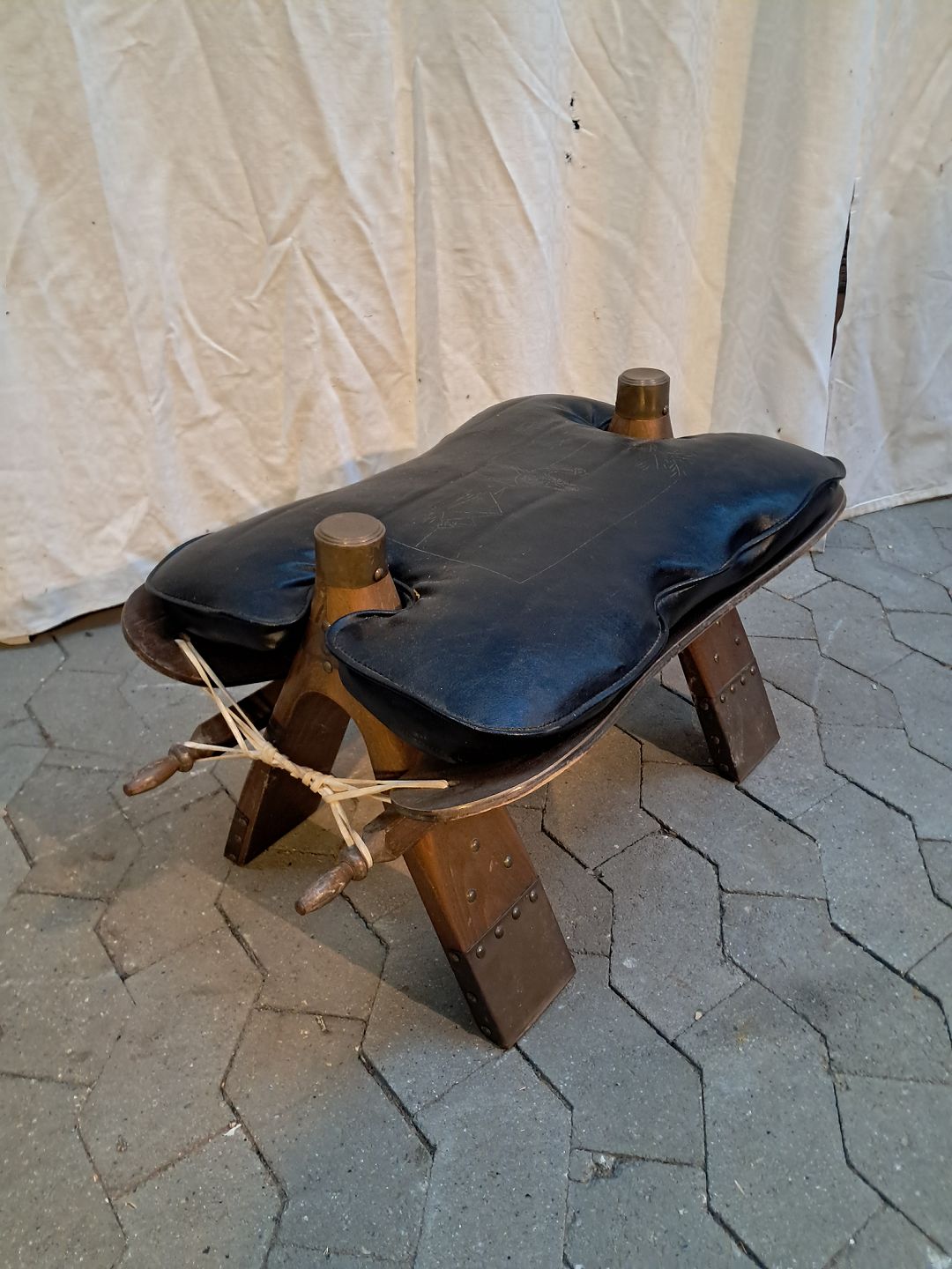 Skammel i massivt træ med kunstlæder hynde, fra 1980erne.