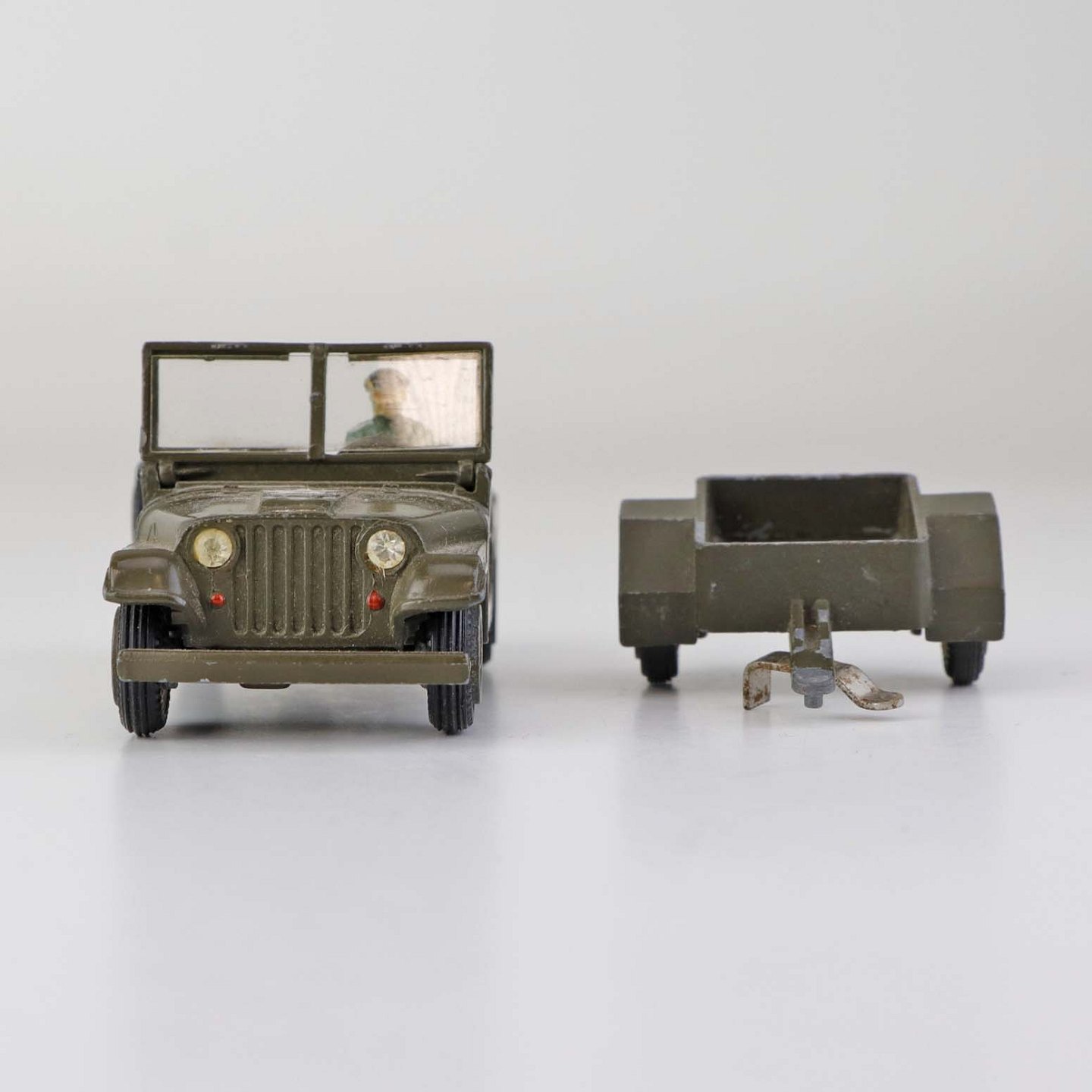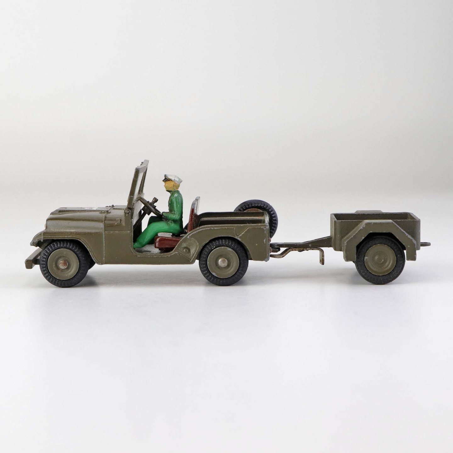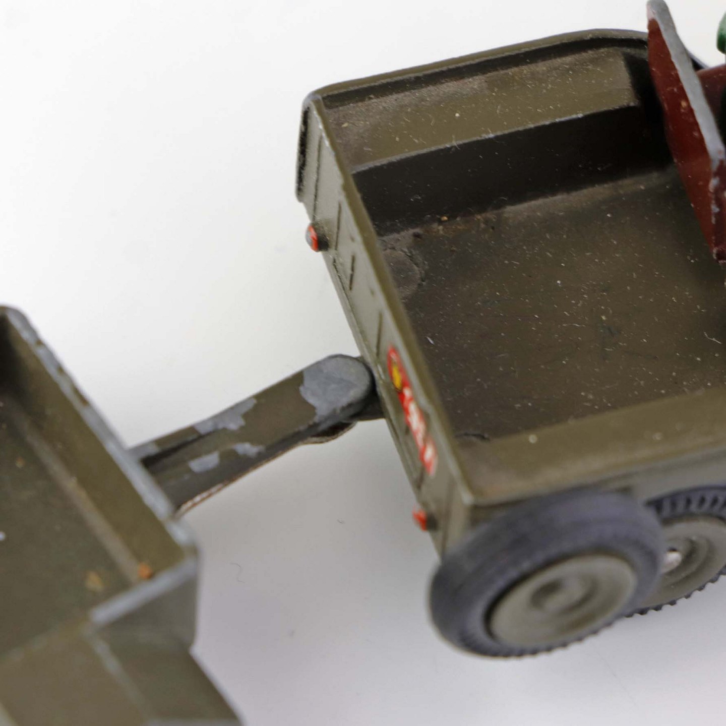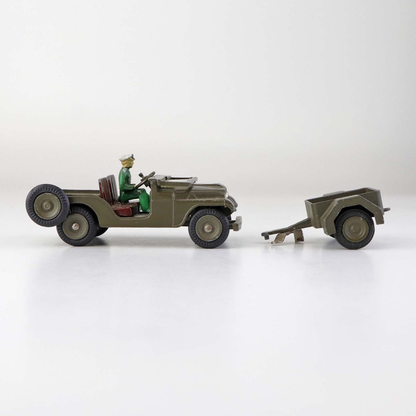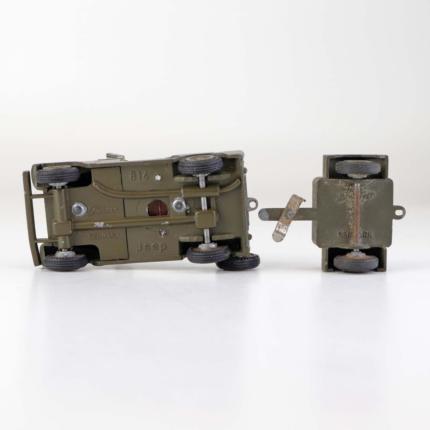 Legetøjsbil model Jeep med påhængstrailer og mand bag rattet i lakeret flaskegrøn metal med gummi hjul. Mærket 1957. Nr. 814