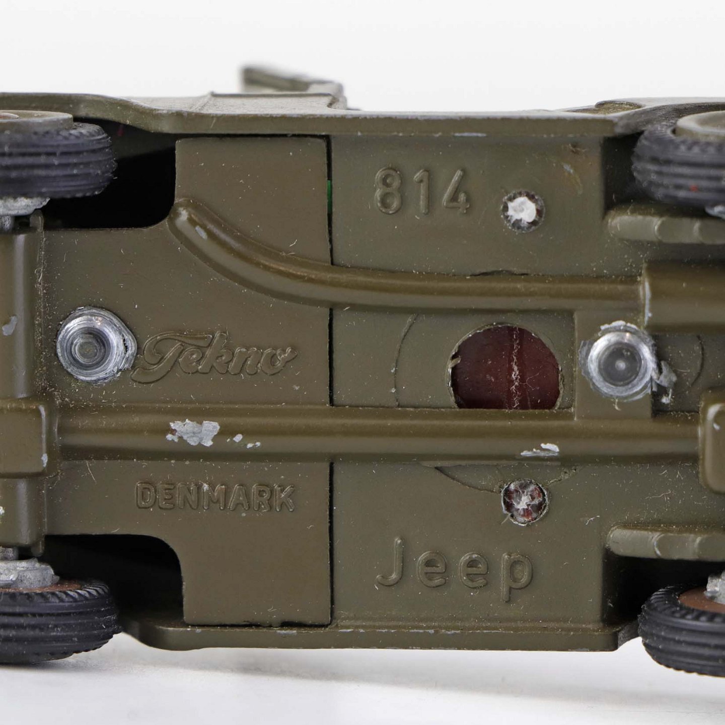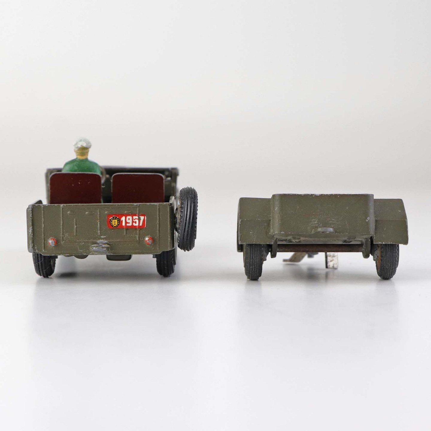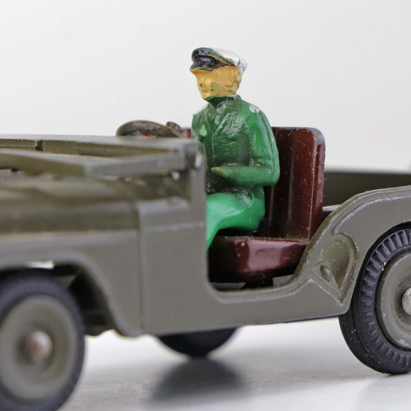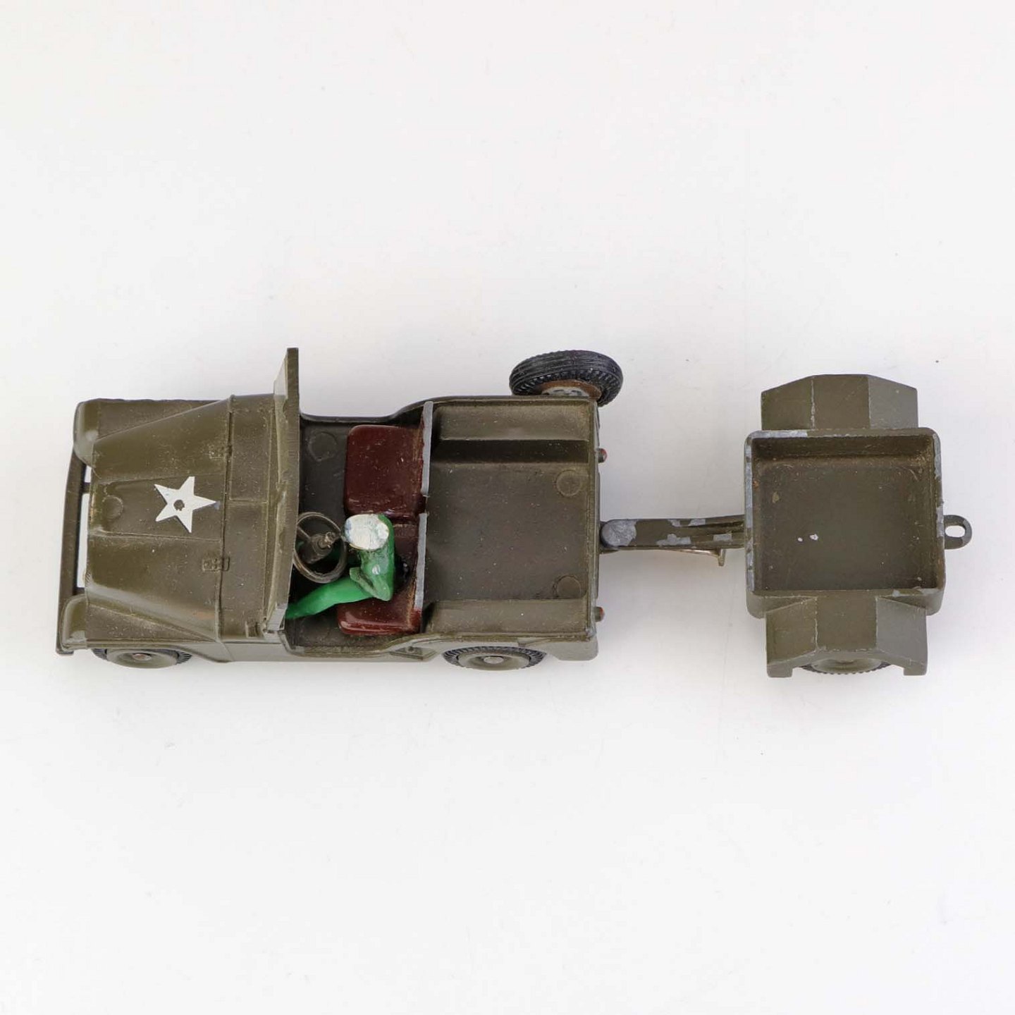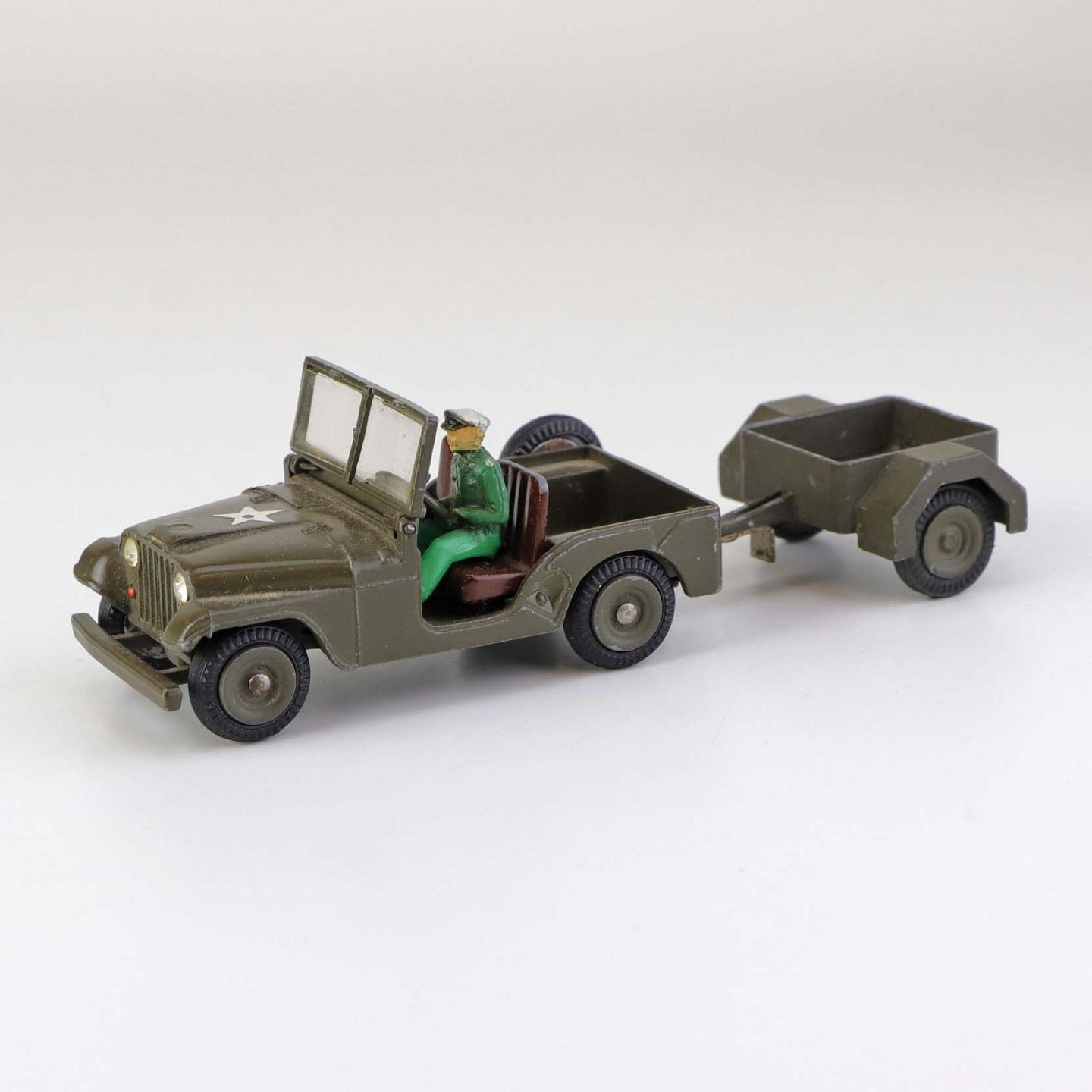 Legetøjsbil model Jeep med påhængstrailer og mand bag rattet i lakeret flaskegrøn metal med gummi hjul. Mærket 1957. Nr. 814