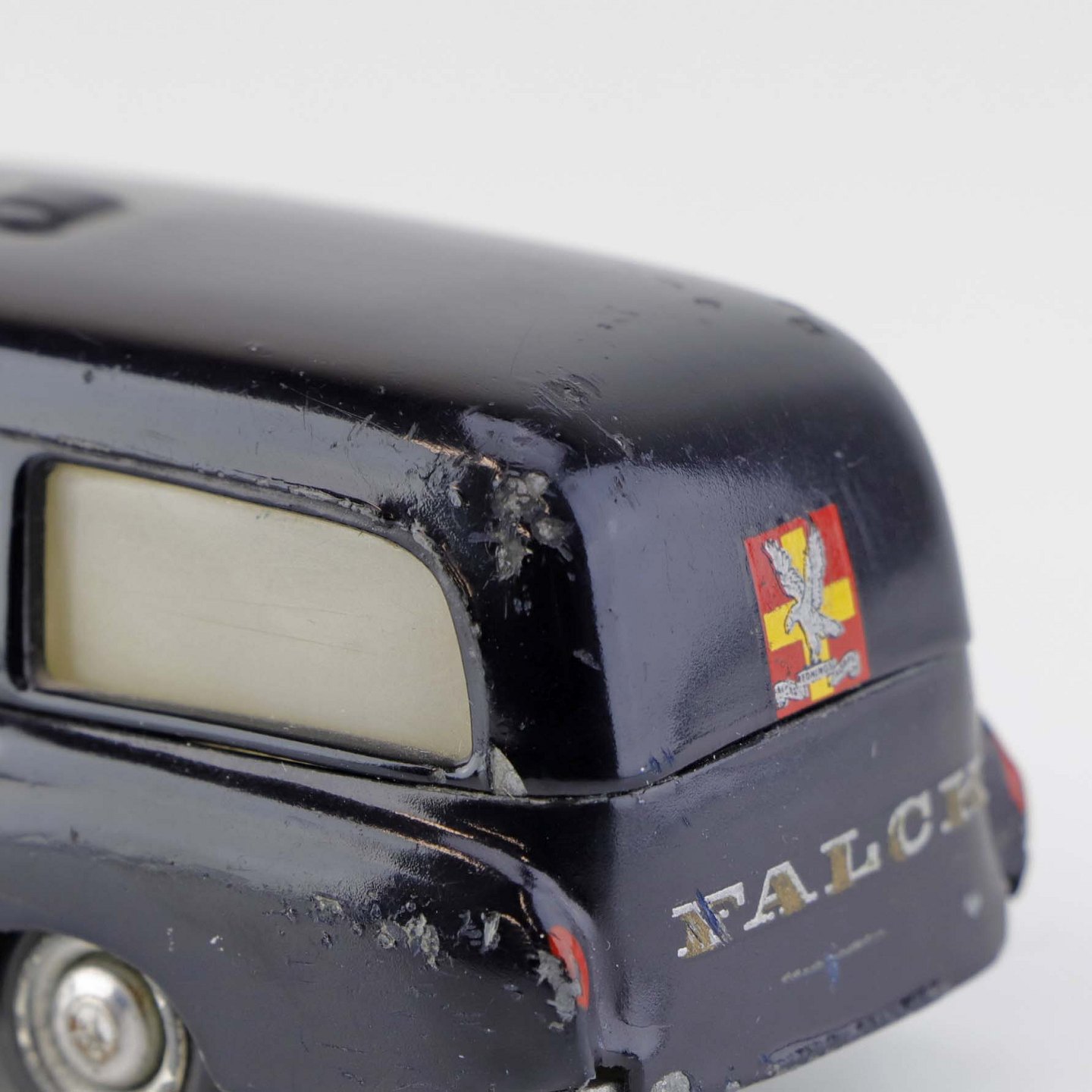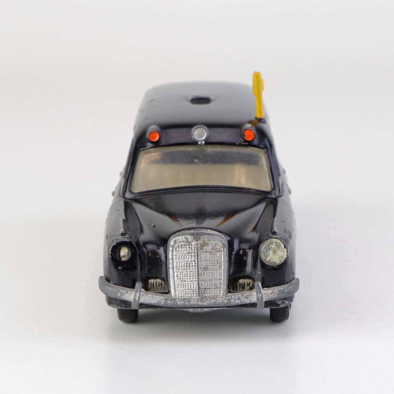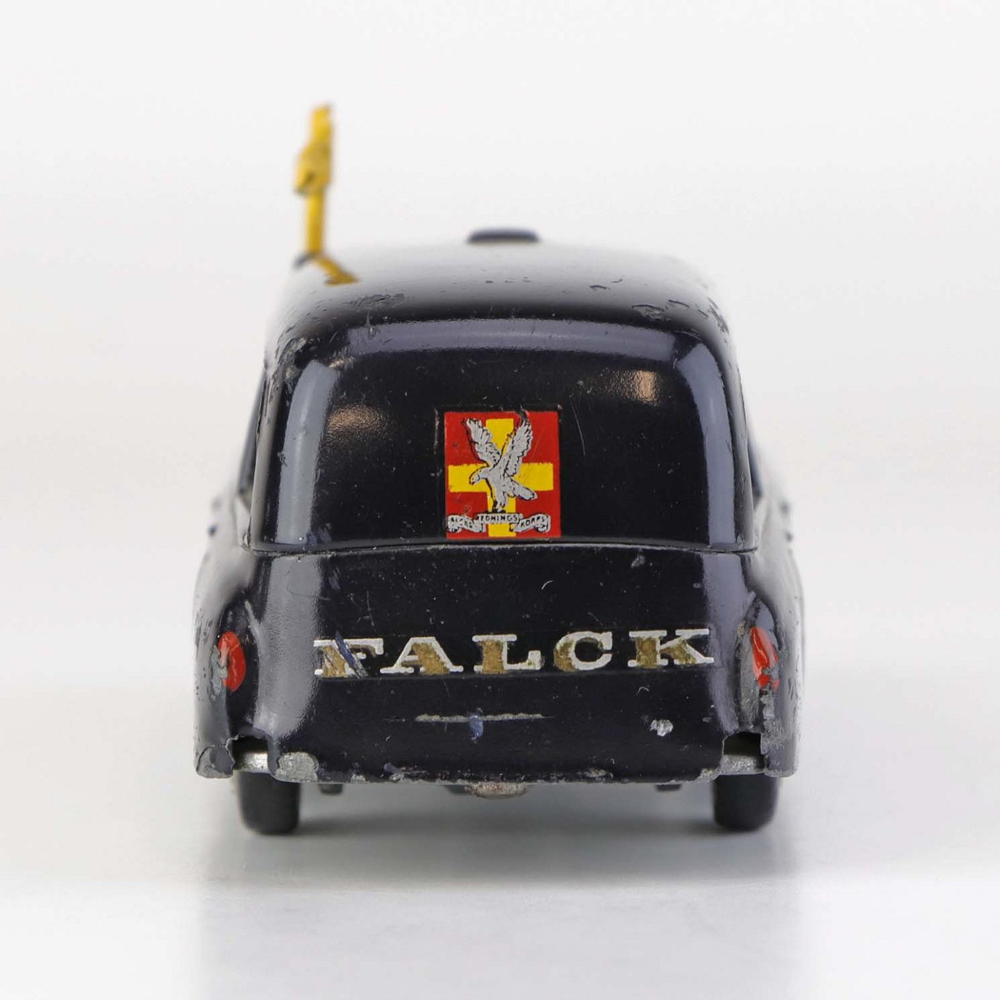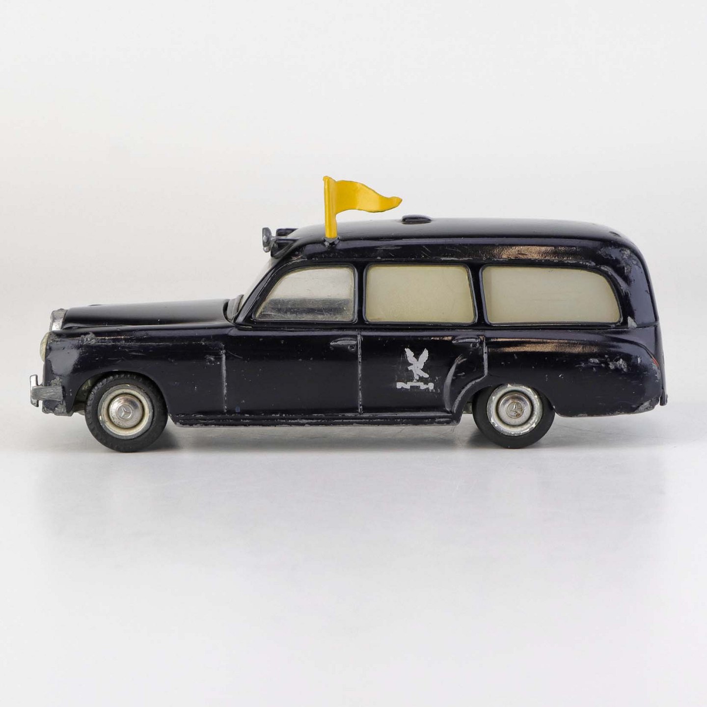 Falck bil. Mercedes-Benz 220 S legetøjsbil i sortlakeret metal med gummi hjul og gult metal flag. Nr. 731/32