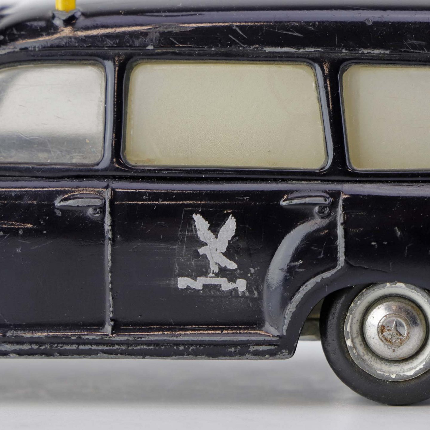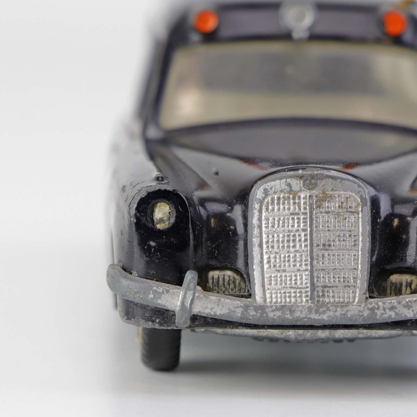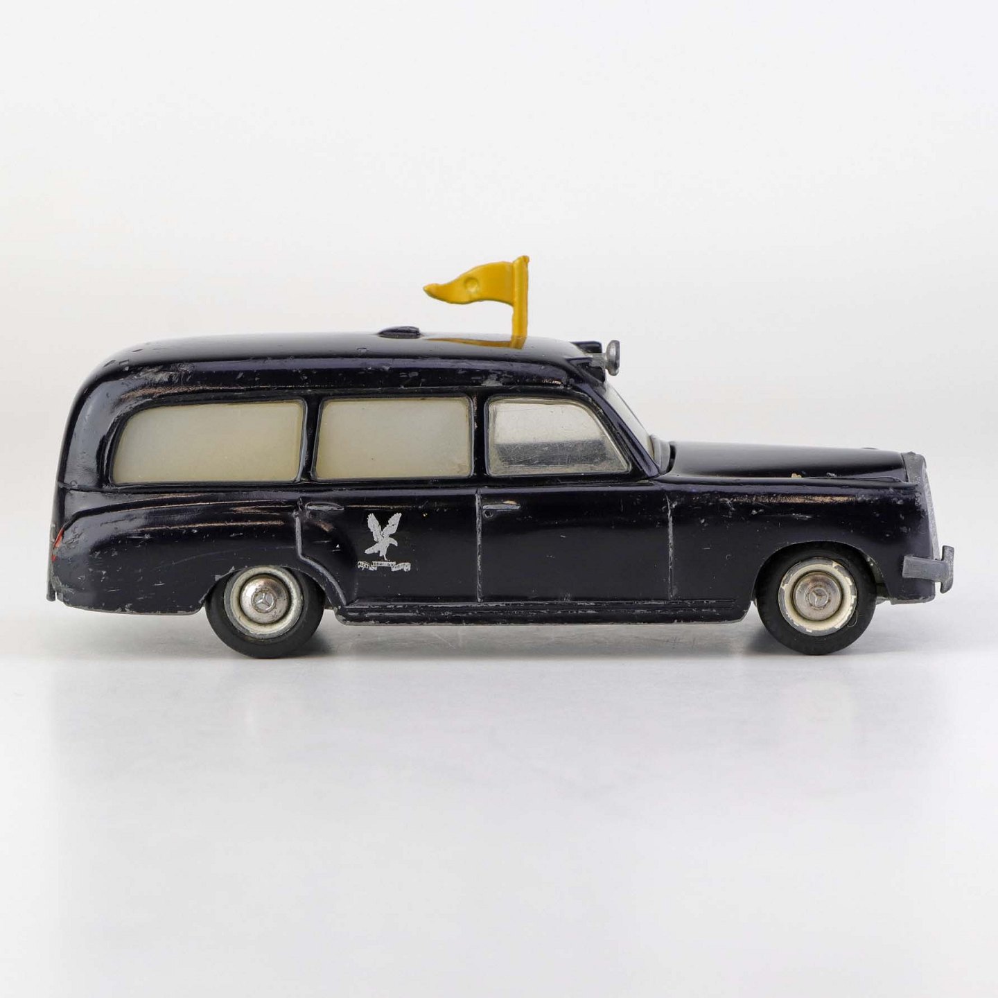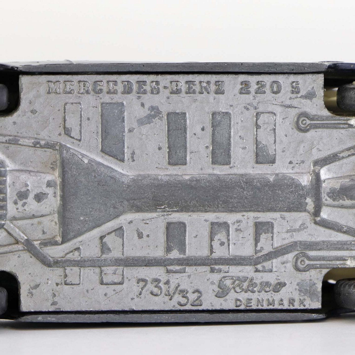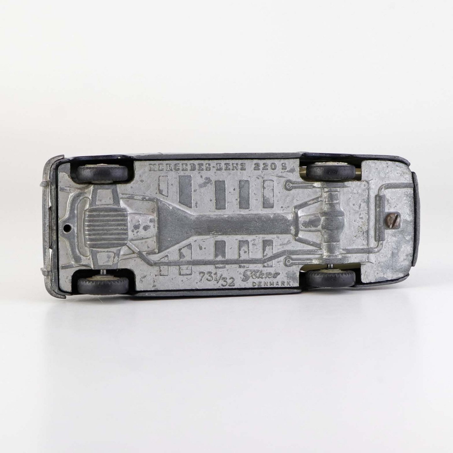 Falck bil. Mercedes-Benz 220 S legetøjsbil i sortlakeret metal med gummi hjul og gult metal flag. Nr. 731/32