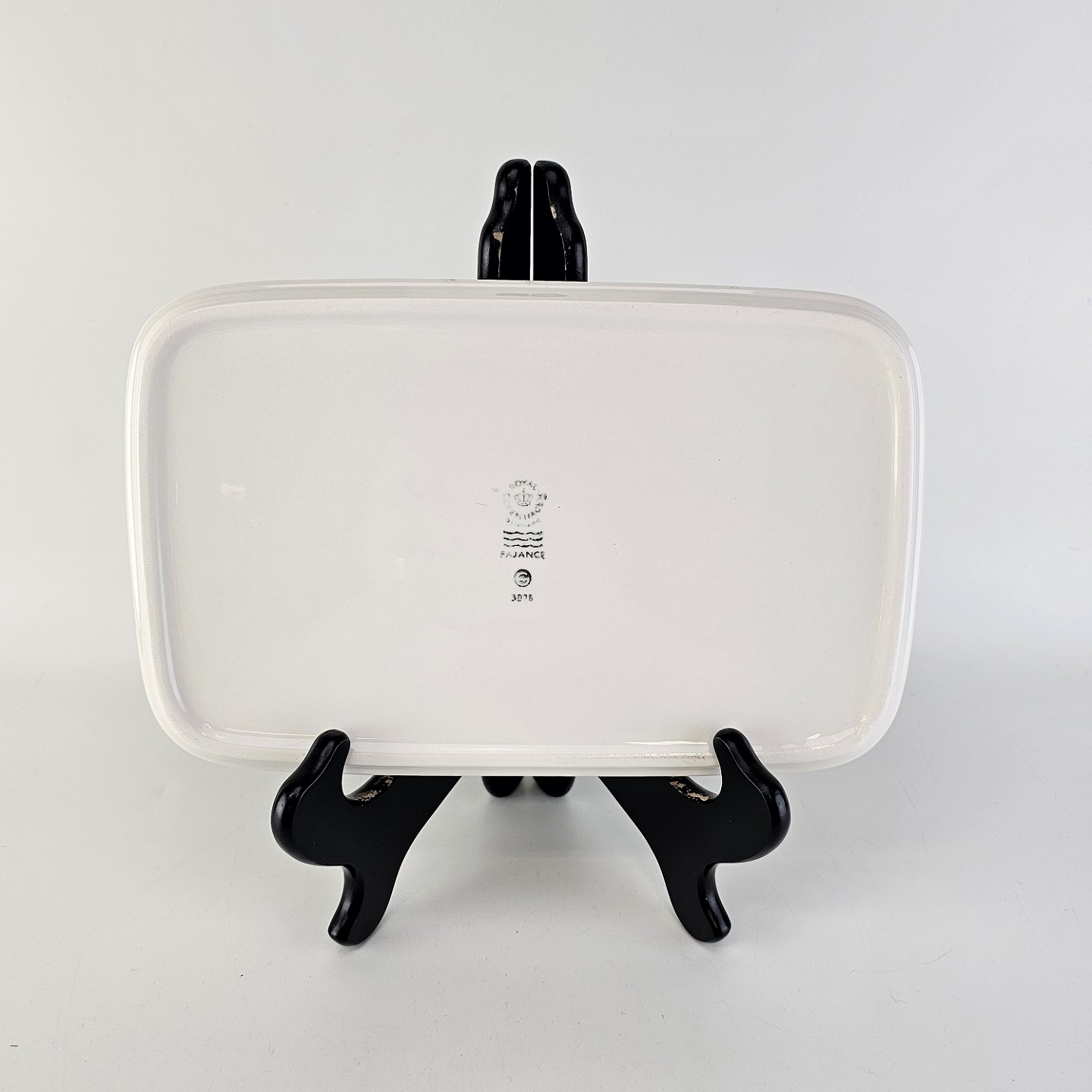 Stellet er fremstillet i glat hvid fajance med dekoration af en simpel stribe i forskellige farver