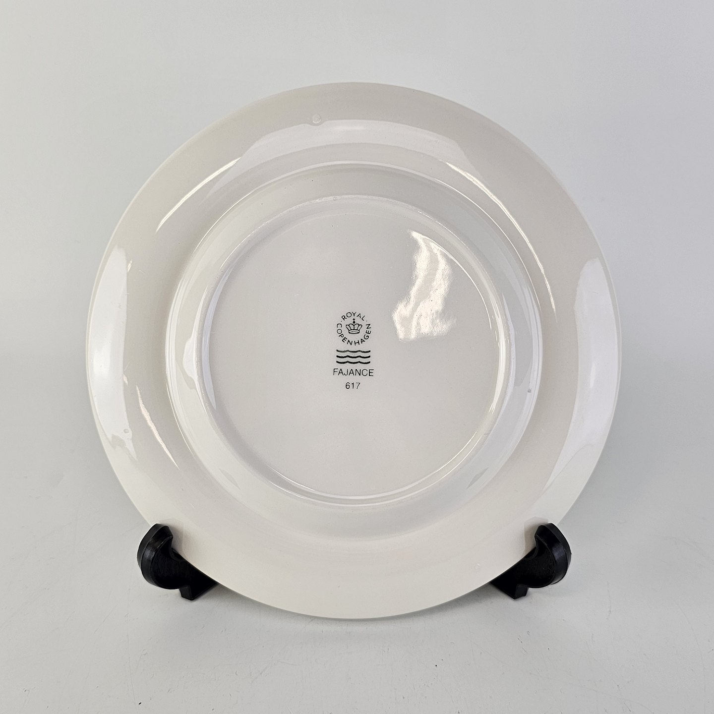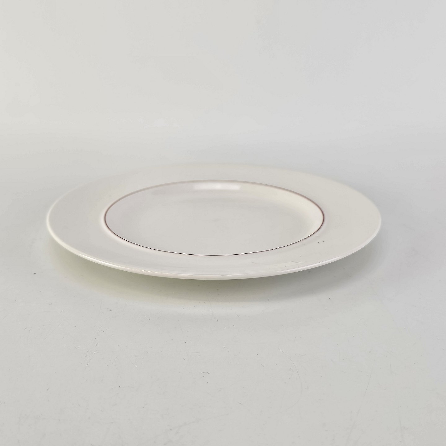 Stellet er fremstillet i glat hvid fajance med dekoration af en simpel stribe i forskellige farver