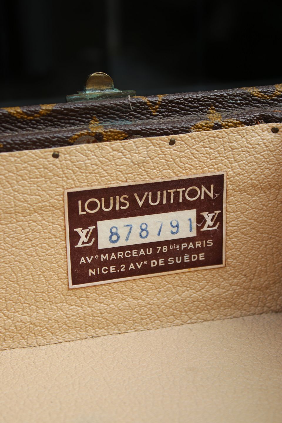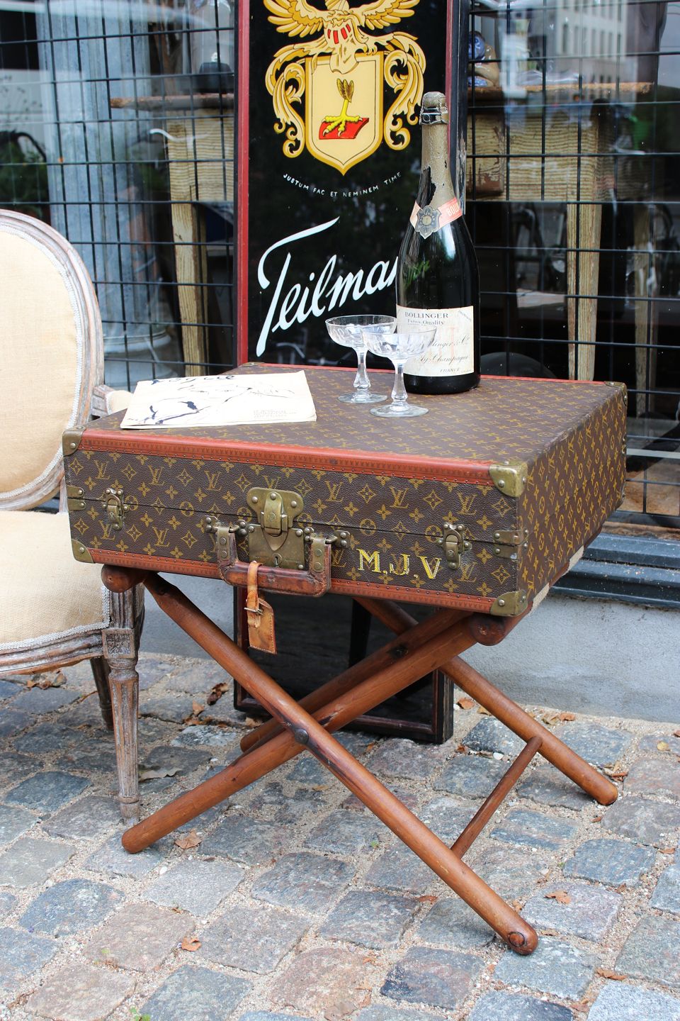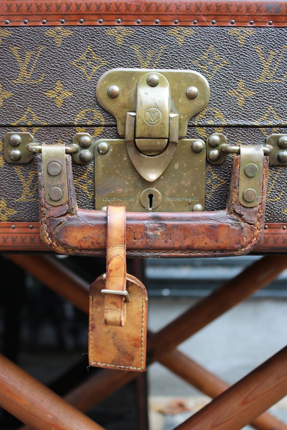 Eksklusivt sofabord / sidebord i form af original vintage LOUIS VUITTON Monogram LV rejse kuffert , nummereret og med flotte messing beslag og en god patina. (Kufferten har nogle brugsspor)