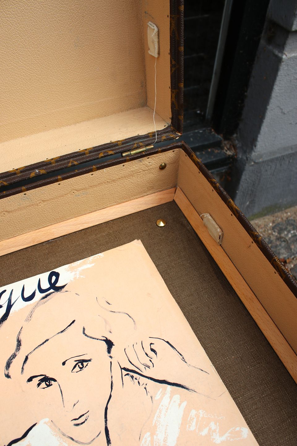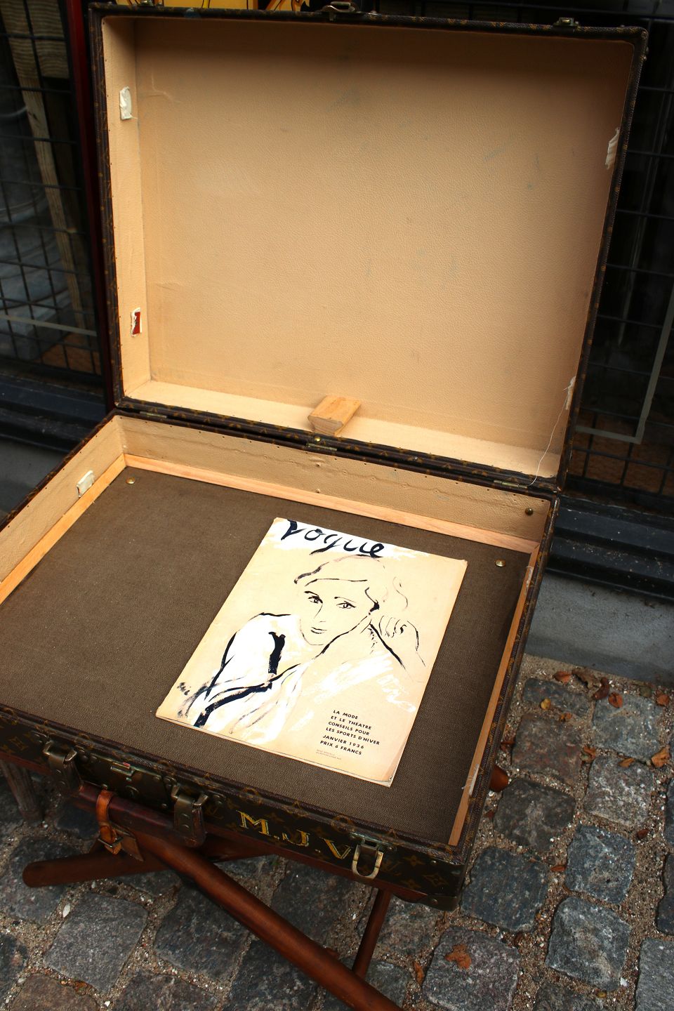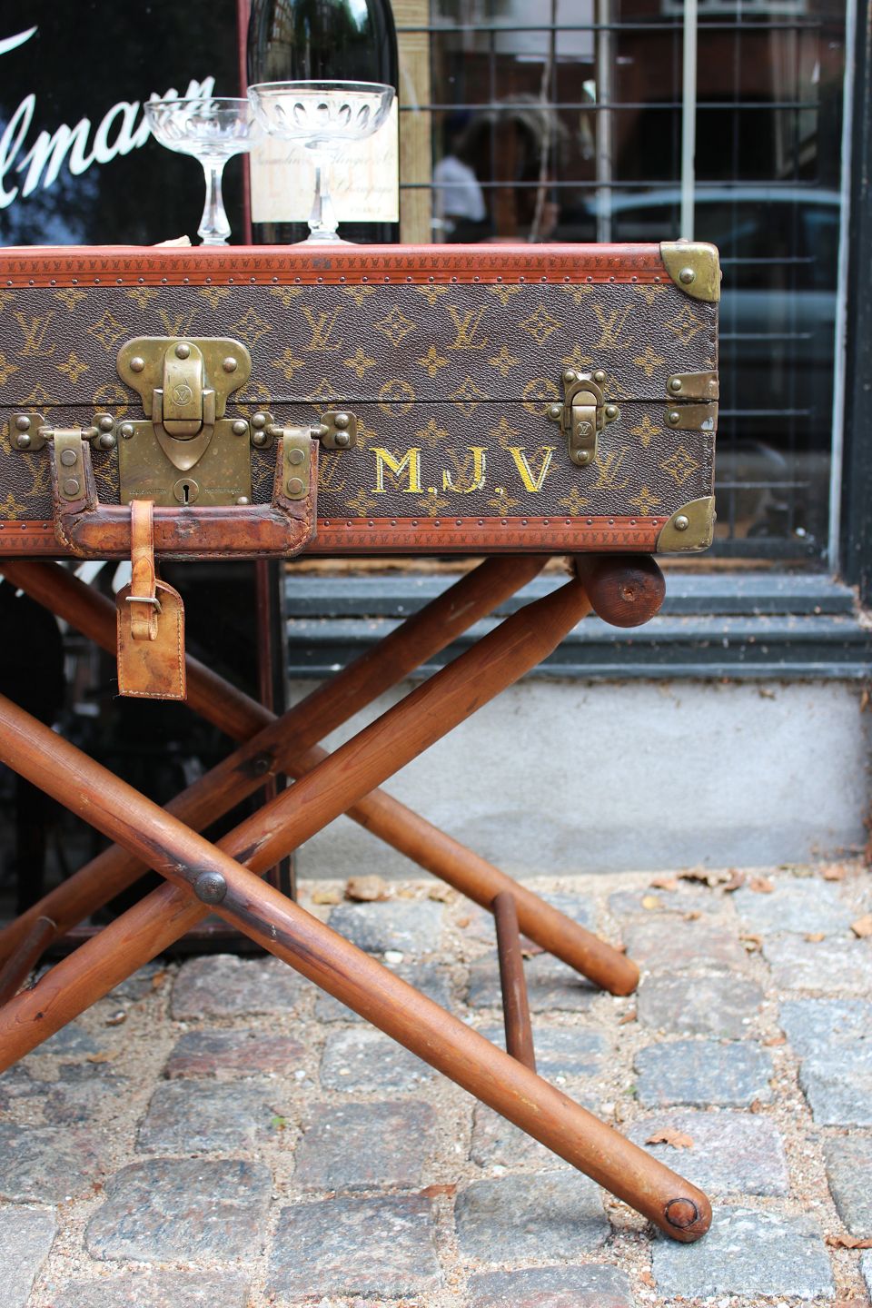 Kufferten er fastmonteret på gammelt kuffertstativ i træ.