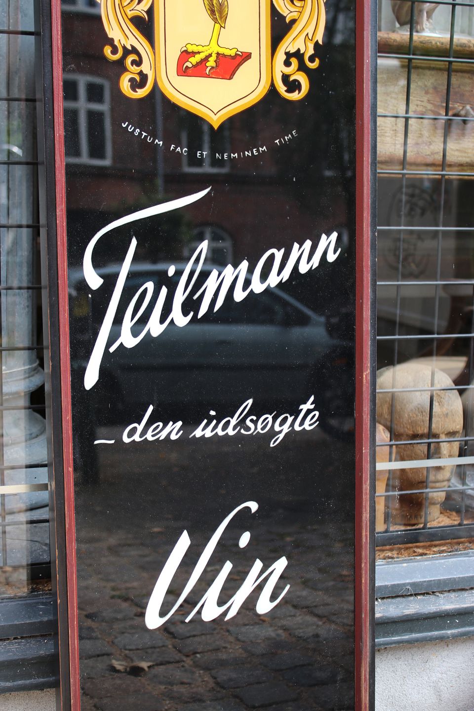 Dekorativt , gammelt reklameskilt (Teilmann vin) malet på glas ,