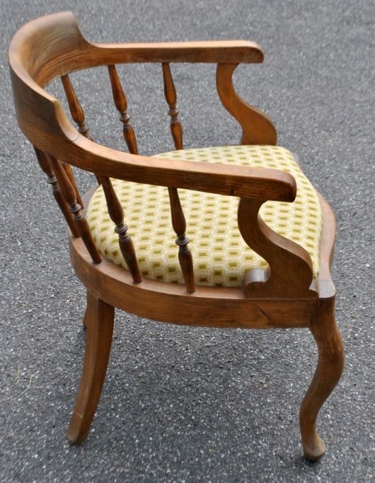 Dansk armstol i bøgetræ, 19. årh. Med capriole ben og sprosser. Gult stof. H.: 76 cm. B.: 56 cm. D.: 51 cm.