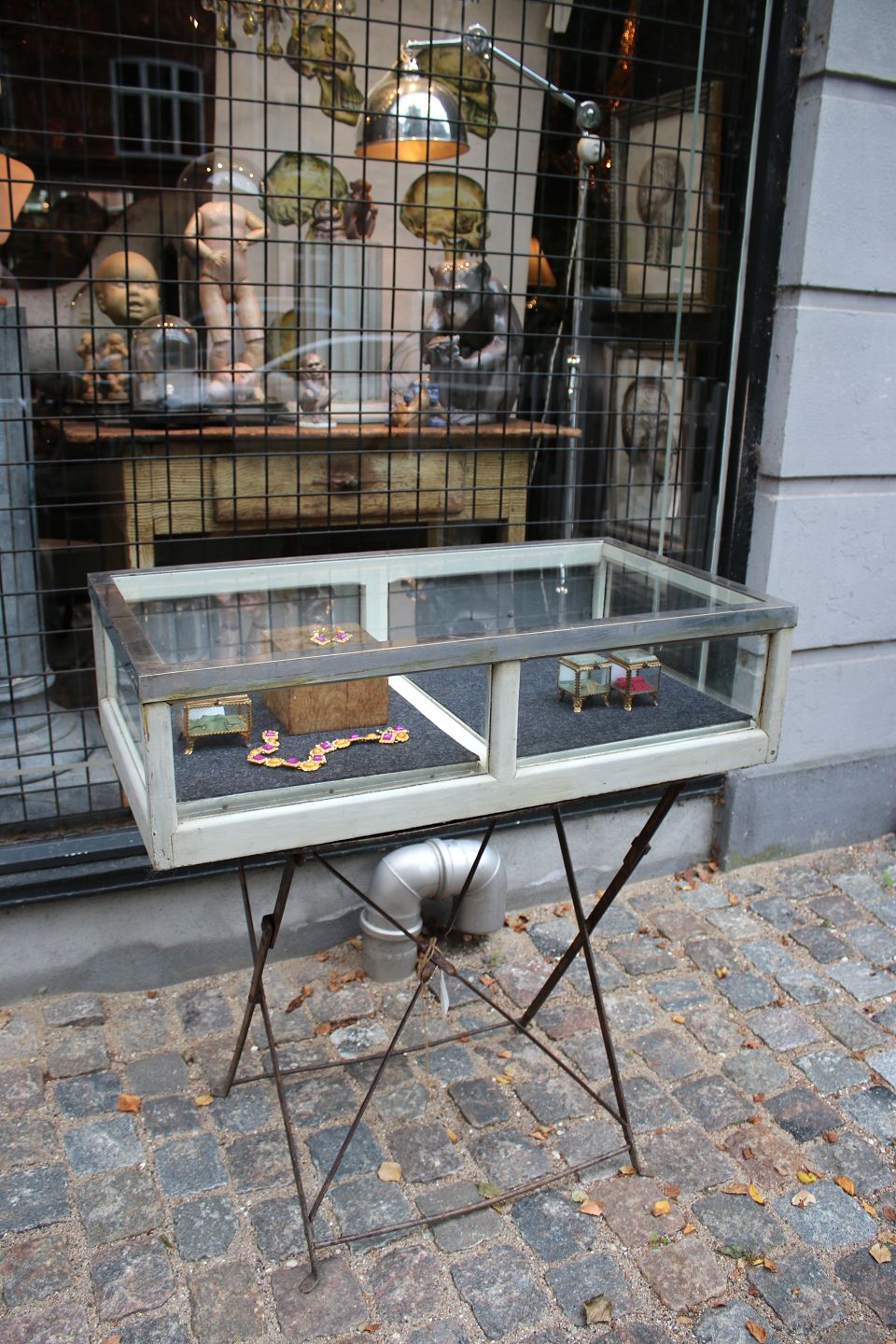 Gammel butiksvitrine , en bord udstillings vitrine i bemalet træ med glas på toppen og på 3 sider. Der er 2 udtræksskuffer på bagsiden.