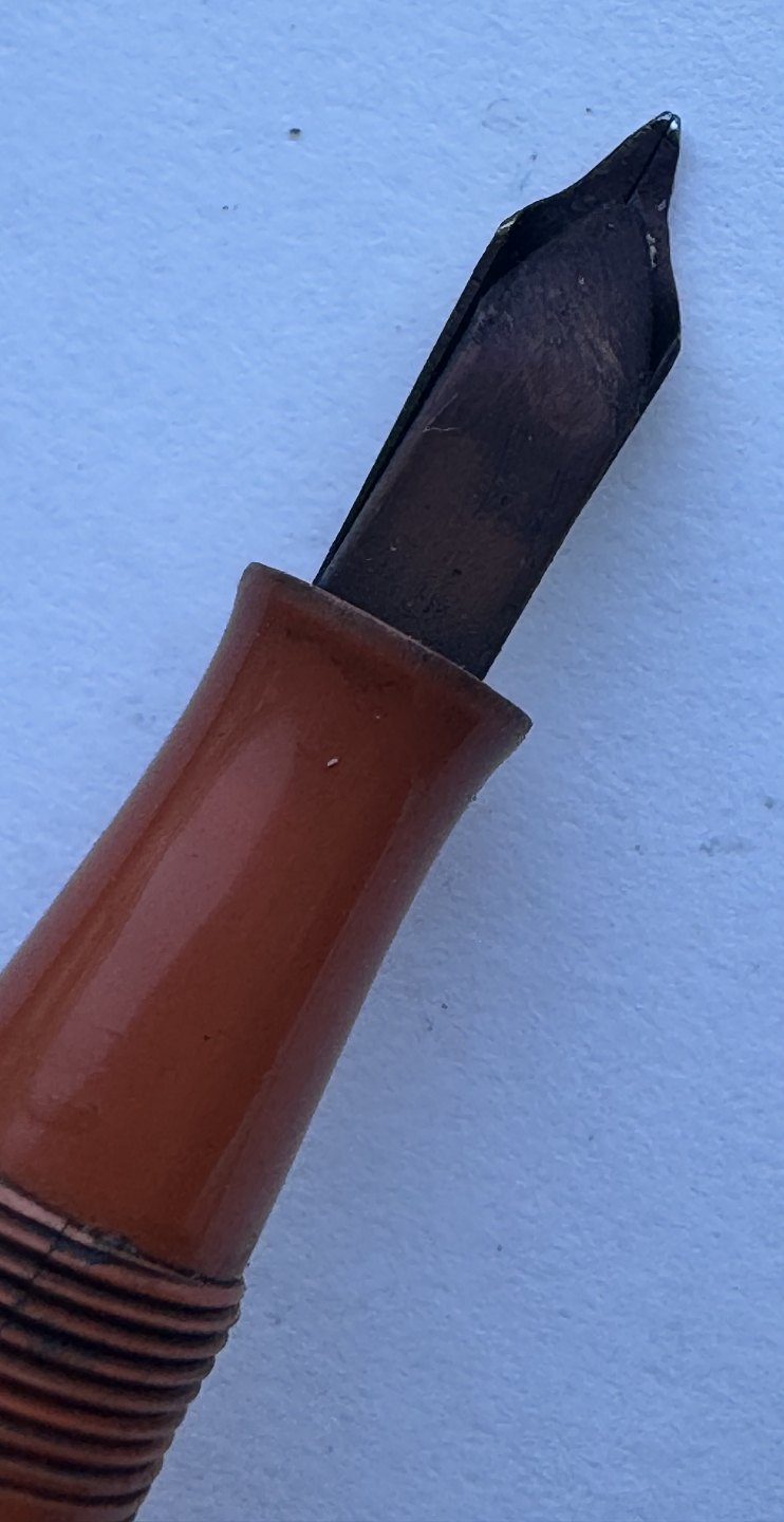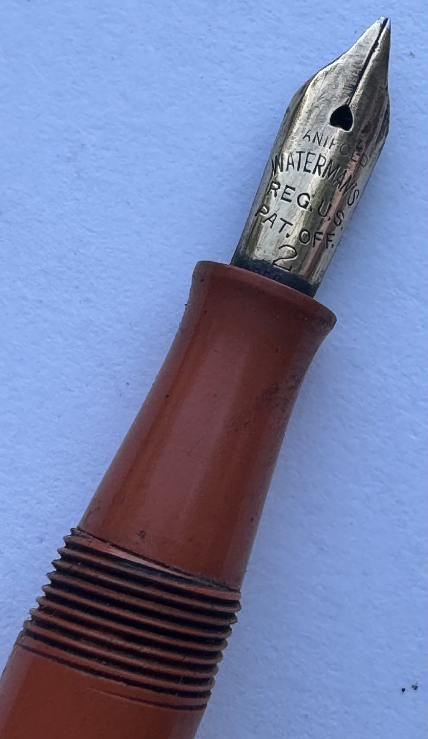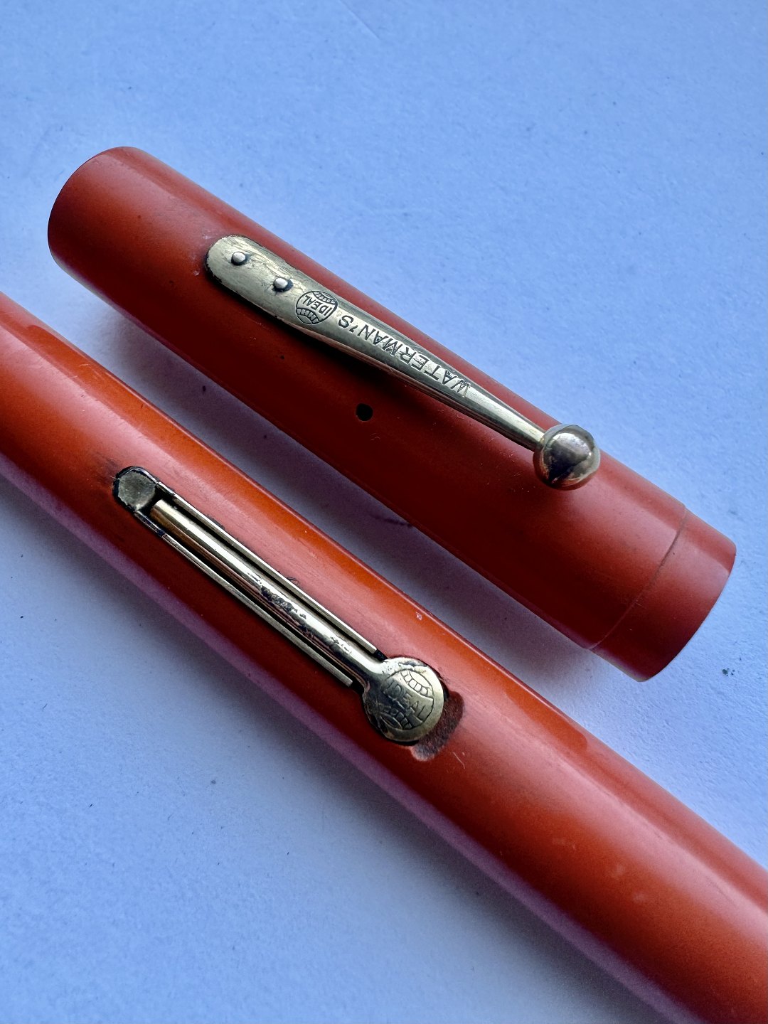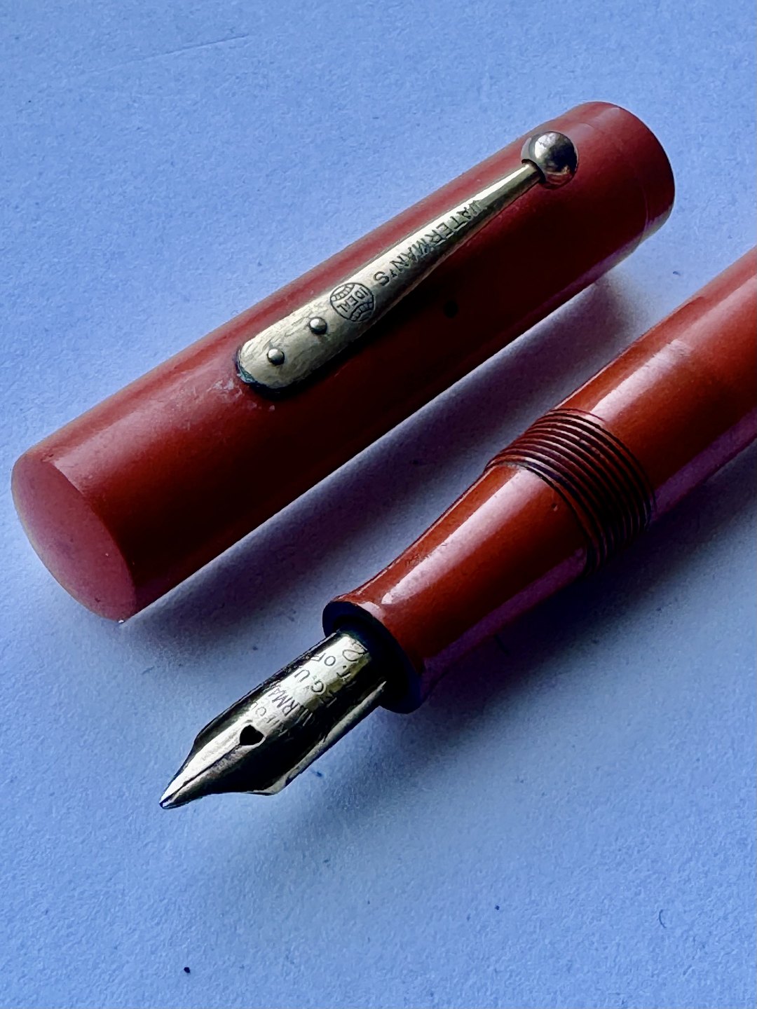 Koralrød Waterman nr. 52 fyldepen med leverfiller. FEJL: Mavebælte på hætten mangler og der er en revne henover “tråden” på pennens krop (se foto med den grå pil). Mål: 13,5 cm lang.