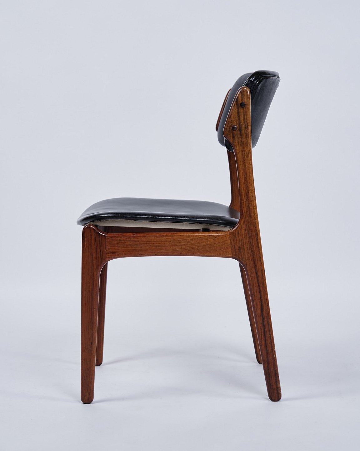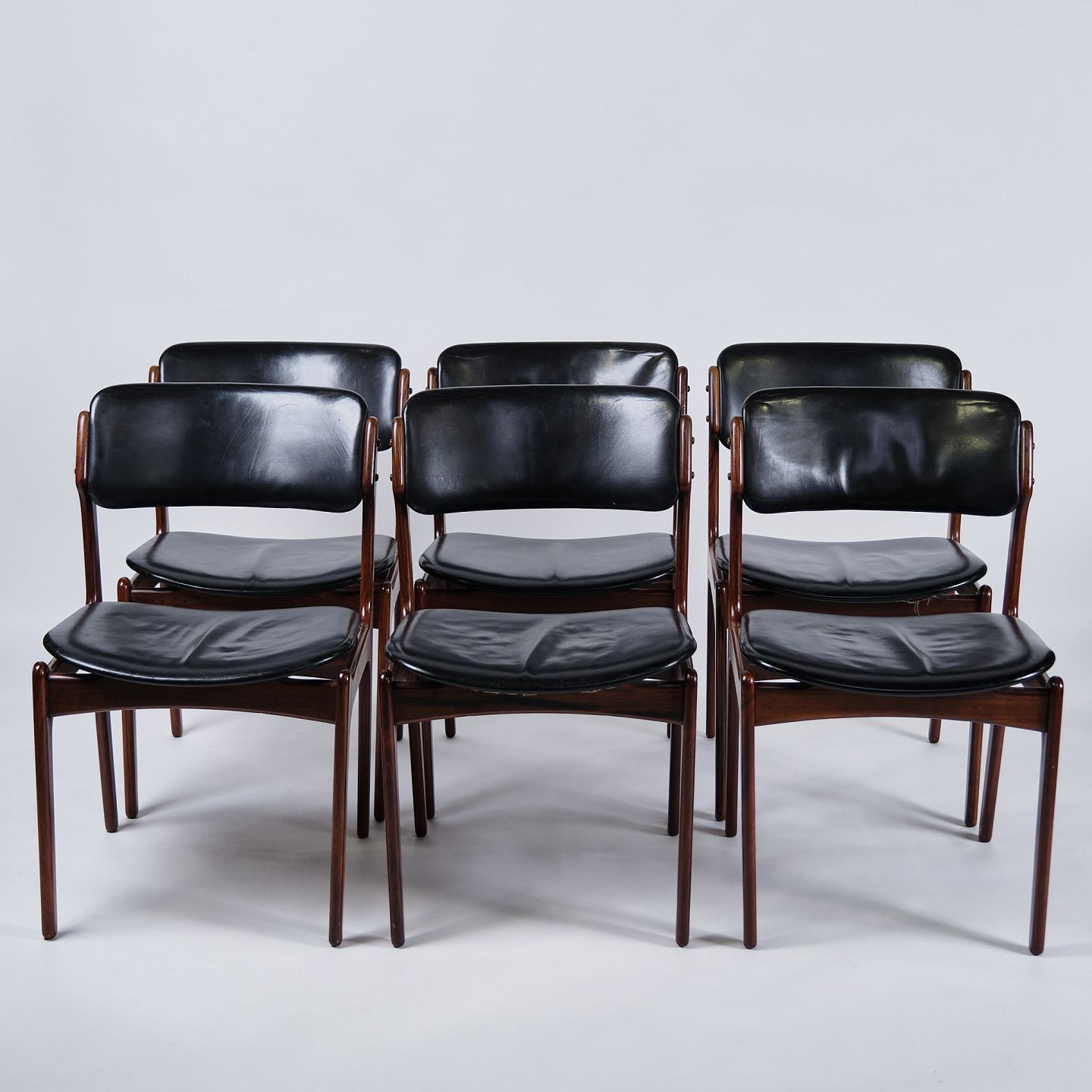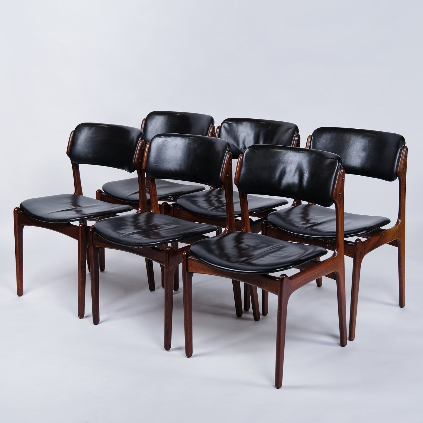 Sæt af seks Erik Buch spisebordsstole, model OD49. Palisander med sort læder. O.D. Møbler, 1950’erne.
