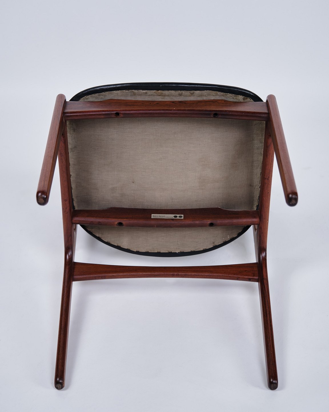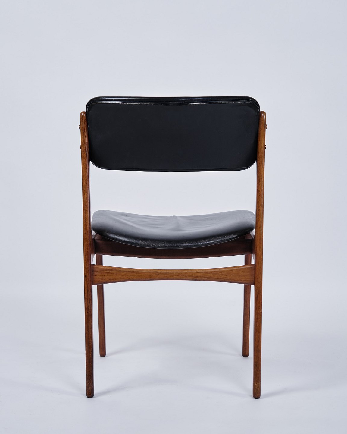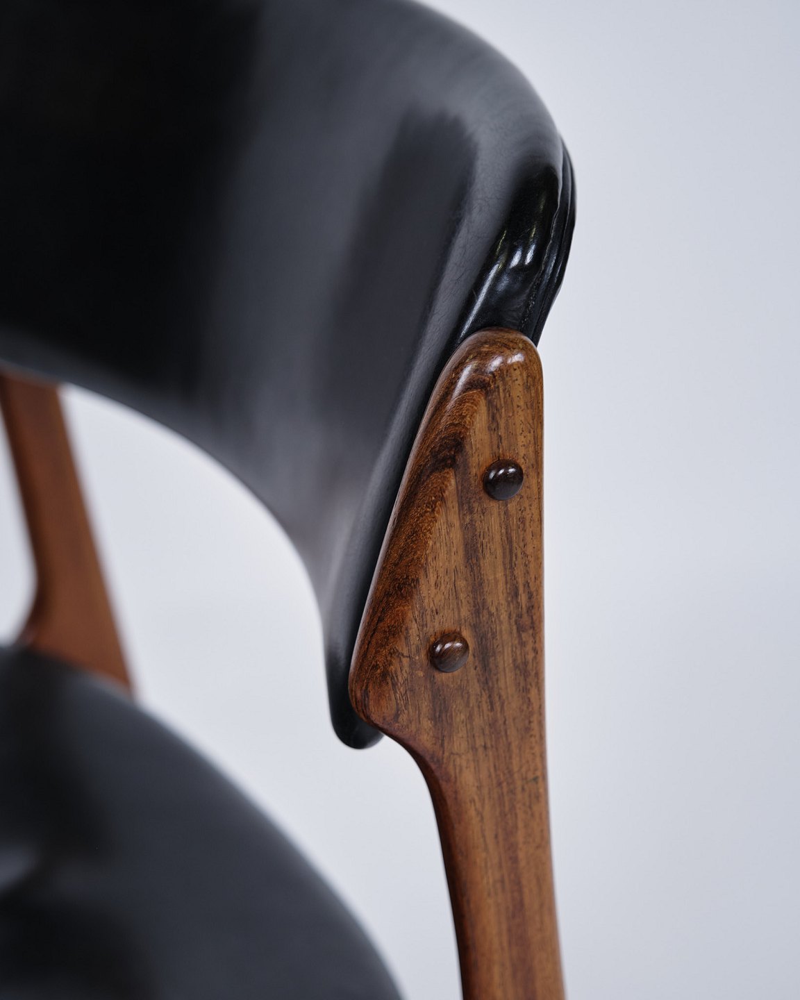 Sæt af seks Erik Buch spisebordsstole, model OD49. Palisander med sort læder. O.D. Møbler, 1950’erne.