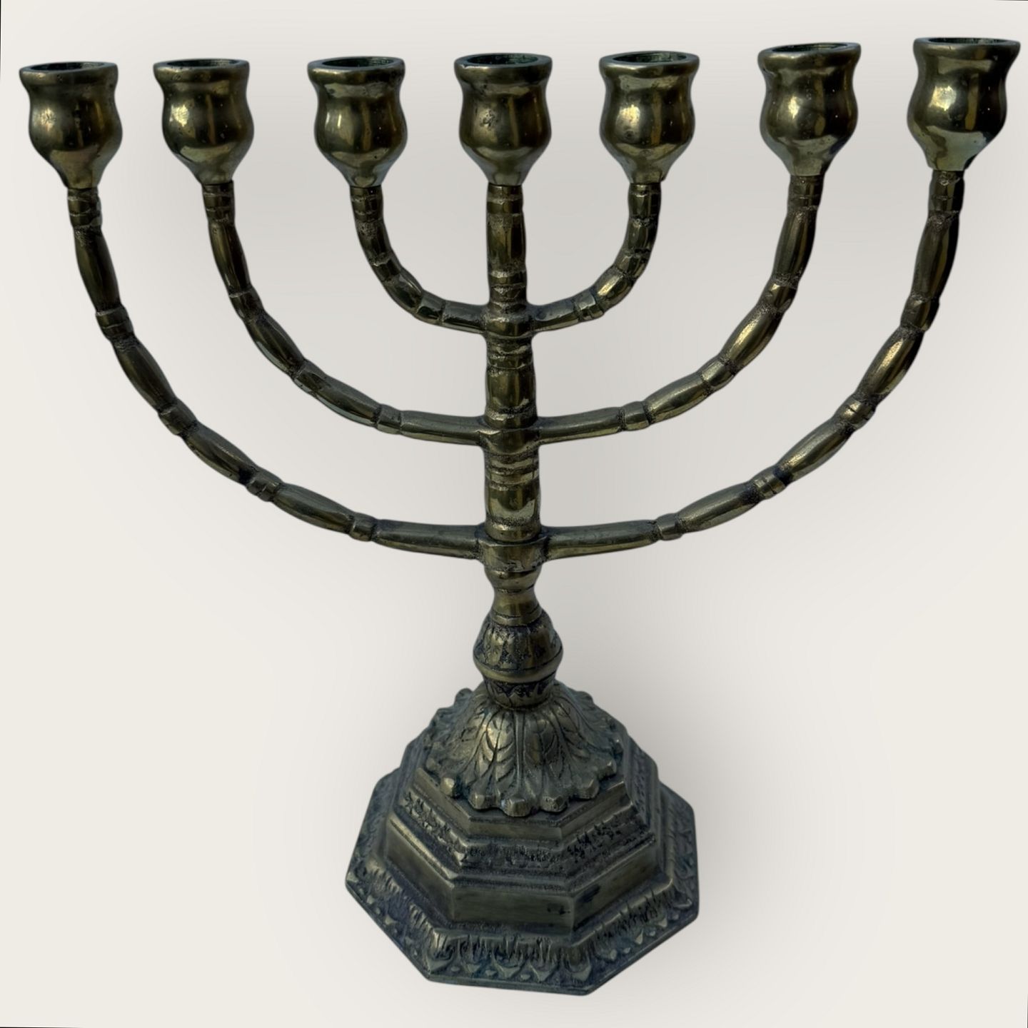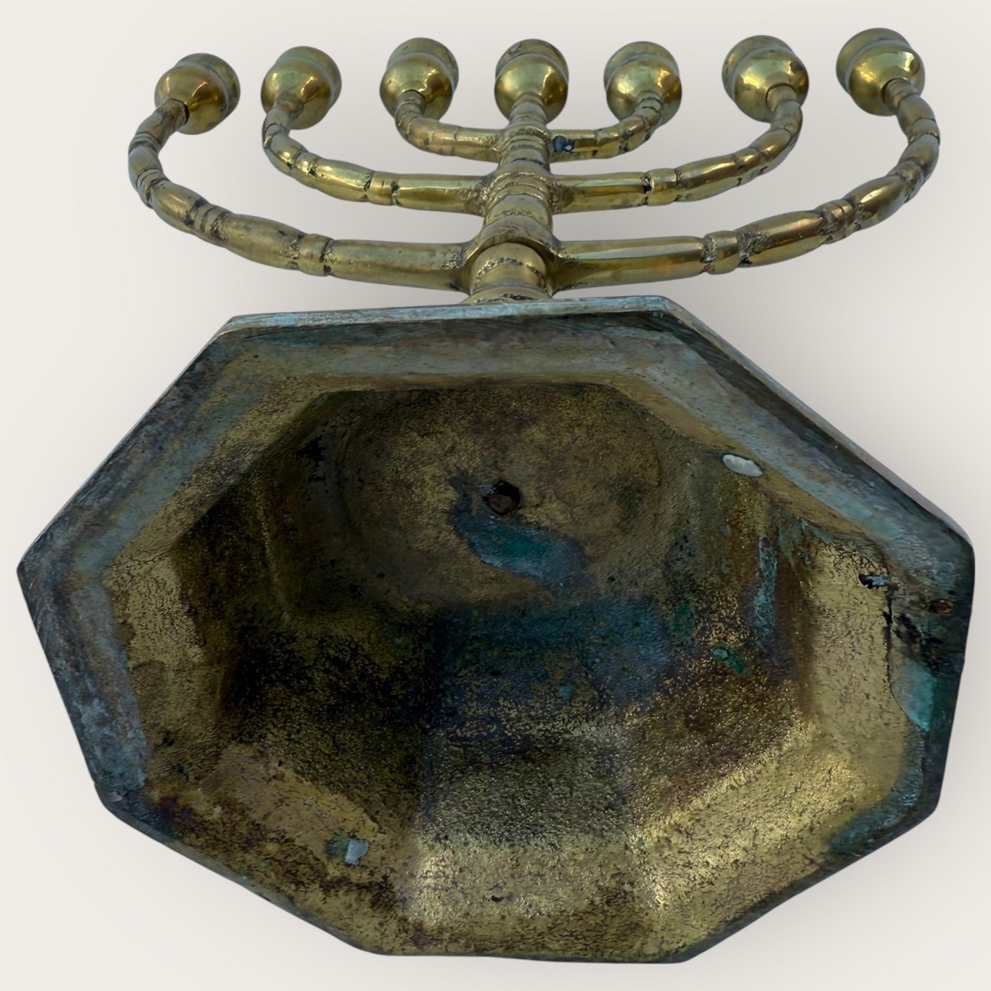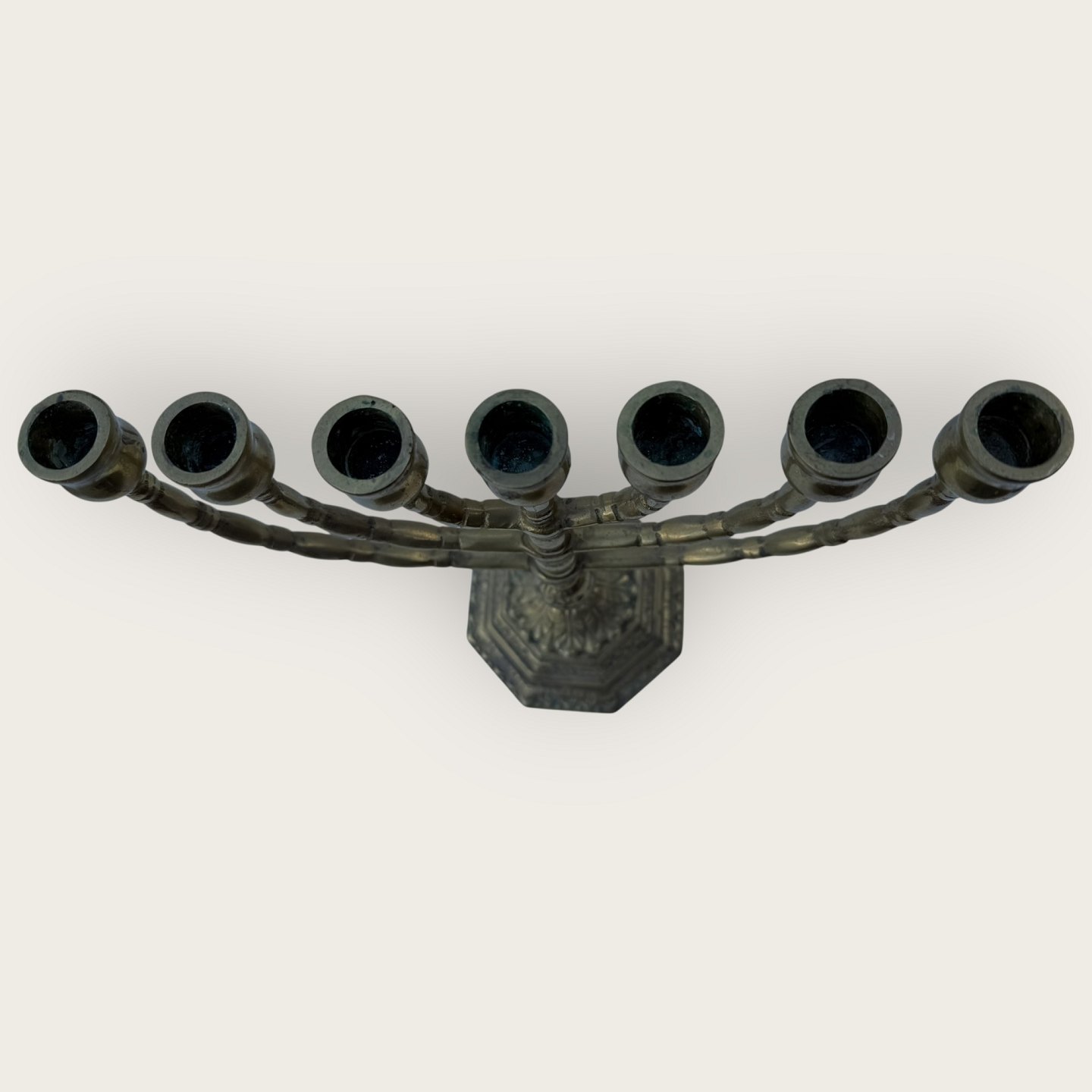 7 armet Messing lysestage, 27,5cm høj, 26,5cm bred *Pæn patineret stand*
