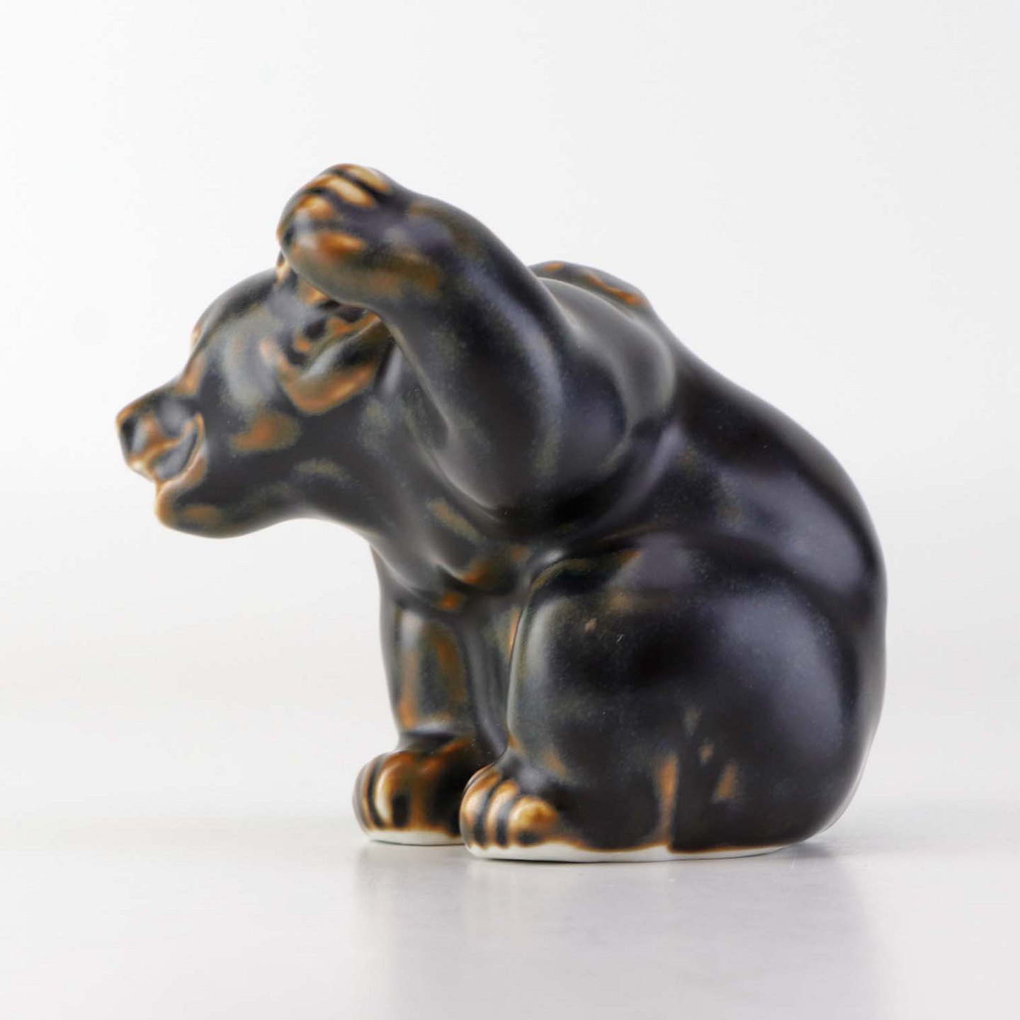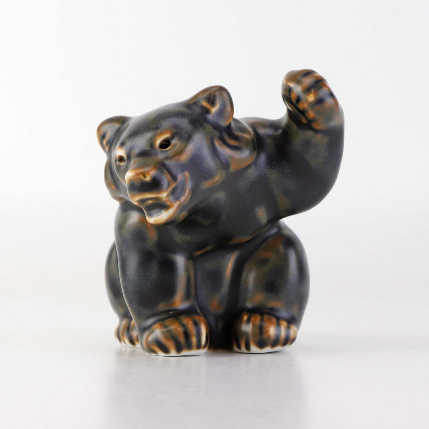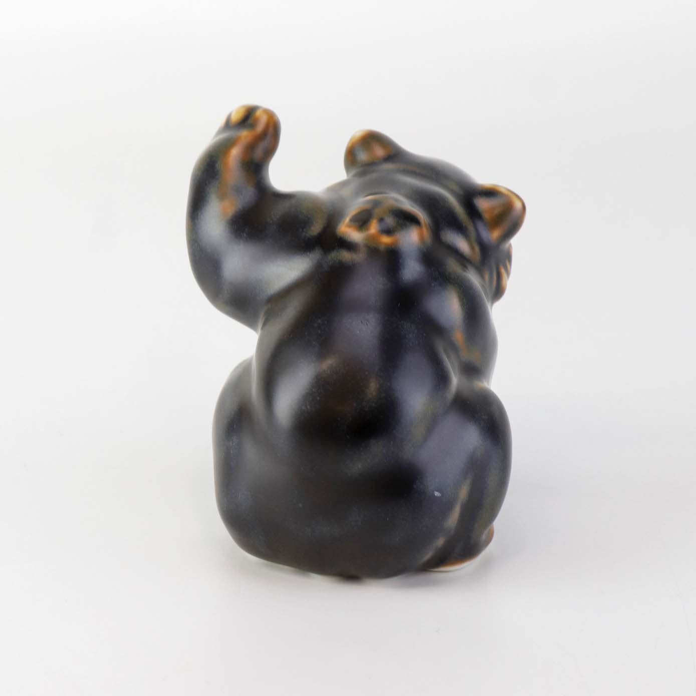 Figur i brunglaseret stentøj med motiv af siddende bjørneunge med løftet pote. Nr. 21433