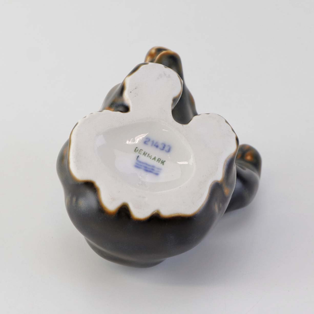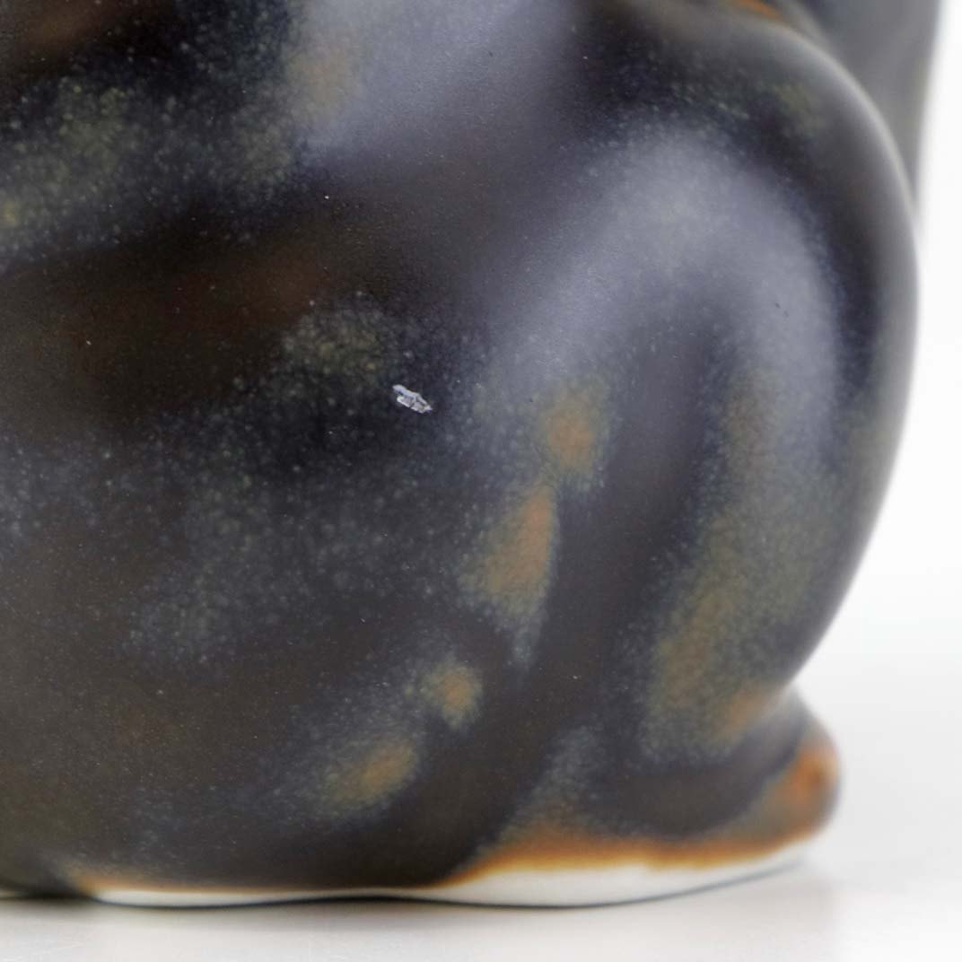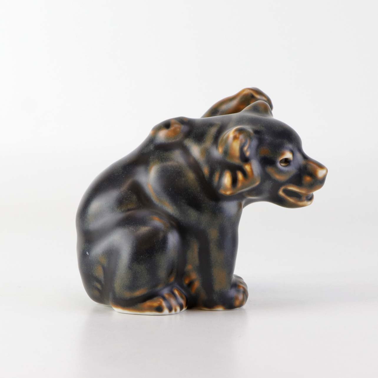 Figur i brunglaseret stentøj med motiv af siddende bjørneunge med løftet pote. Nr. 21433