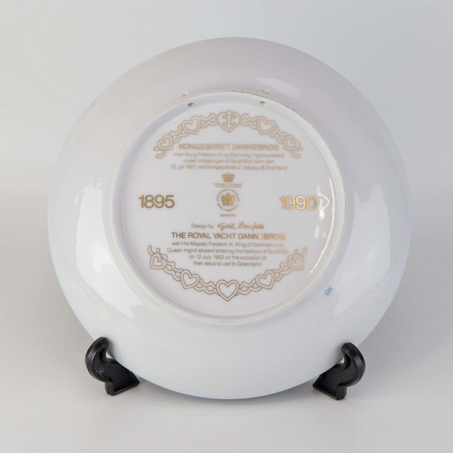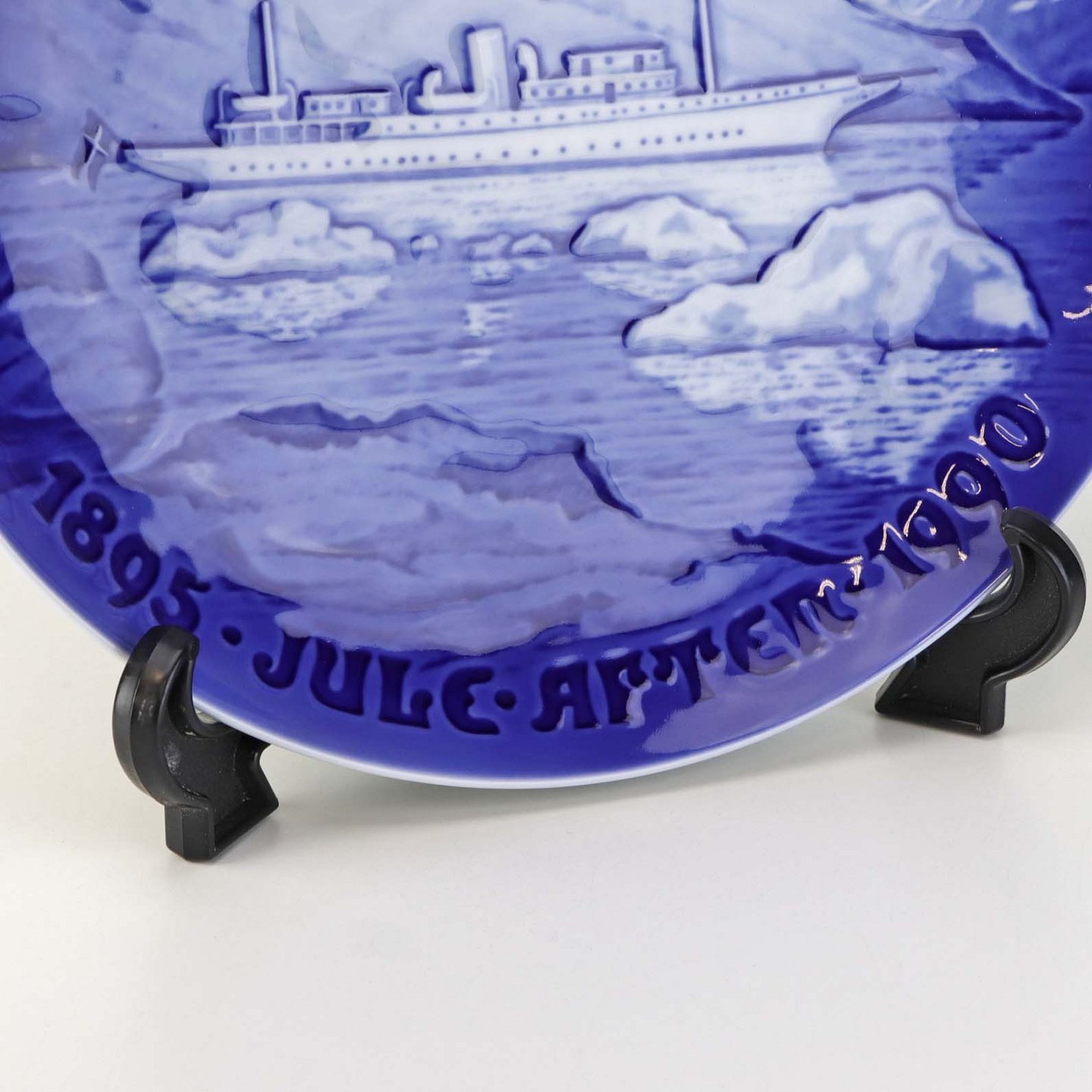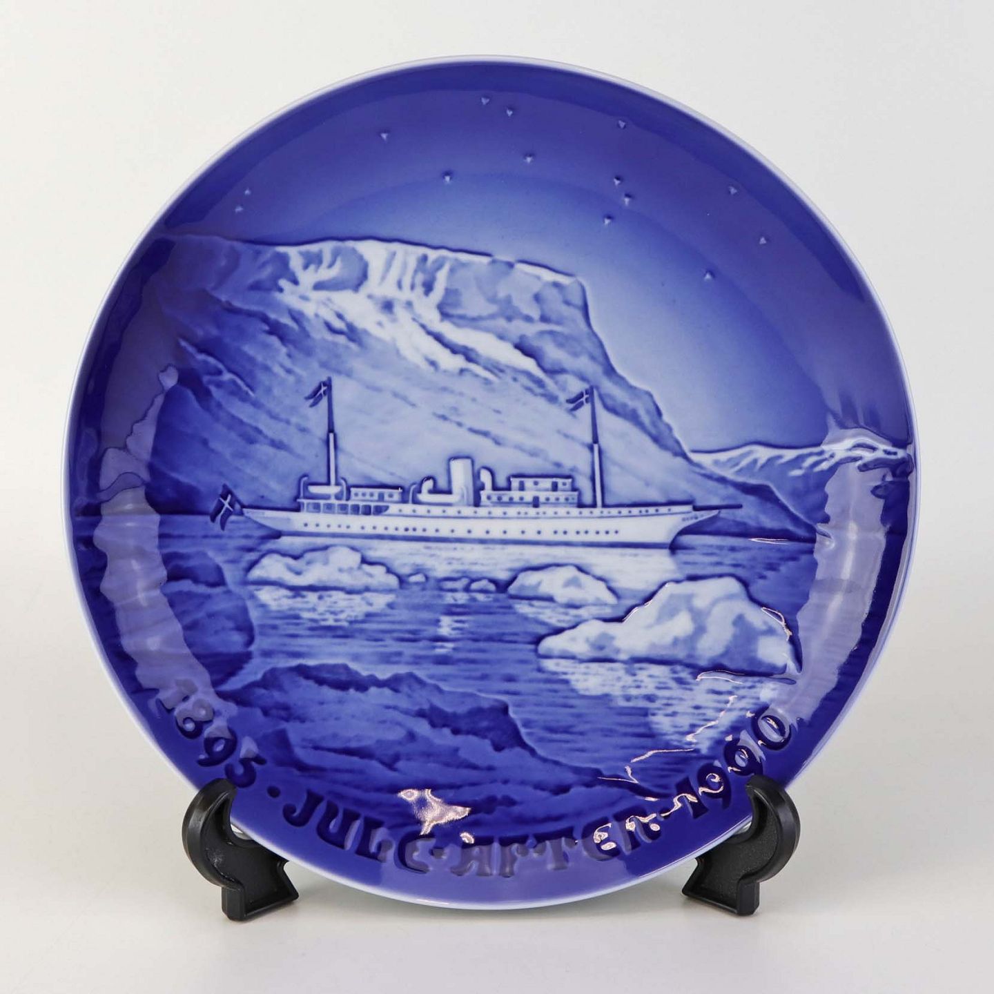 Jubilæumsplatte i porcelæn. Fremstillet i forbindelse med 95 års jubilæet for den første juleplatte fra år 1895. Plattens motiv viser Kongeskibet Dannebrog ved indsejlingen til Godthåbs havn ved Grønland. Teksten Juleaften 1895-1990.