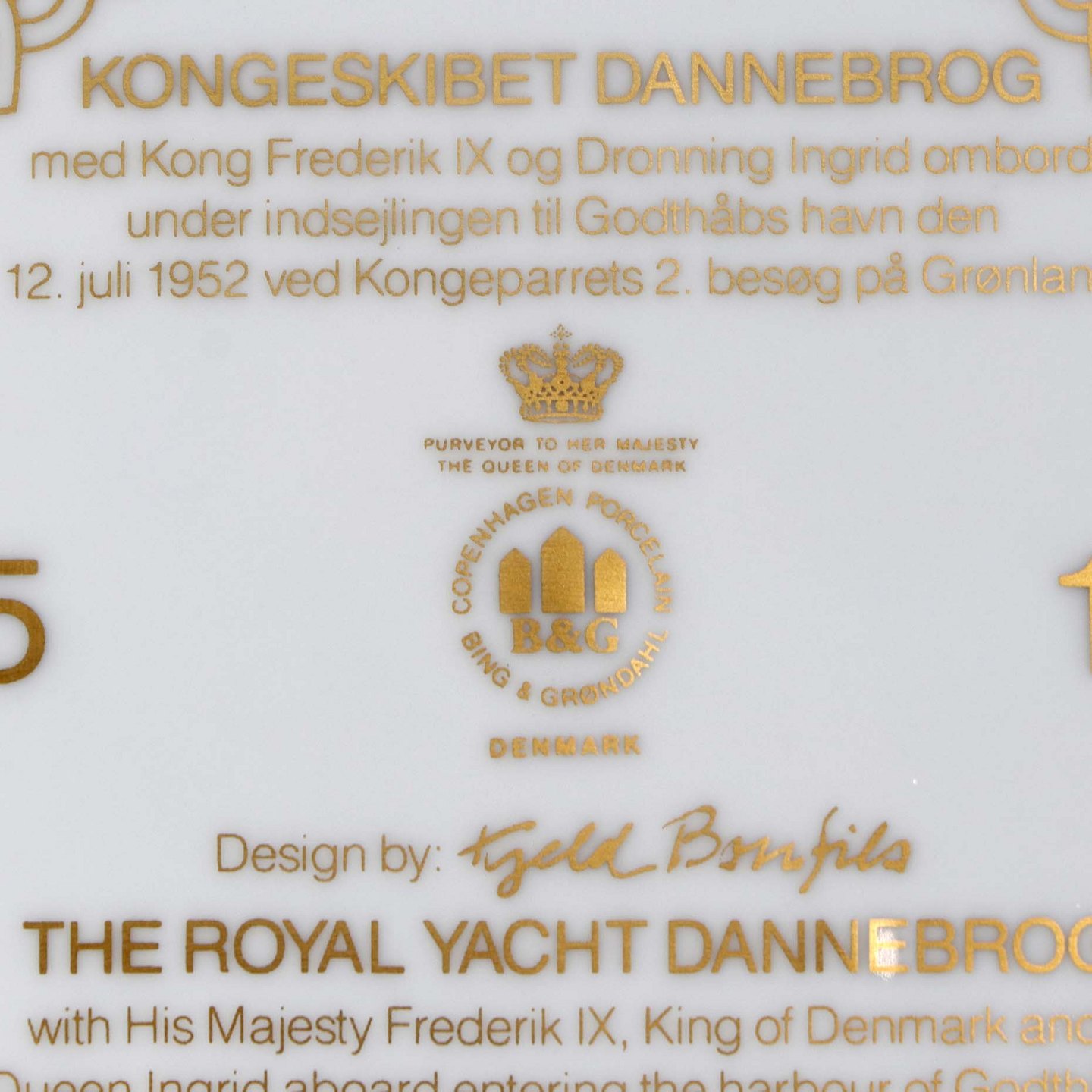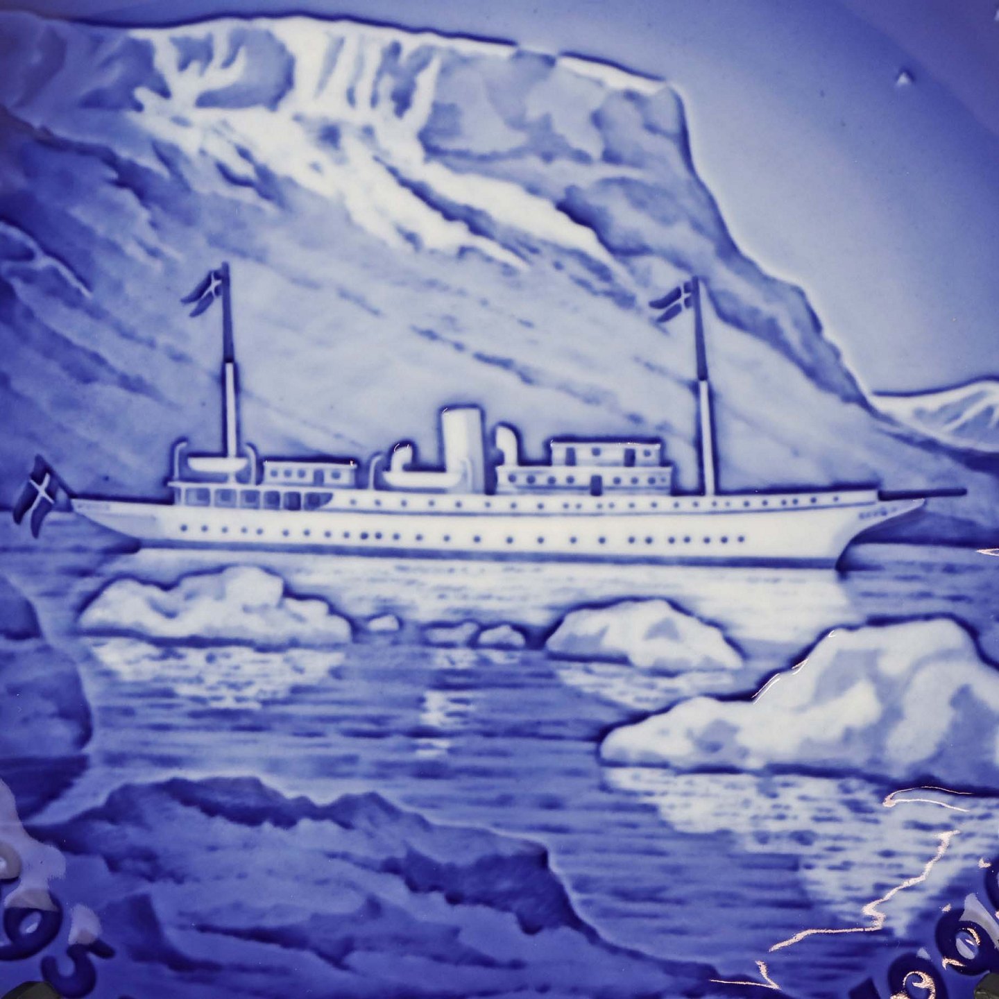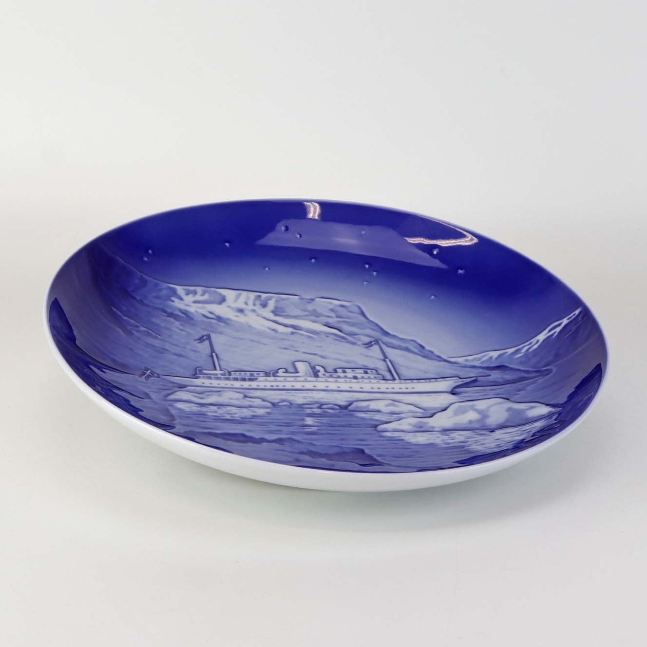 Jubilæumsplatte i porcelæn. Fremstillet i forbindelse med 95 års jubilæet for den første juleplatte fra år 1895. Plattens motiv viser Kongeskibet Dannebrog ved indsejlingen til Godthåbs havn ved Grønland. Teksten Juleaften 1895-1990.