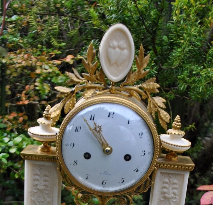 Fransk søjleur af forgyldt bronze og hvid marmor, empire, ca. 1830. Søjler og fod med dekoration. Urhus dekoreret med bladværk i forgyldt bronze. Øverst marmor plaquette med to hjerter i brand. Standart urværk med klokke. Skive i hvid emalje med araber tal. Med pendul med sol.H. cm. B.: 31 cm. D.: 12 cm. : 43