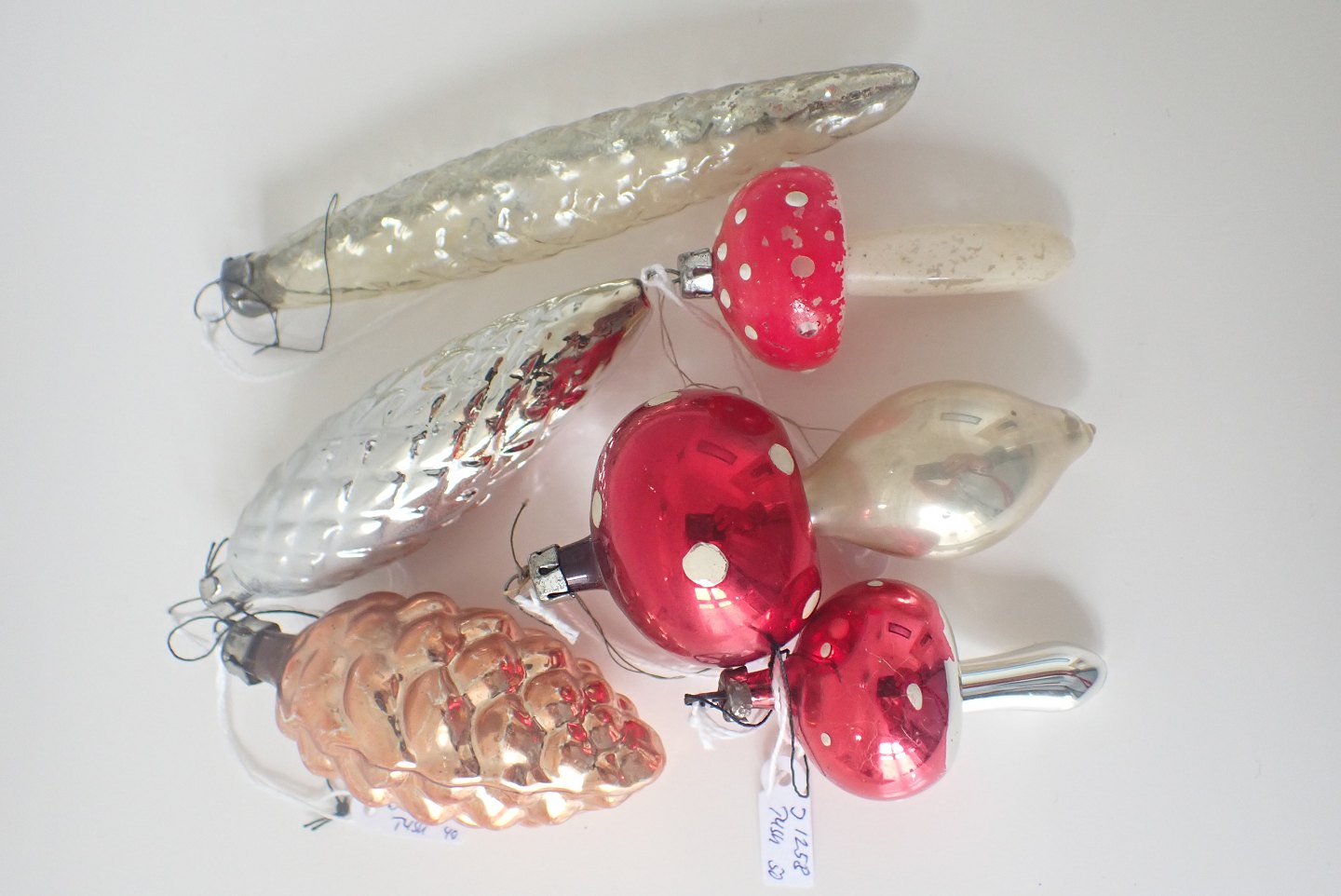 6 stk. glasjulepynt - naturfigurer - kogler og paddehatte. Sælges individuelt. Den store svampe er solgt.