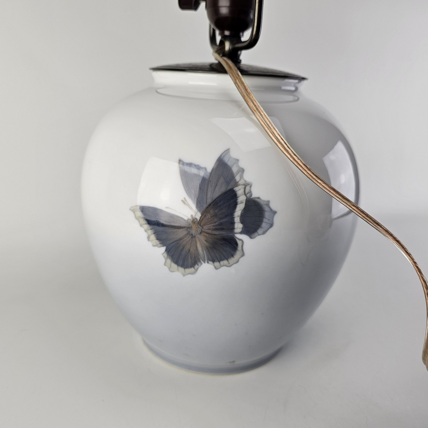 Bordlampe i hvidt porcelæn med dekoration af blomster og sommerfugle, og fatning i sort metal