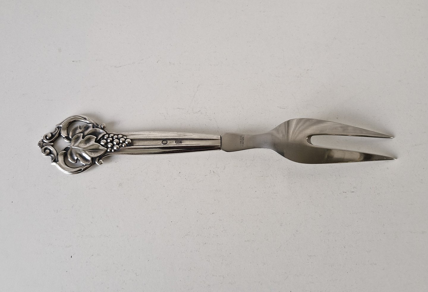 Stegegaffel i sølv og stål dekoreret med drueklase