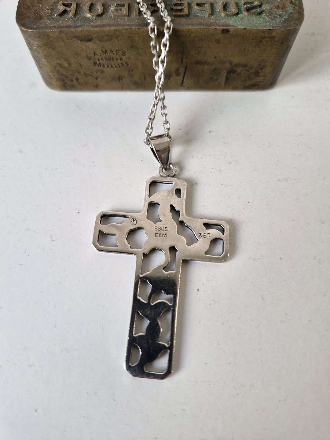 Sølvhalskæde med stort sølv kors dekoreret med blomster af Eiler & Marløe