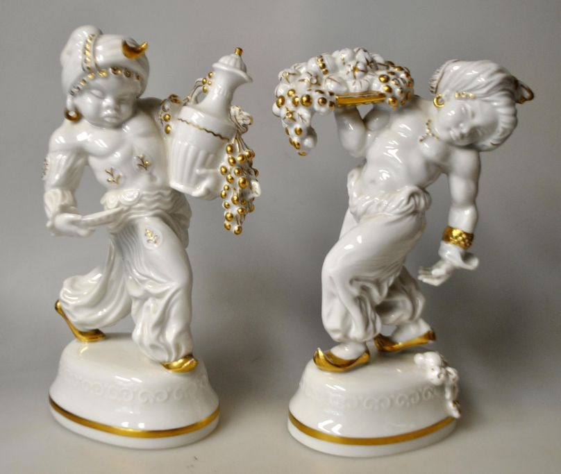 Tutter, Karl (1883 - 1969) Tyskland: To figurer af blanc de chine med guldstafferinger i form af mandefigurer bærende på hhv. et frugtfad og en vinkande. Betegnet K. Tutter. Hutschenreuther, Selb-Bavaria, Abteilung für Kunst. H. 21 og 22.