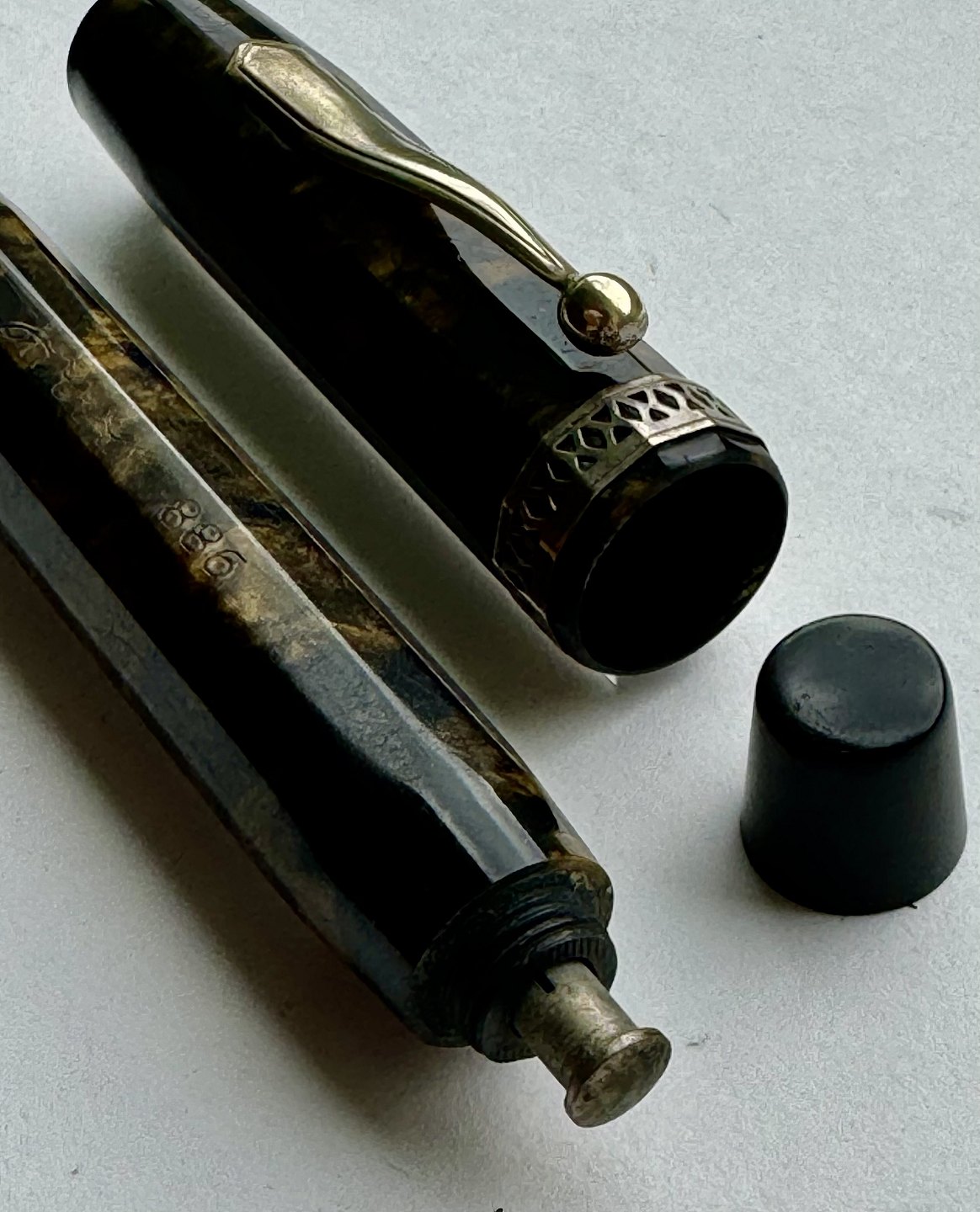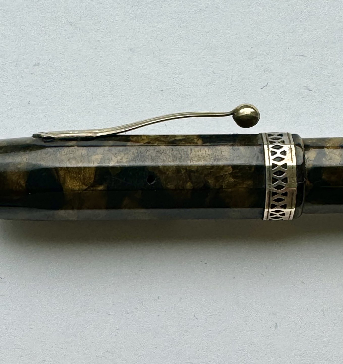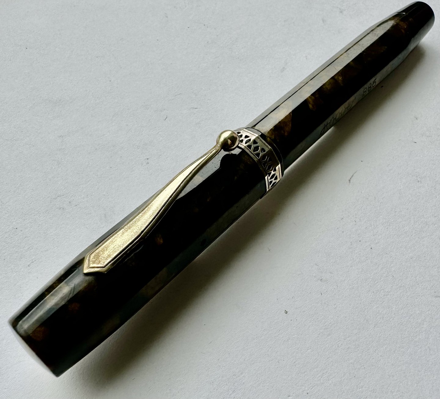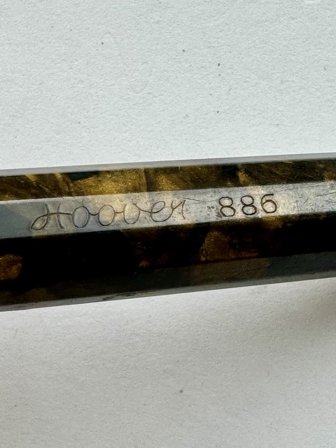 ART DECO STIL: 12-kantet brun/sort marmoreret Hoover 886 fyldepen fra 1930’erne. Fremstår i god stand uden skader eller reparationer. Alle dele originale PÅ NÆR en 14 karat guldspids fra Miller. Fungerer ikke. Der skal isættes ny gummisæk før end den er funktionsdygtig igen. Ny gummisæk isættes mod en betaling på kr. 250,- Denne fyldepen er 13 cm lang.