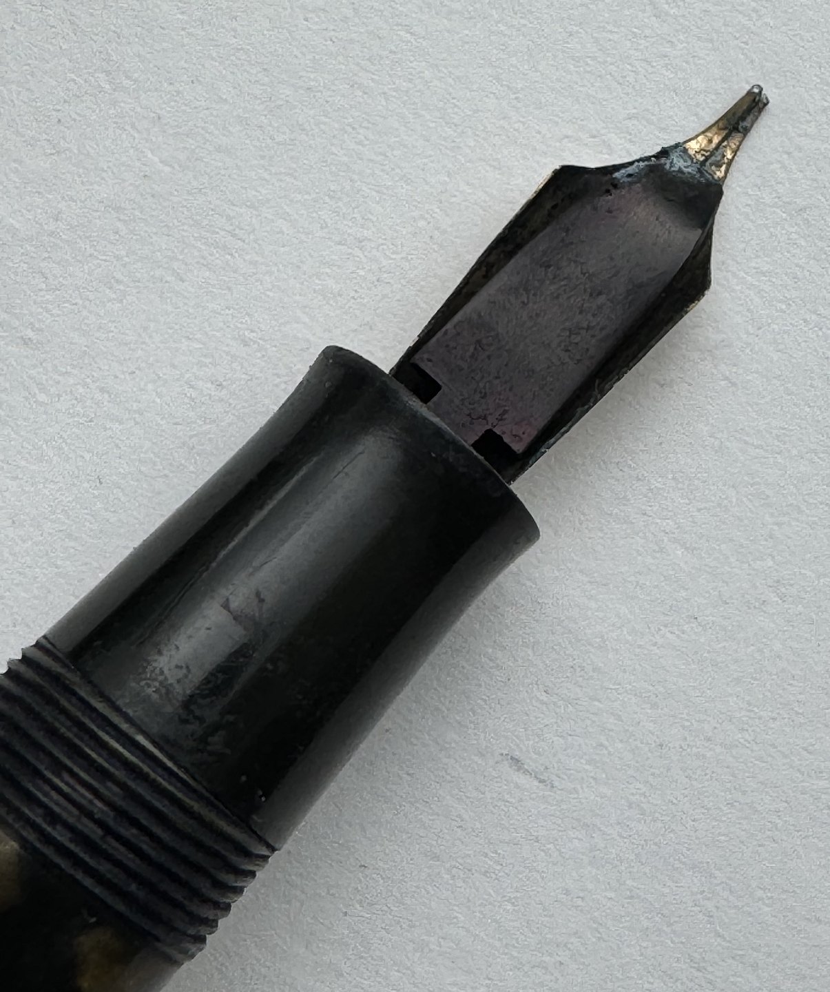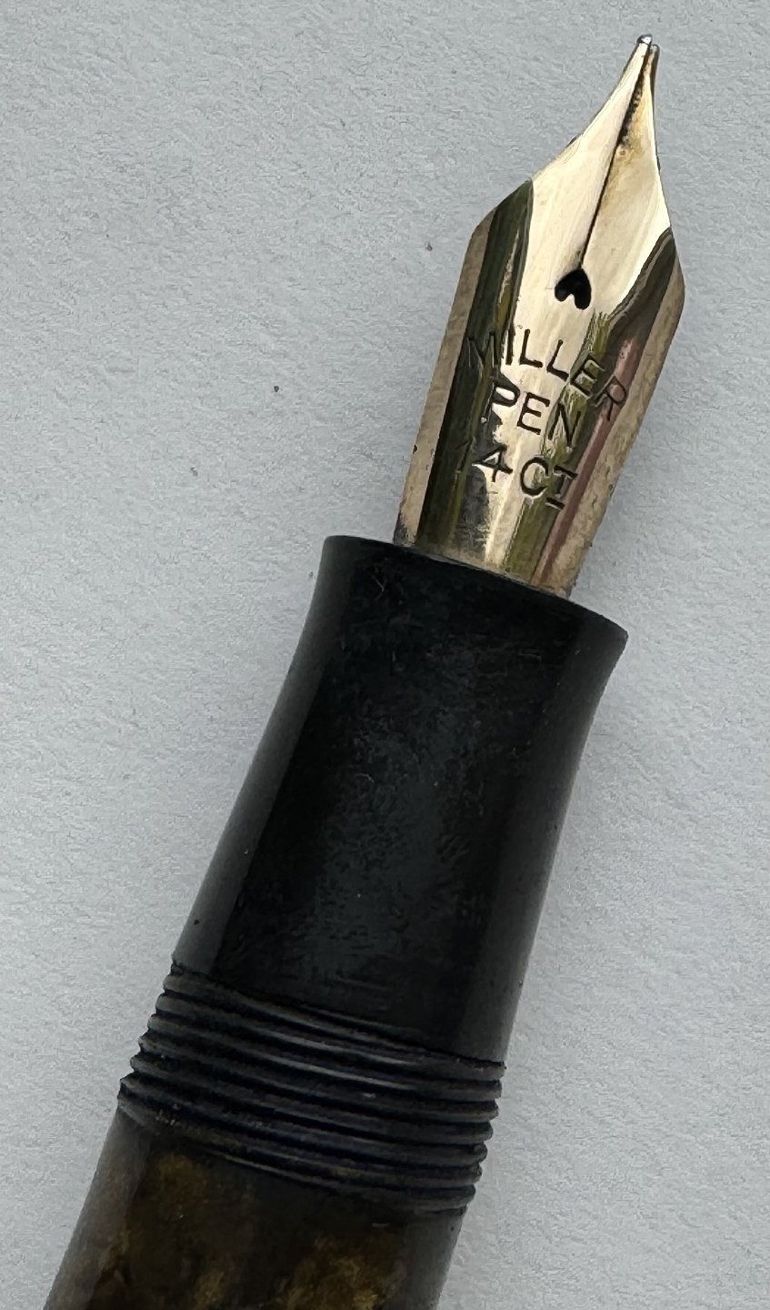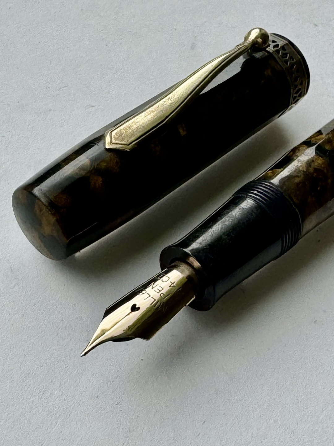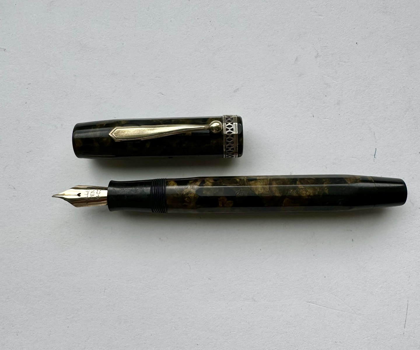 ART DECO STIL: 12-kantet brun/sort marmoreret Hoover 886 fyldepen fra 1930’erne. Fremstår i god stand uden skader eller reparationer. Alle dele originale PÅ NÆR en 14 karat guldspids fra Miller. Fungerer ikke. Der skal isættes ny gummisæk før end den er funktionsdygtig igen. Ny gummisæk isættes mod en betaling på kr. 250,- Denne fyldepen er 13 cm lang.