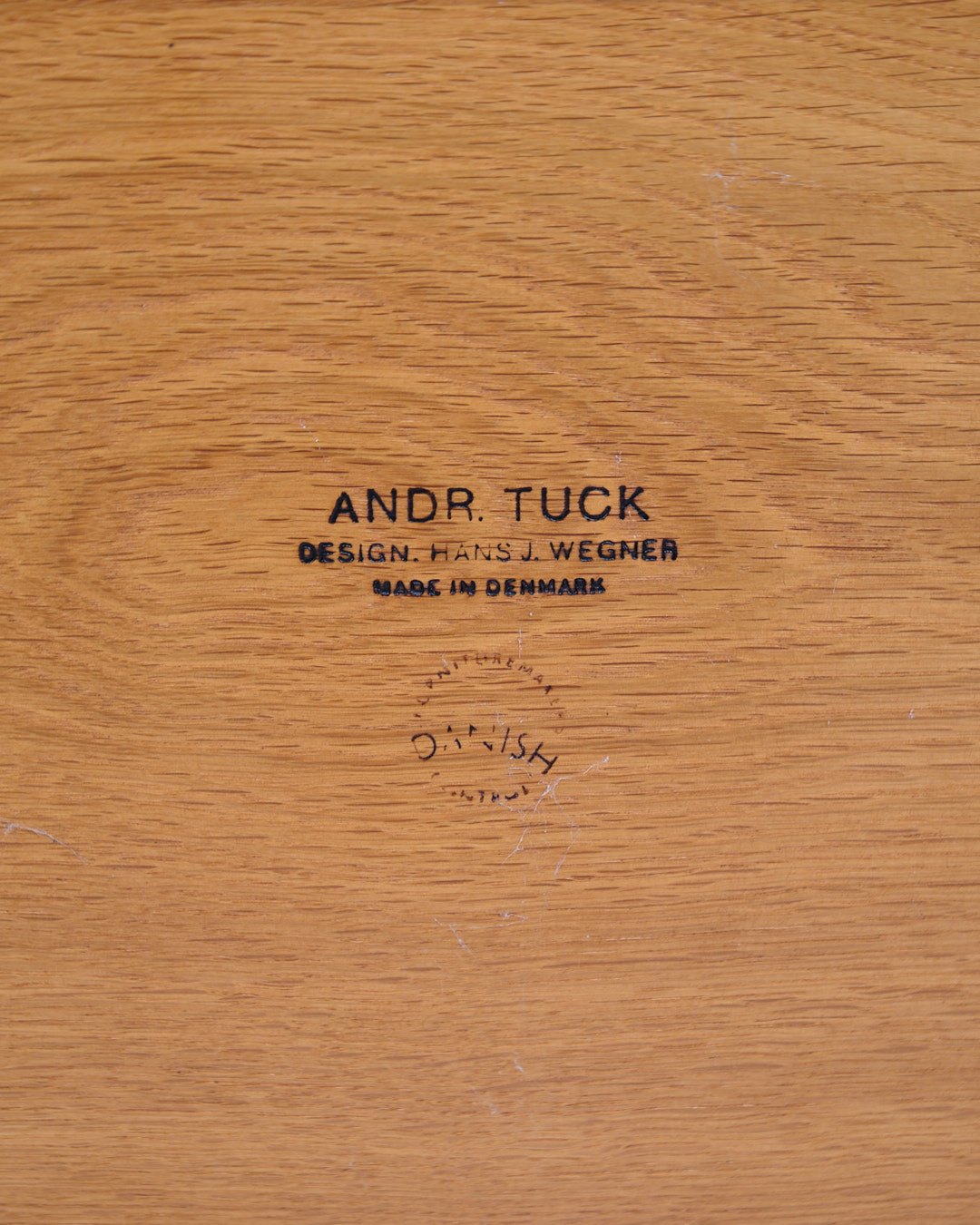 Sybord, model AT-33, designet af Hans J. Wegner og produceret af Andreas Tuck i 1950’erne. Bordet er udført i sæbebehandlet egetræ og indrettet med en praktisk hylde. Bordpladen kan udvides fra 64,5 cm til 118,5 cm, hvilket gør det både fleksibelt og funktionelt.