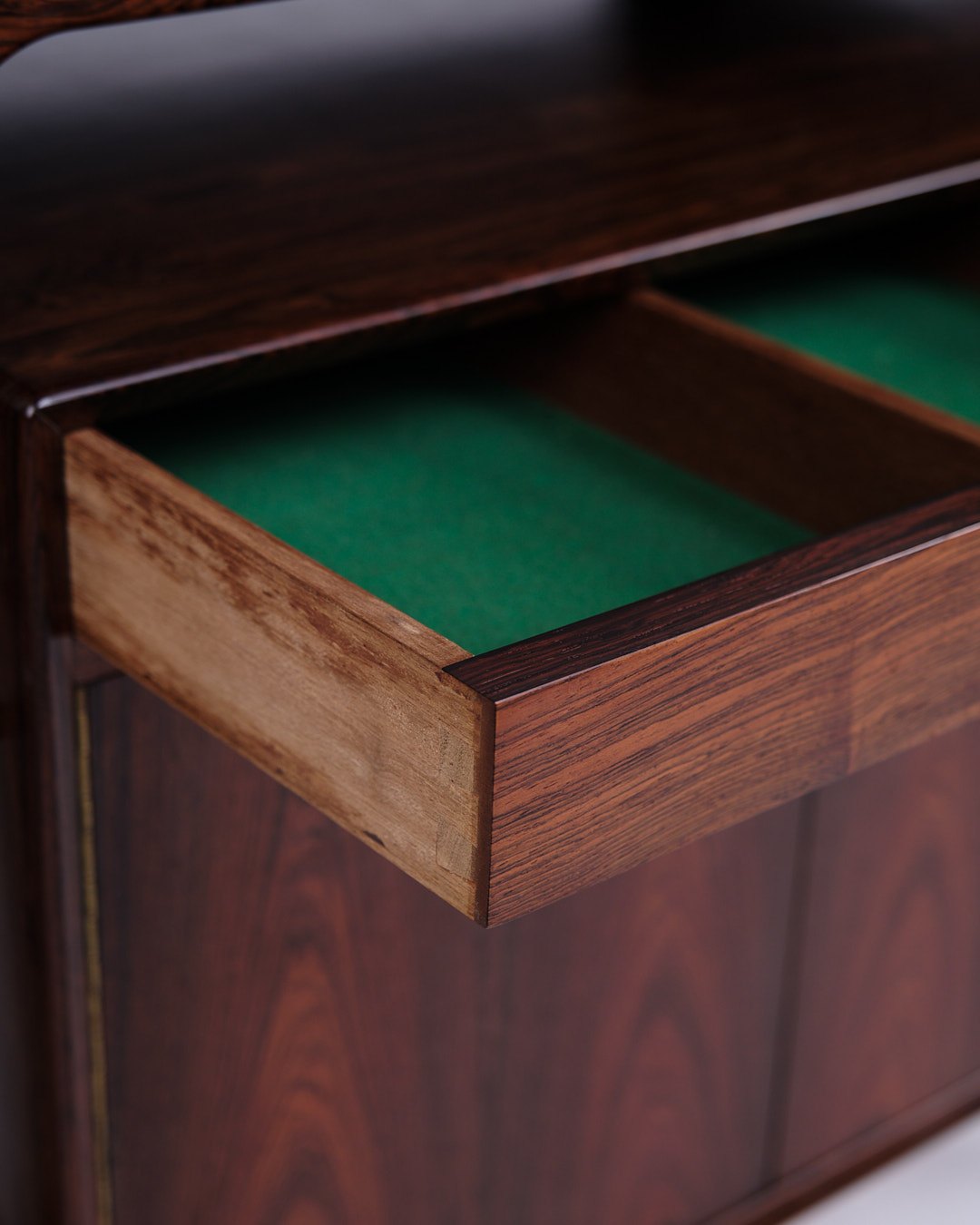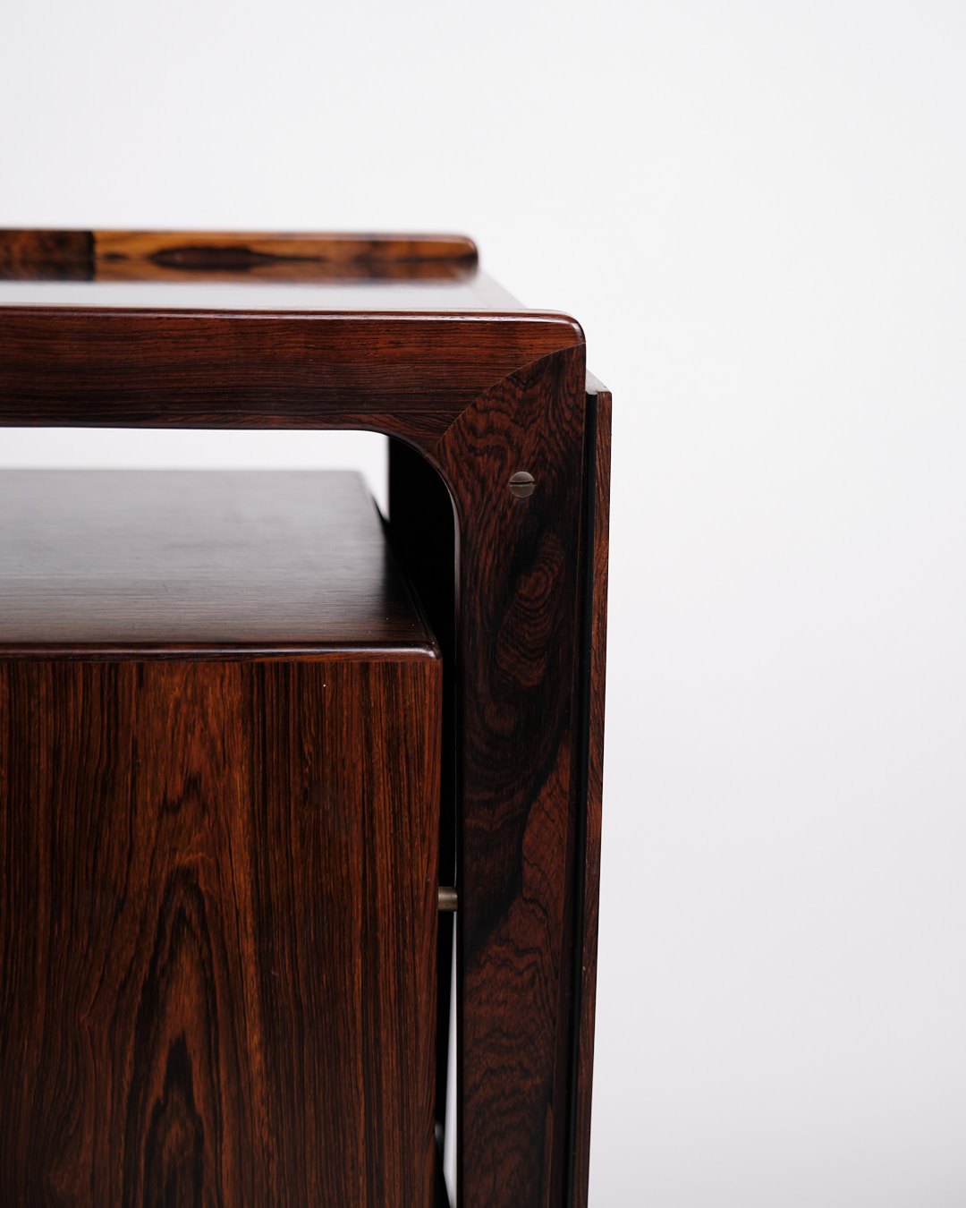 barskab fra Dyrlund, udført i palisander med sort formika og håndtag i massiv palisander. Skabet er monteret på hjul for nem mobilitet og har en foldbar plade, der kan udvide bredden fra 86 cm til 142 cm. Kombinationen af eksklusive materialer og funktionelt design gør dette barskab til et klassisk eksempel på dansk møbelhåndværk fra 1960’erne.