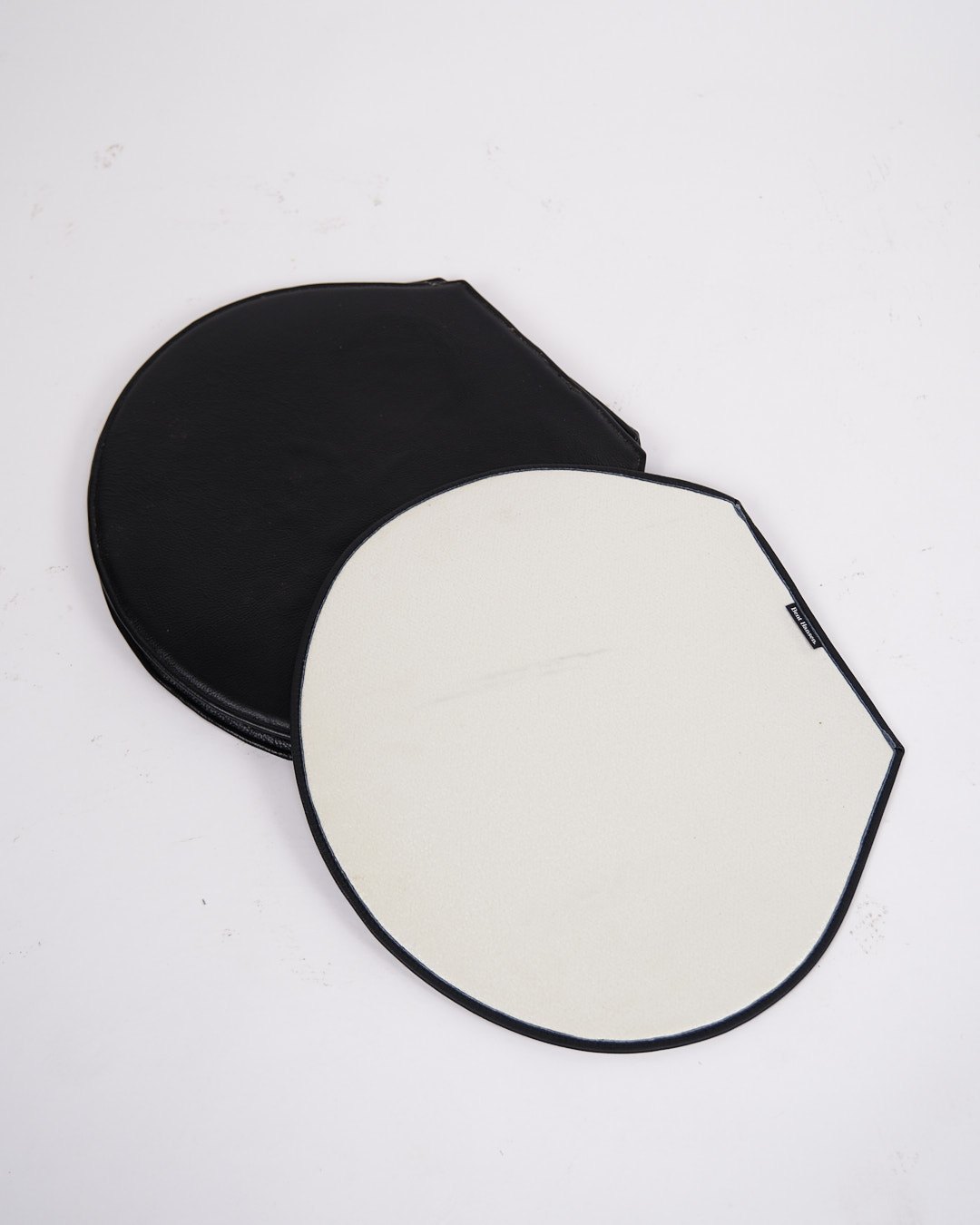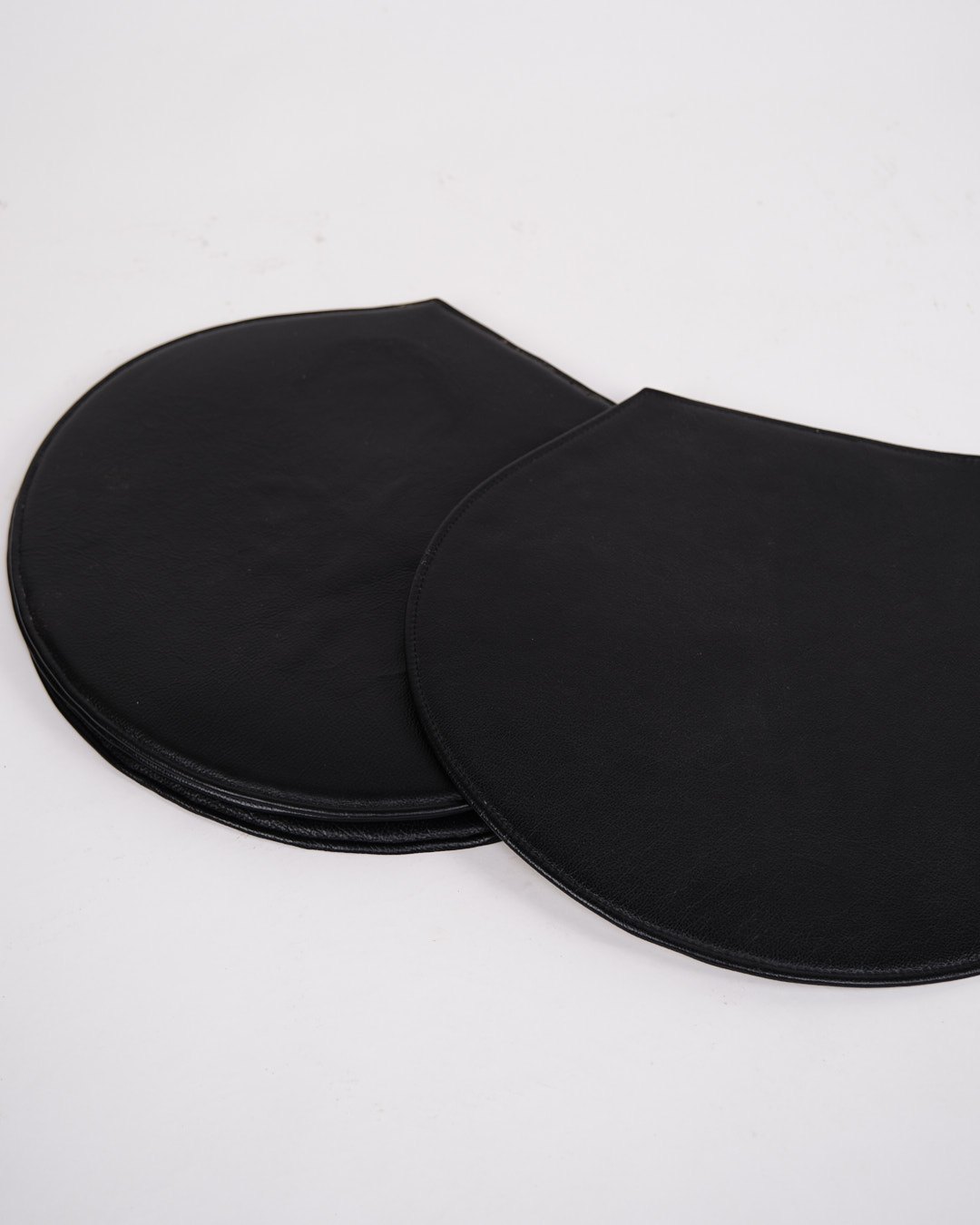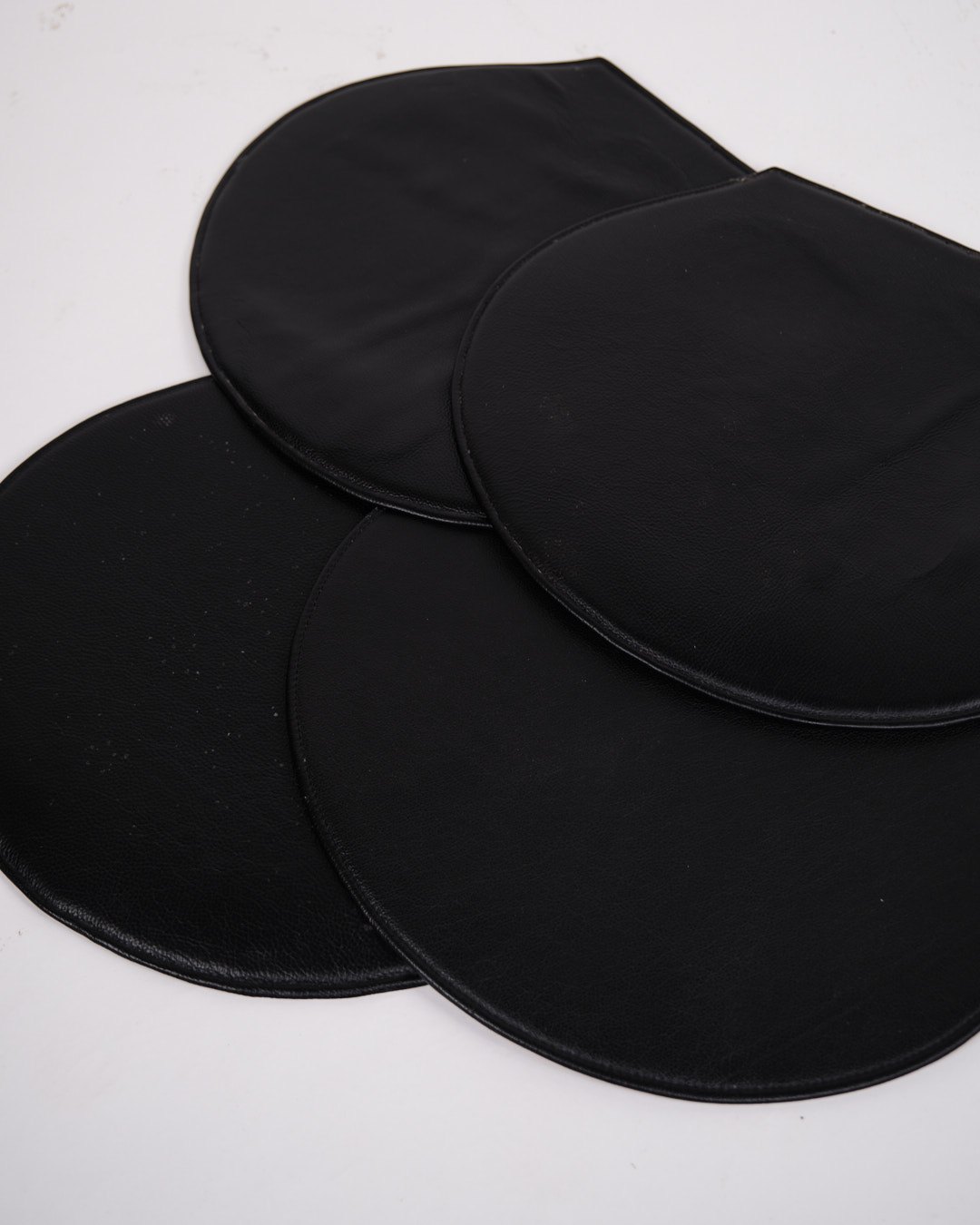 Sæt af fire sortlæderhynder til Arne Jacobsen stol model 3107. Pasform design. Komfortabelt og stilfuldt tilbehør til dansk designklassiker.
