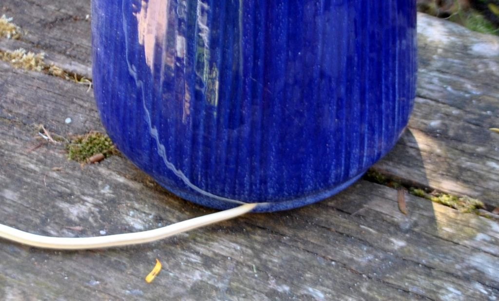 Keramisk bordlampe med blå glasur, 20. årh. Danmark. Med kanneleringer. Ustempelet. Højde uden el montering: 37 cm. Med elmontering: 58 cm. I lampe boret hul til ledning.