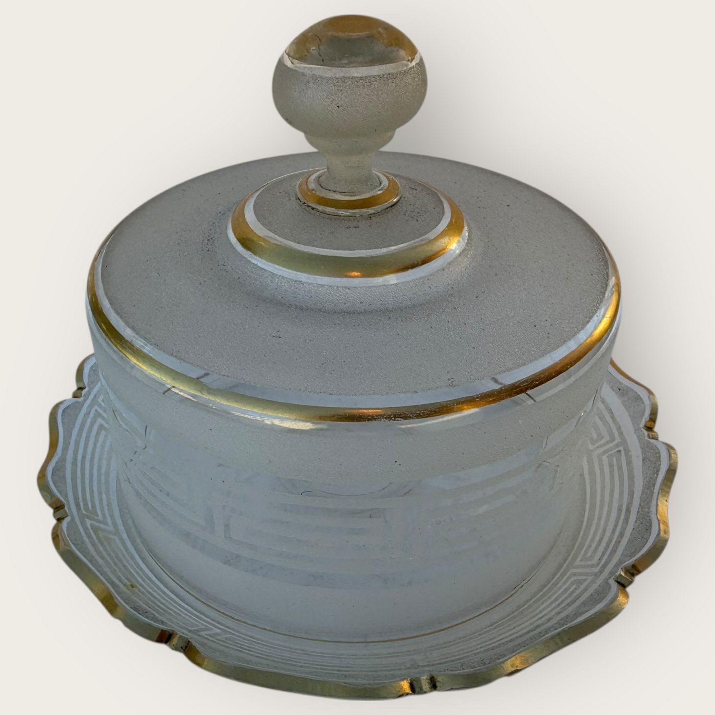Klokke til madvarer i frostet glas med guldbemaling, lidt patinering på guldet ellers fin stand, diameter 23cm, højde 15cm