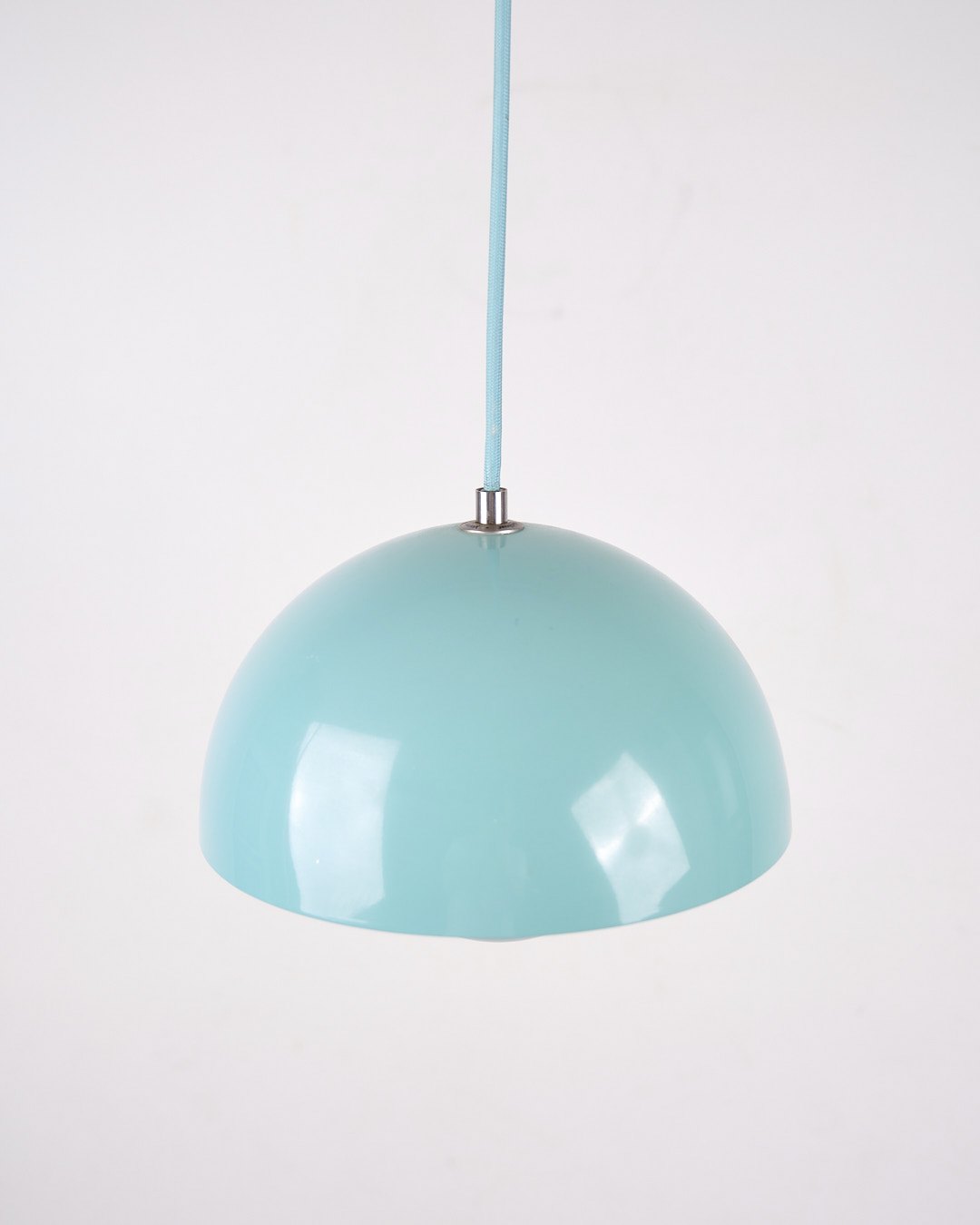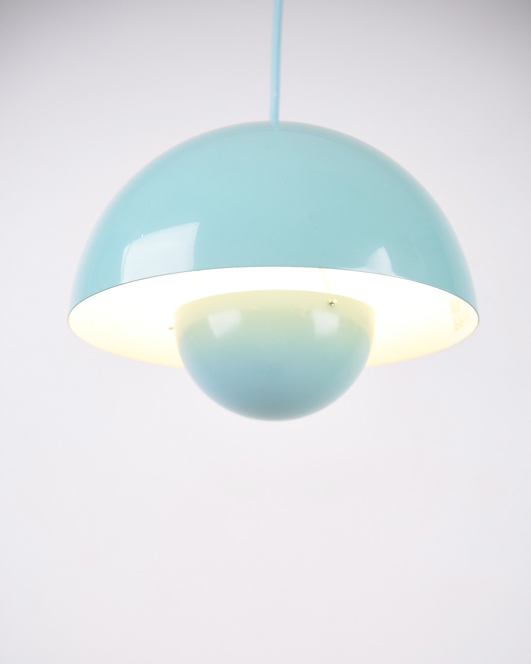 Flowerpot pendel, model VP1, designet af Verner Panton i 1968 og produceret af &Tradition. Lampen er udført i babyblå lakeret metal med det ikoniske dobbeltskærmsdesign.