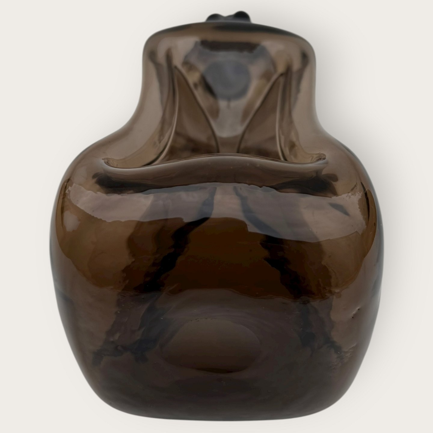Holmegaard, klukflaske i brunt glas og med krone prop, Lille smule urenhed indvendigt i bunden ellers pæn stand, Mål: 26x10x10cm