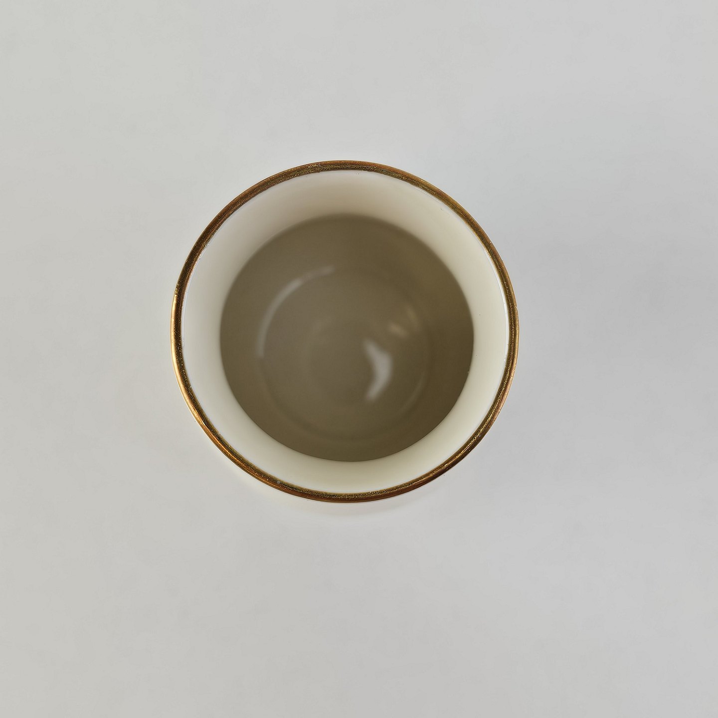 Kaktus er cremefarvet porcelæn i skælform, dekoreret med kaktusblomster og guldkant