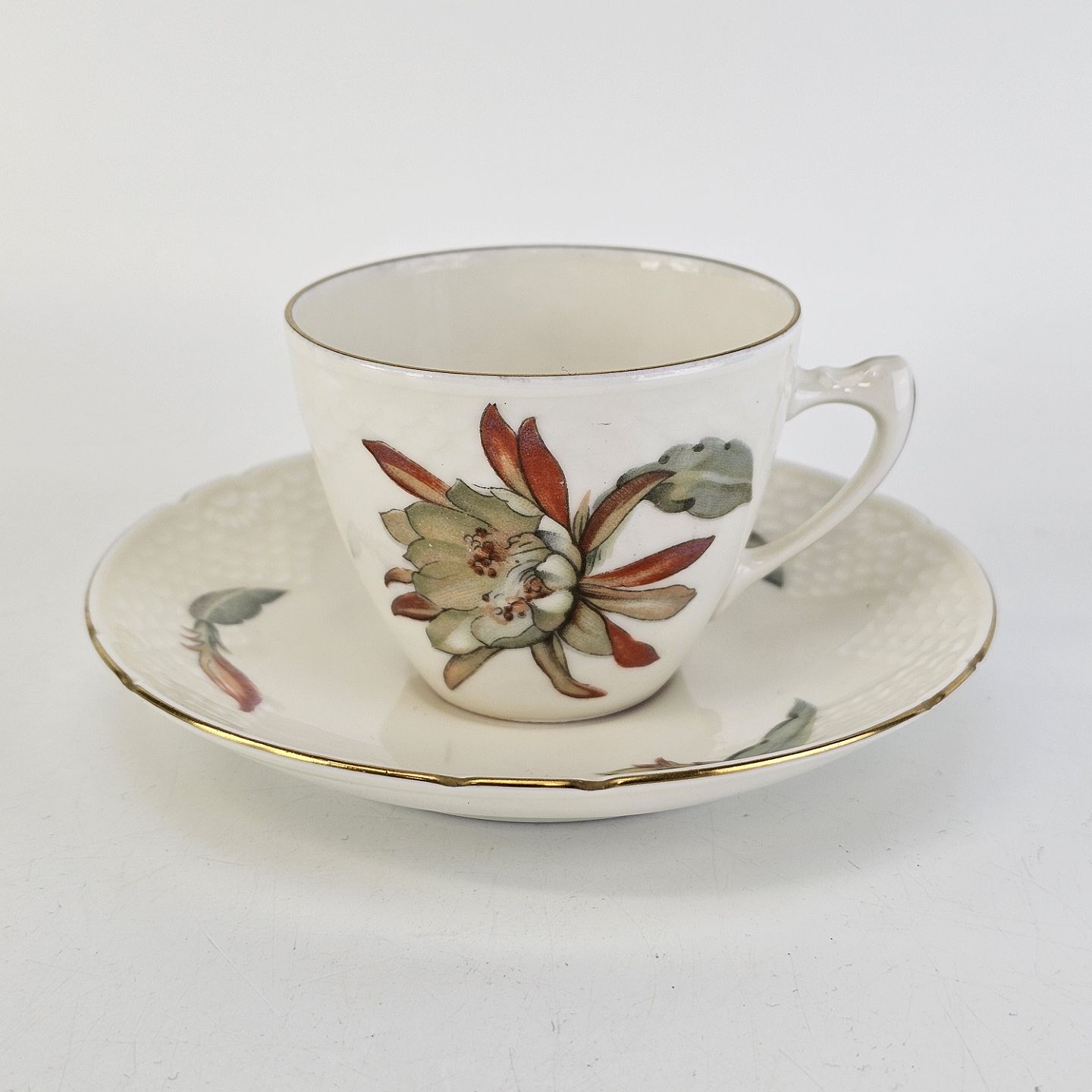 Kaktus er cremefarvet porcelæn i skælform, dekoreret med kaktusblomster og guldkant