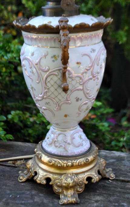 Petroleumslampe i porcelæn og glas, omgjort til el, 19. årh. Tyskland.