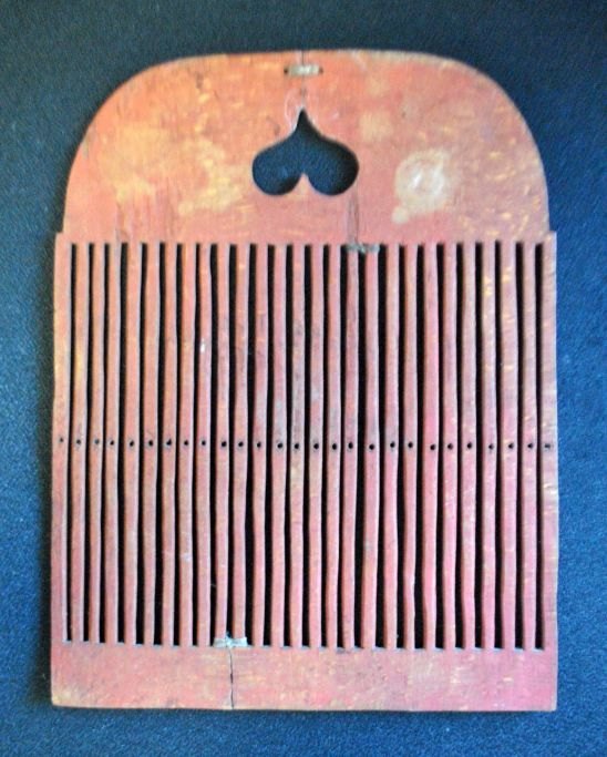 Antik dansk væve spjæld i rødmalet bemalet bøg, 1844.  Med karvsnit. Med udskåret hjerte og intivalerne: A.K.S / R.D.J. 27,5 x 21.5 cm.